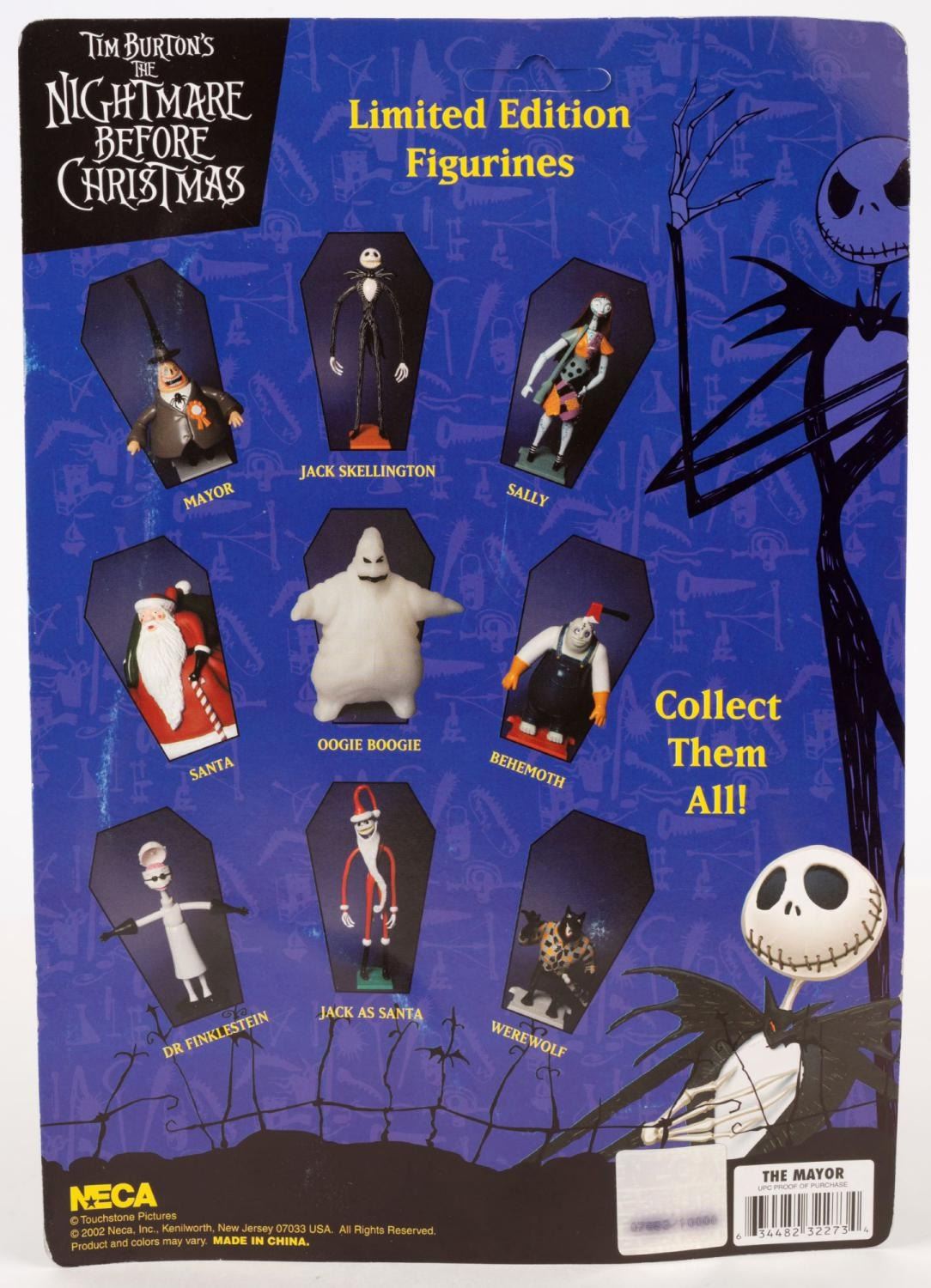 (NECA, 1990s-2000s) An action figure of the Mayor of Halloweentown from "Tim Burton's The Nightmare Before Christmas." The figurine was released in an unnumbered edition of 10000 and comes with a gravestone and megaphone accessory. The 3.25" x 3.5" and 7" tall figurine is in fine condition sealed within the original 7.5" x 3" x 11" packaging.