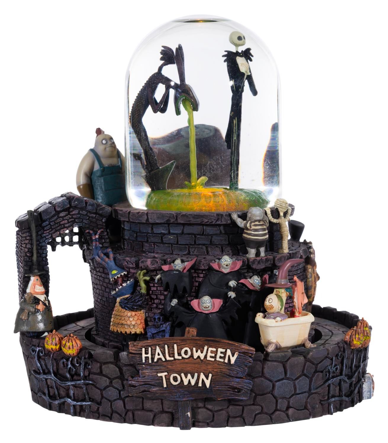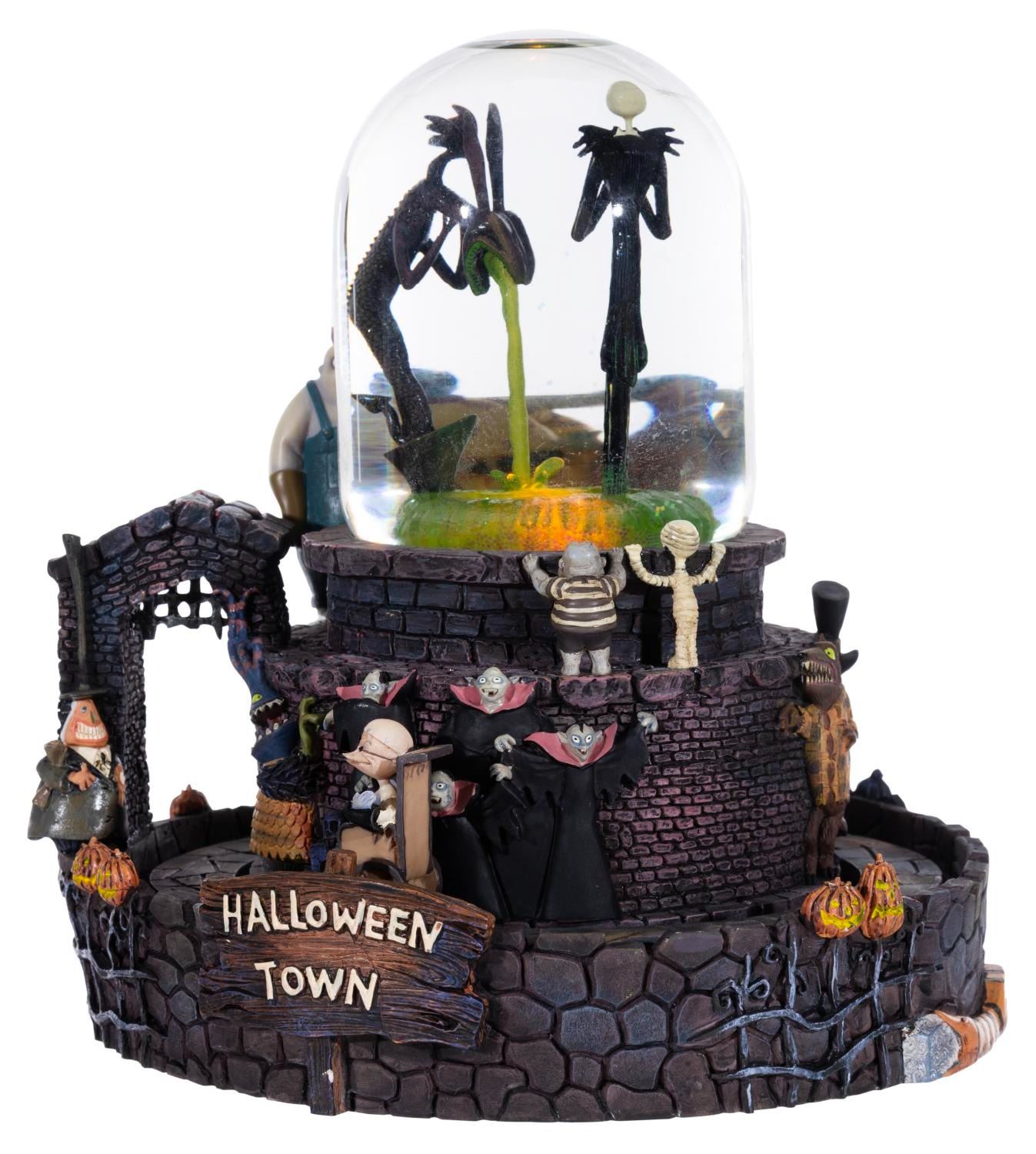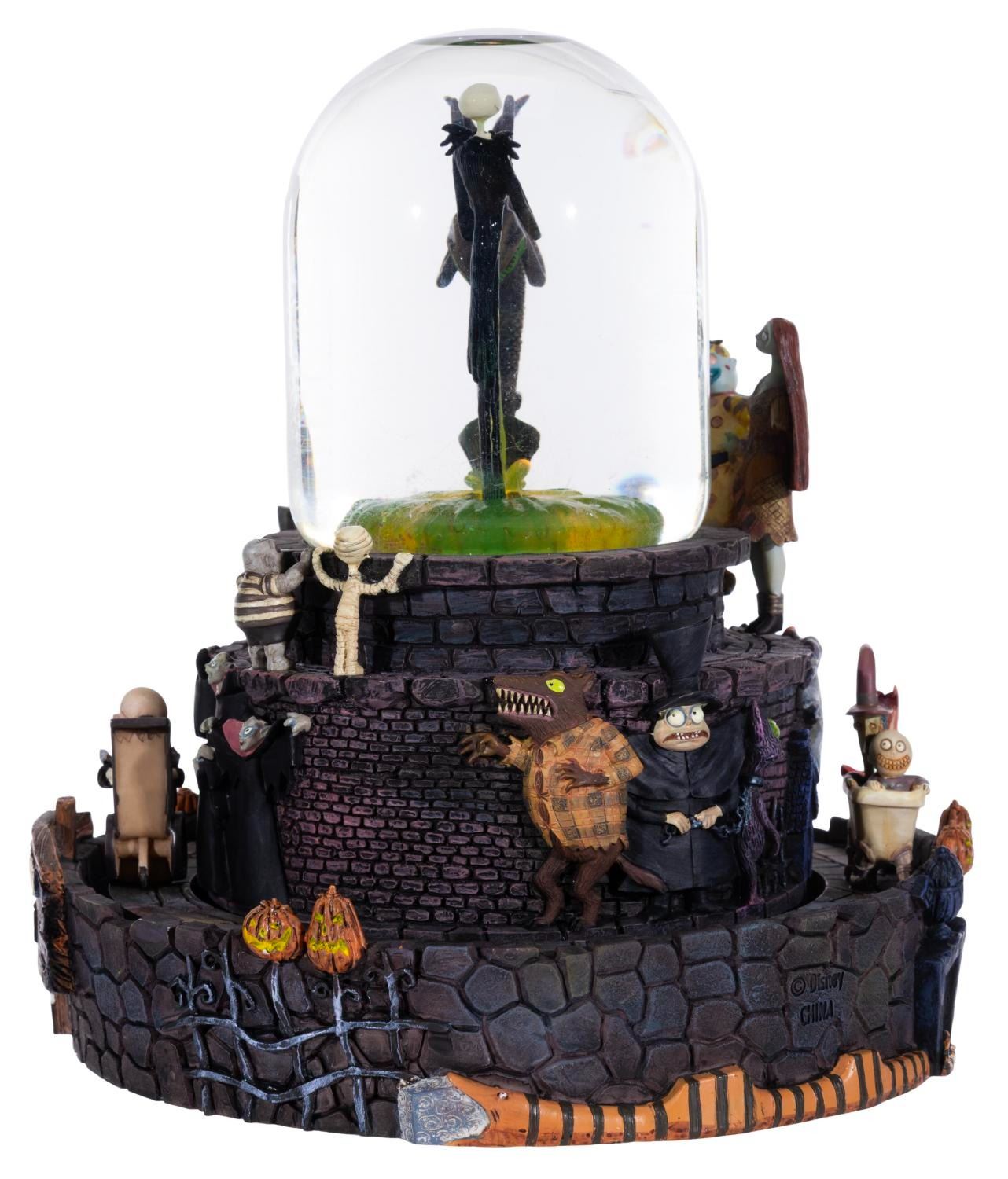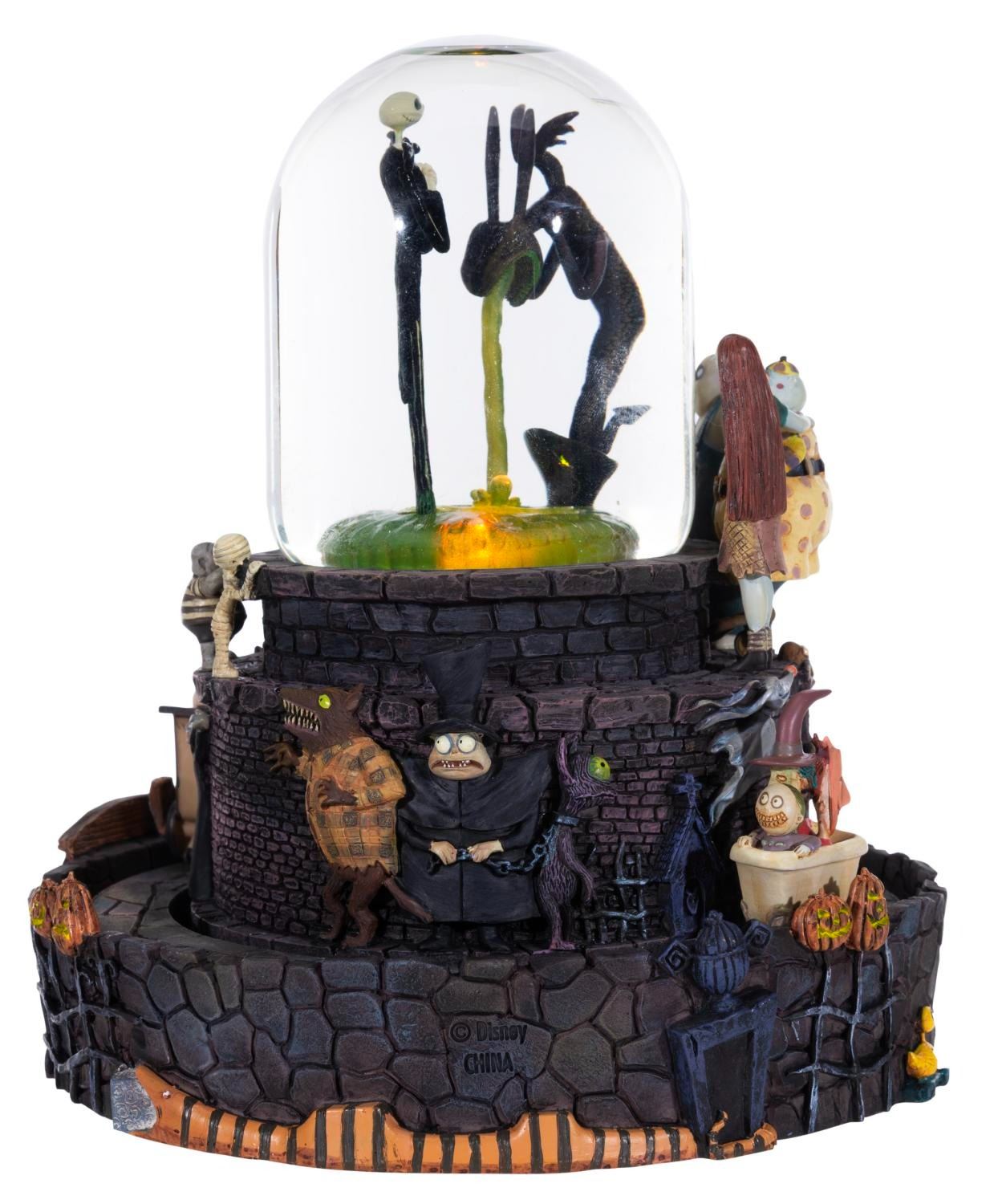 (Disney Store, 2024) A "The Nightmare Before Christmas " snowglobe featuring Jack atop the Halloweentown fountain from the opening number of the film. When wound, the globe plays "This is Halloween " while Jack rotates inside, and the outer track of characters move around the base. The globe also has a light-up feature requiring two "AA " batteries (not included) that worked when tested. Measuring 7.75 " in diameter x 8 " tall, the snowglobe is in fine working condition.