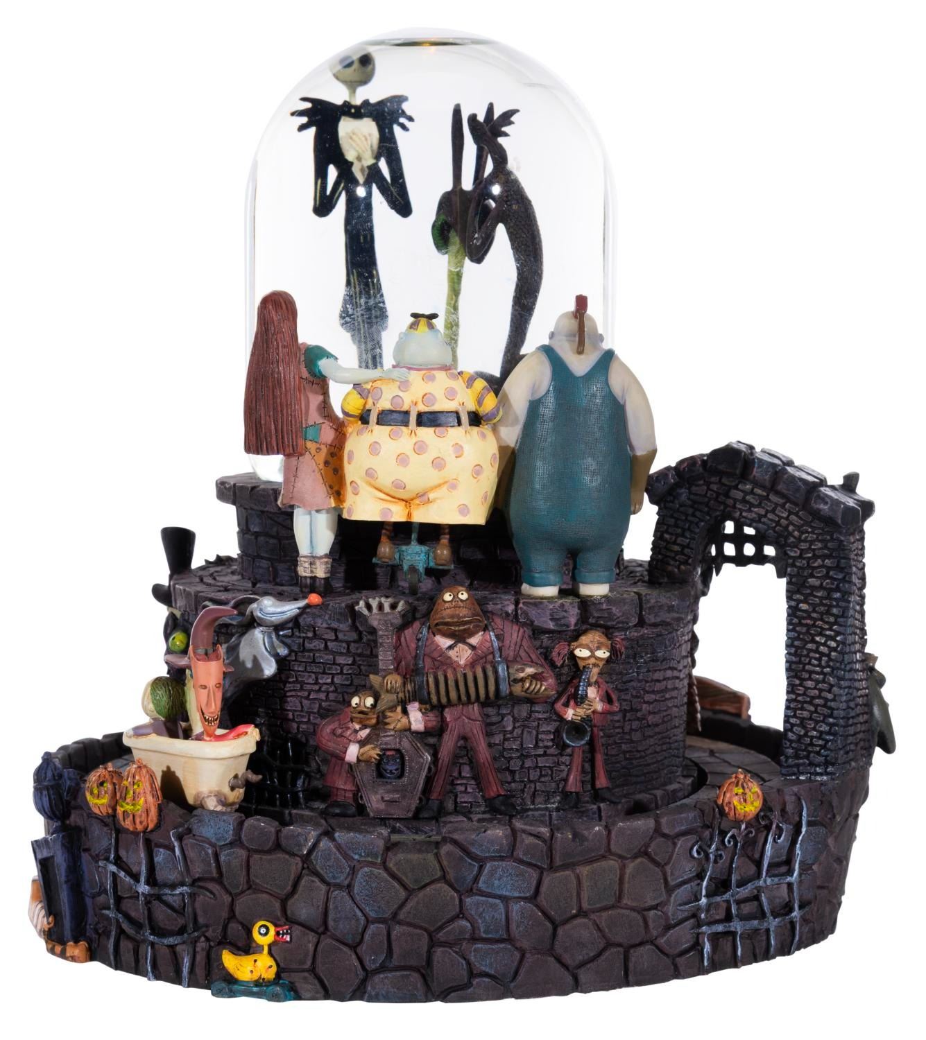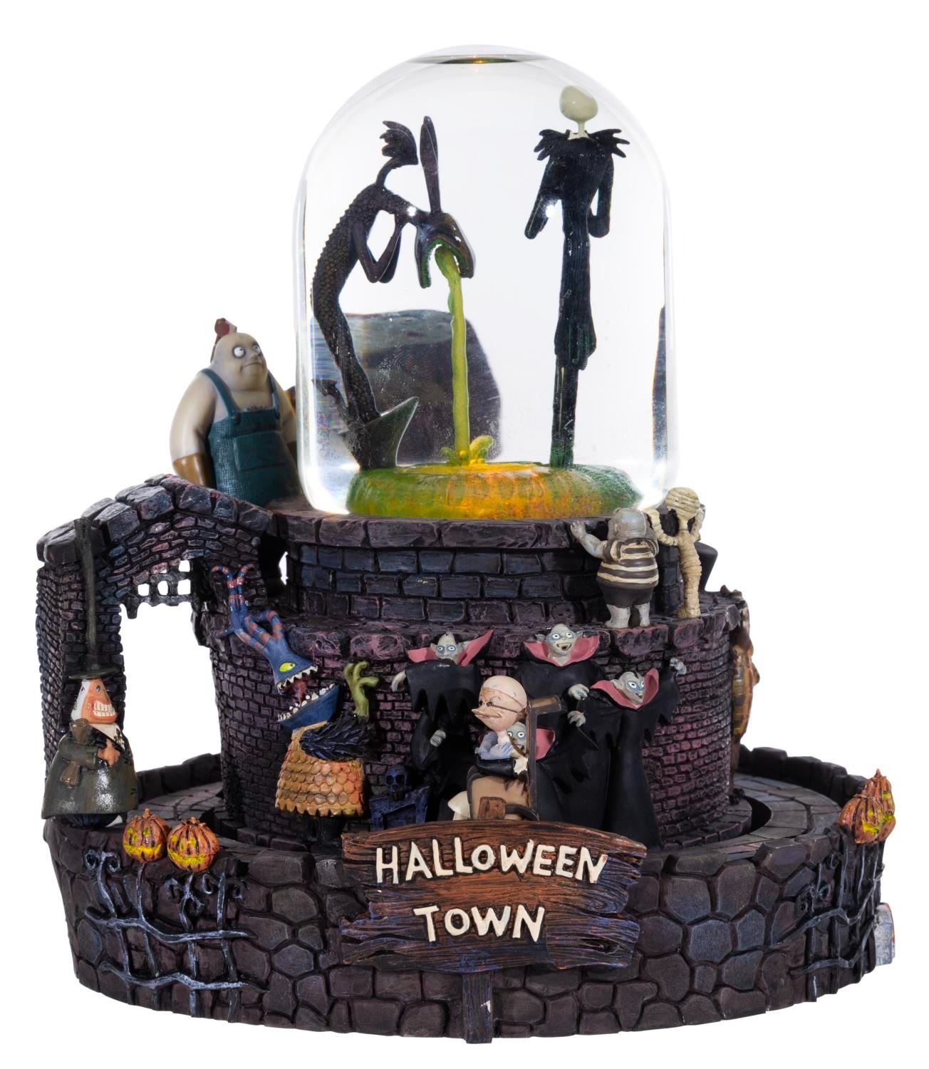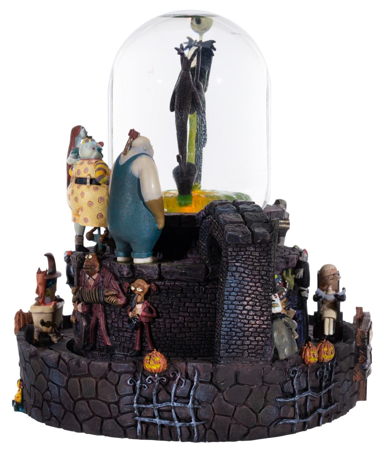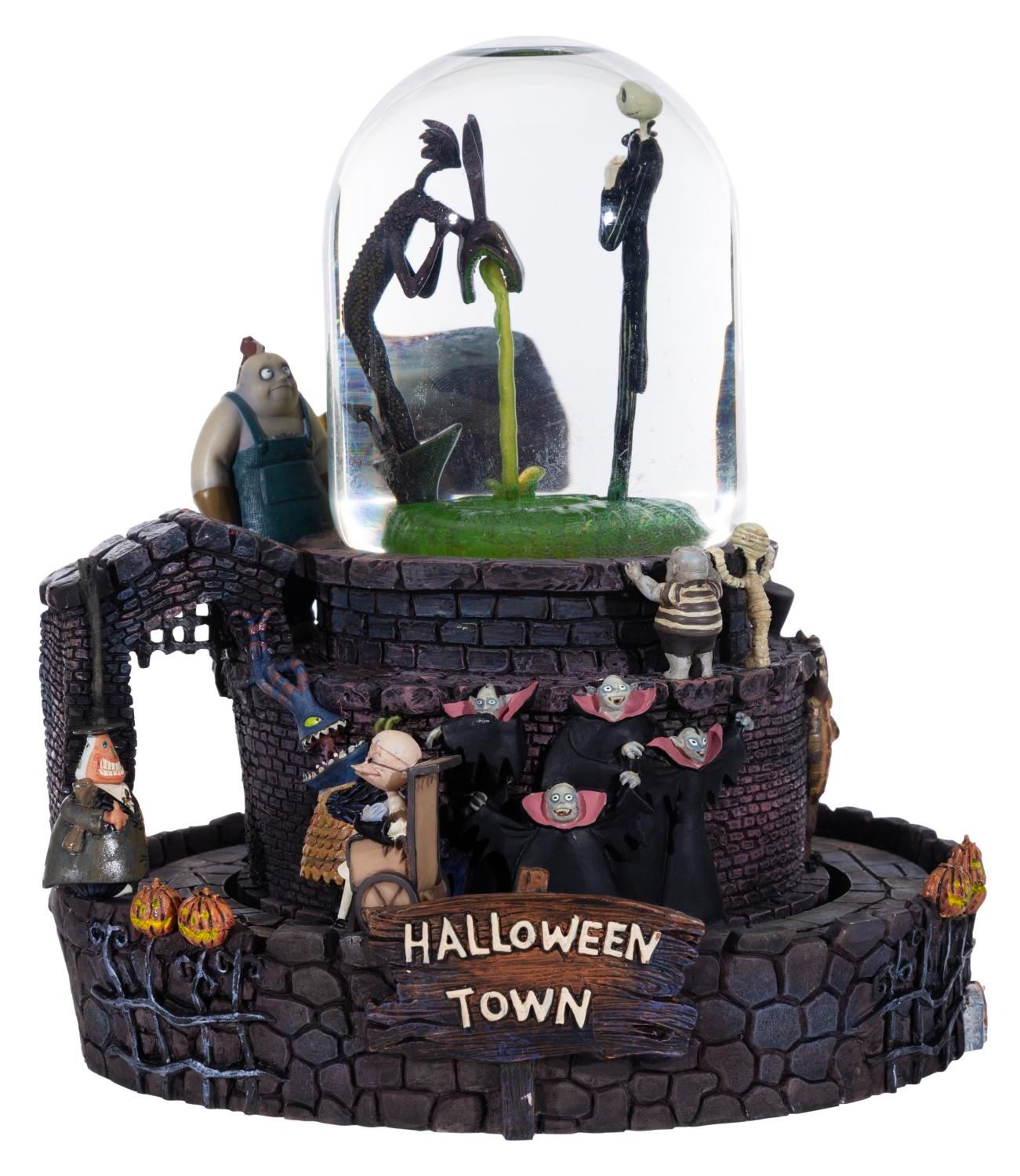 (Disney Store, 2024) A "The Nightmare Before Christmas " snowglobe featuring Jack atop the Halloweentown fountain from the opening number of the film. When wound, the globe plays "This is Halloween " while Jack rotates inside, and the outer track of characters move around the base. The globe also has a light-up feature requiring two "AA " batteries (not included) that worked when tested. Measuring 7.75 " in diameter x 8 " tall, the snowglobe is in fine working condition.