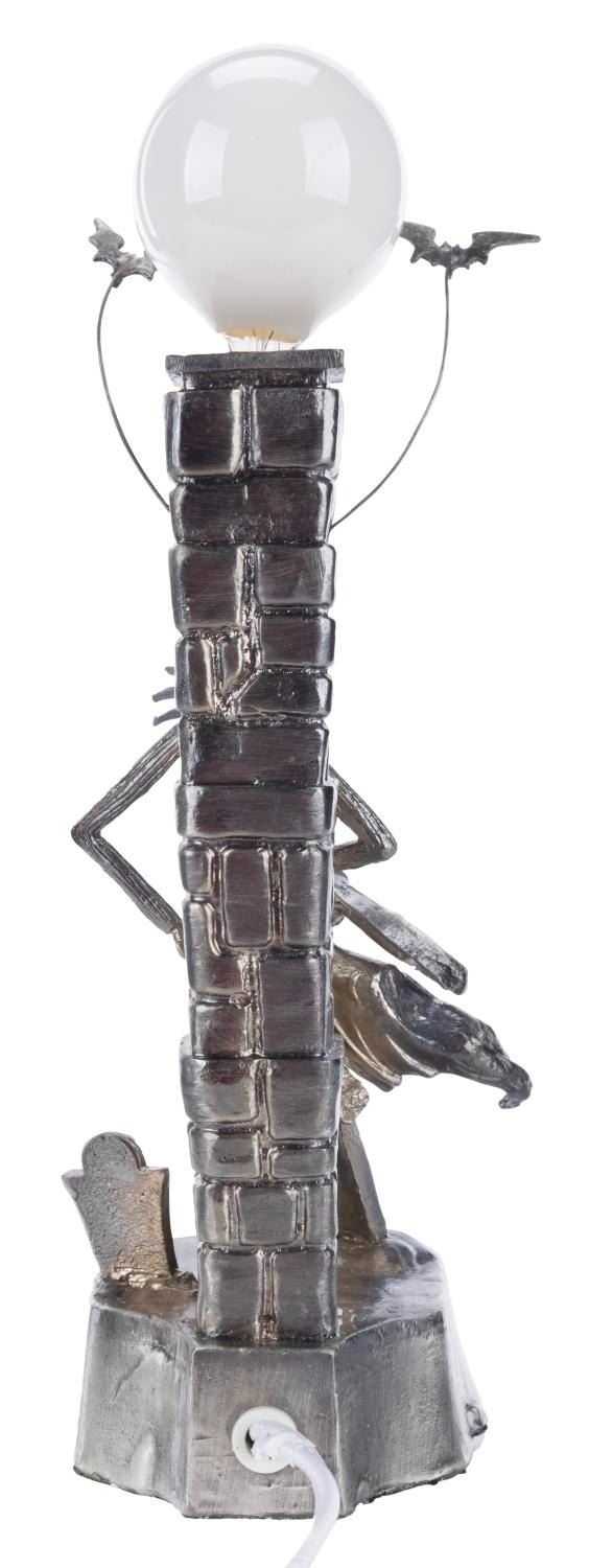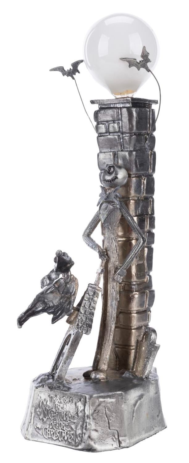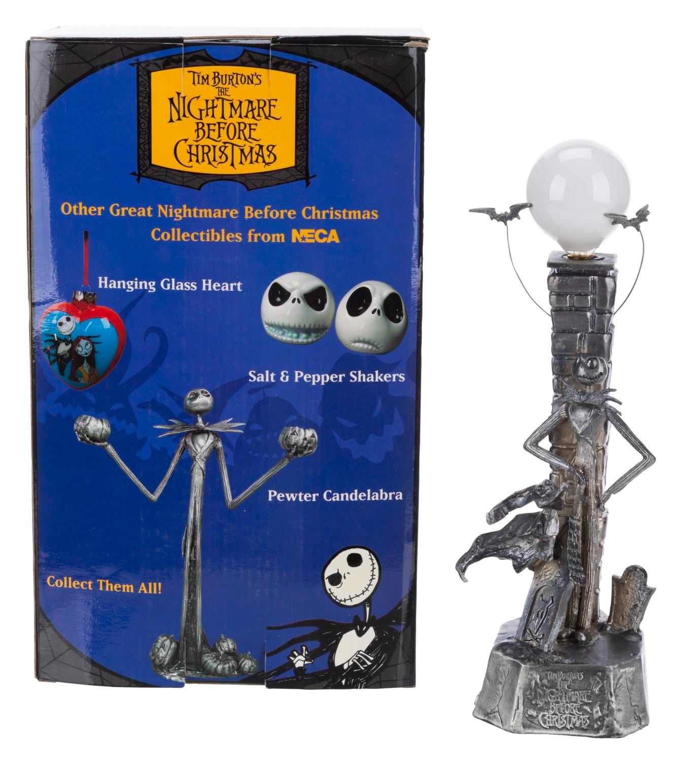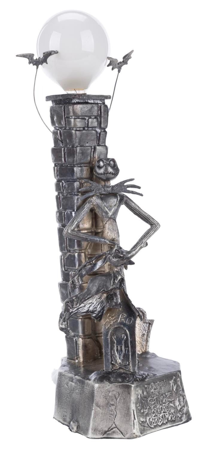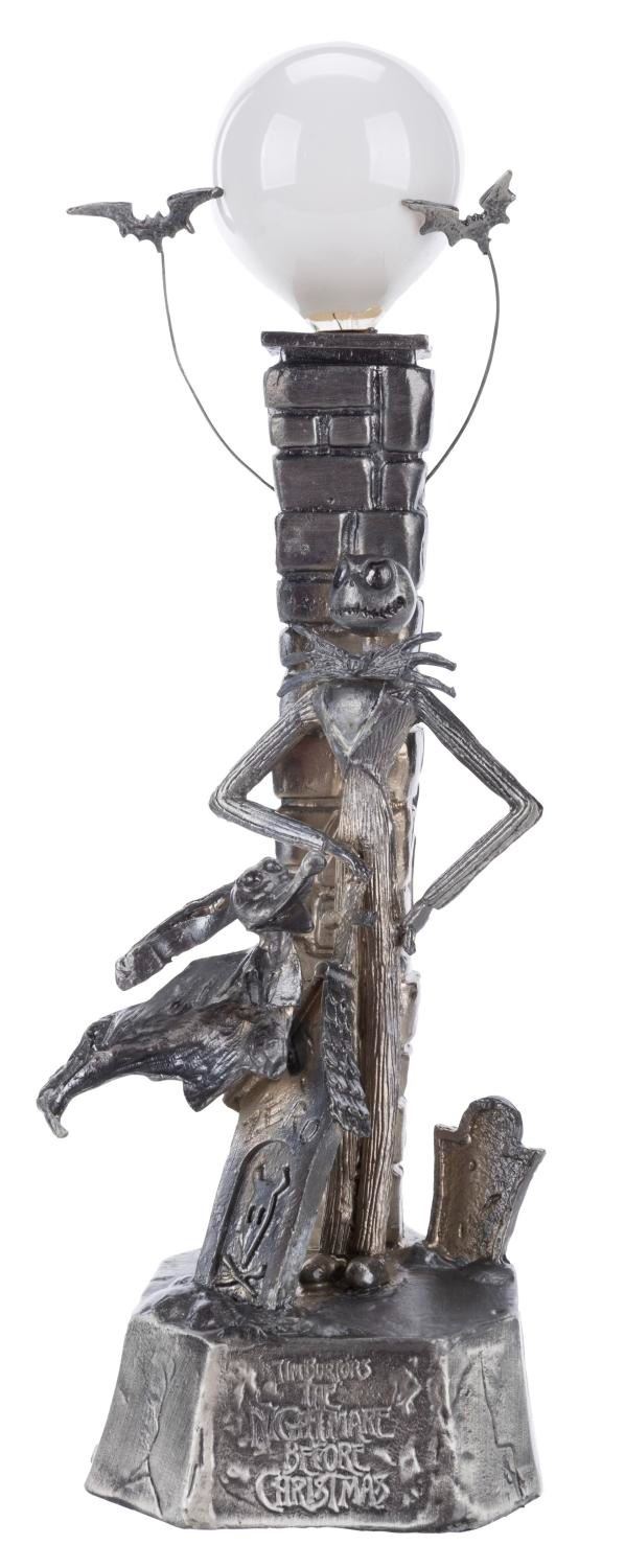 (NECA, 2004) A pewter desk lamp of Jack Skellington and Zero with a yellow moon-like bulb. Standing 10” tall, the lamp tested in fine working condition, with the original box.