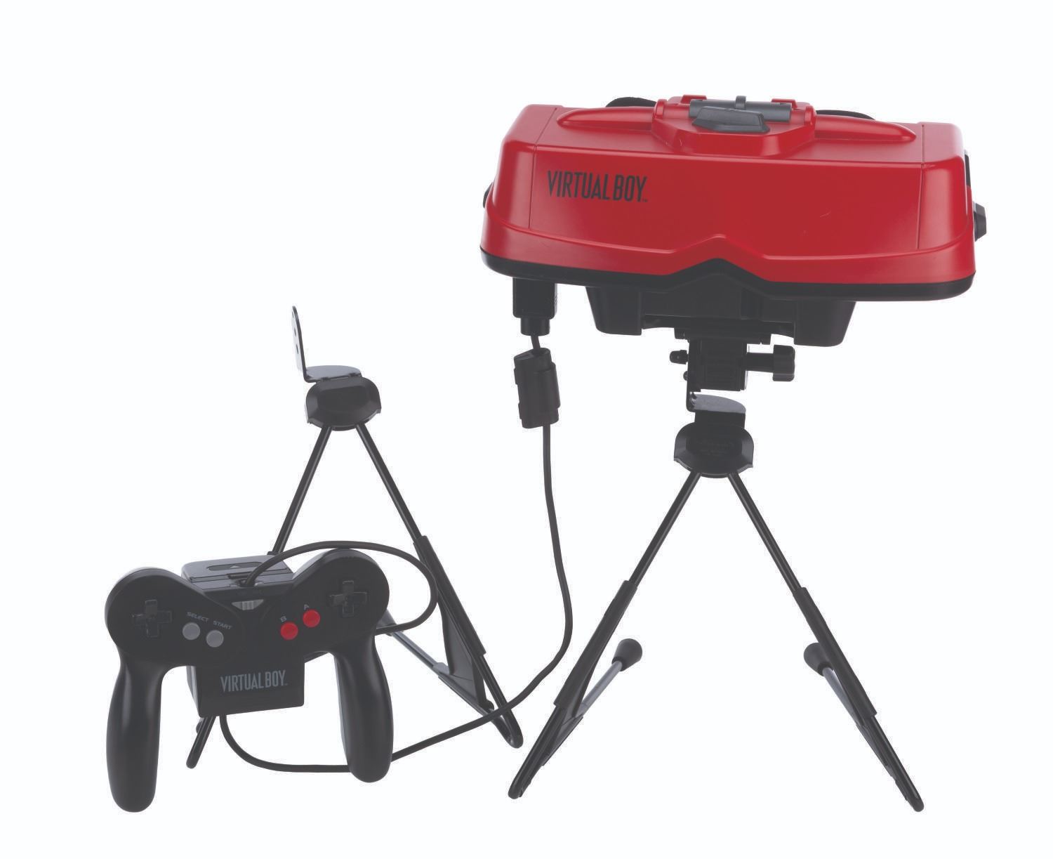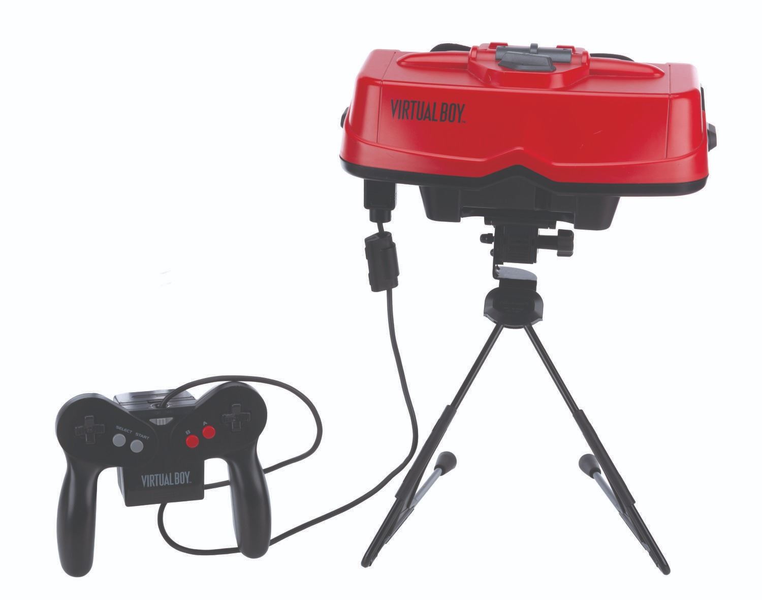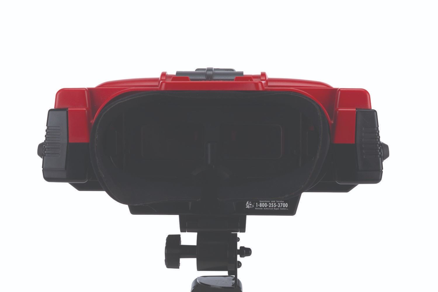 (Nintendo, 1995) An original Nintendo Virtual Boy, a virtual reality game console. Virtual Boy was the first video game console of its kind, delivering games in amazing, stereoscopic 3D in what Nintendo claimed would "totally immerse players into their own private universe." Included in the set are the Virtual Boy headset, a controller with battery holder, a mounting bracket, and two desktop stands. The console operates on six"AA" batteries (not included), and without games, the console is in untested condition and may require service. Measuring 10" x 10.5" x 13" tall, when assembled, the console is in good condition with light evidence of usage, including soiling, scratches, and creasing of the foam eye cup.
