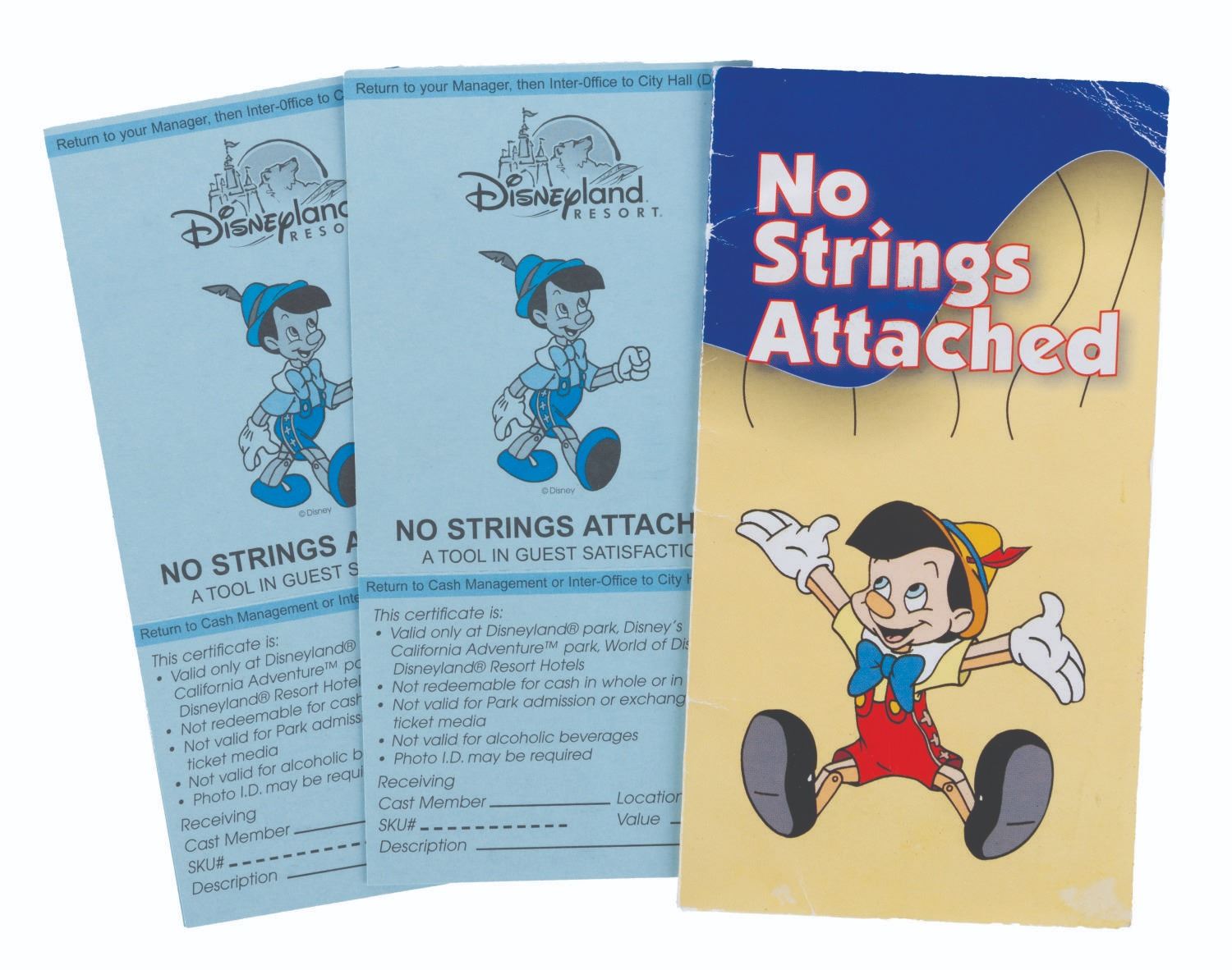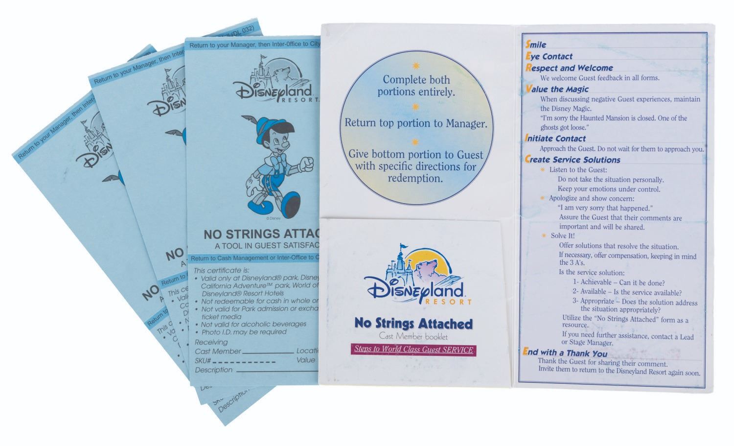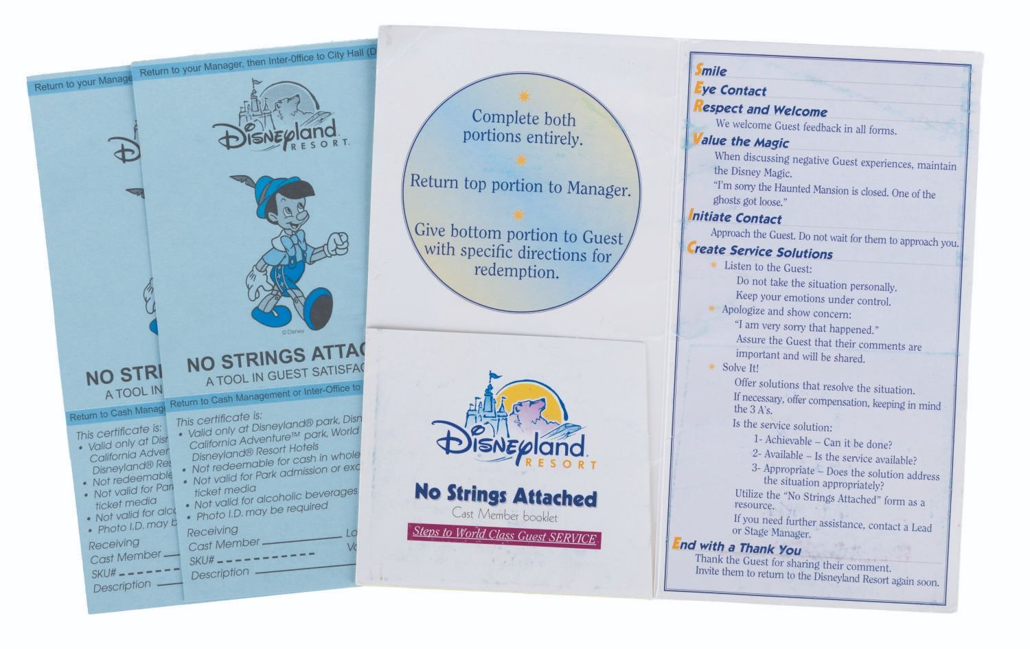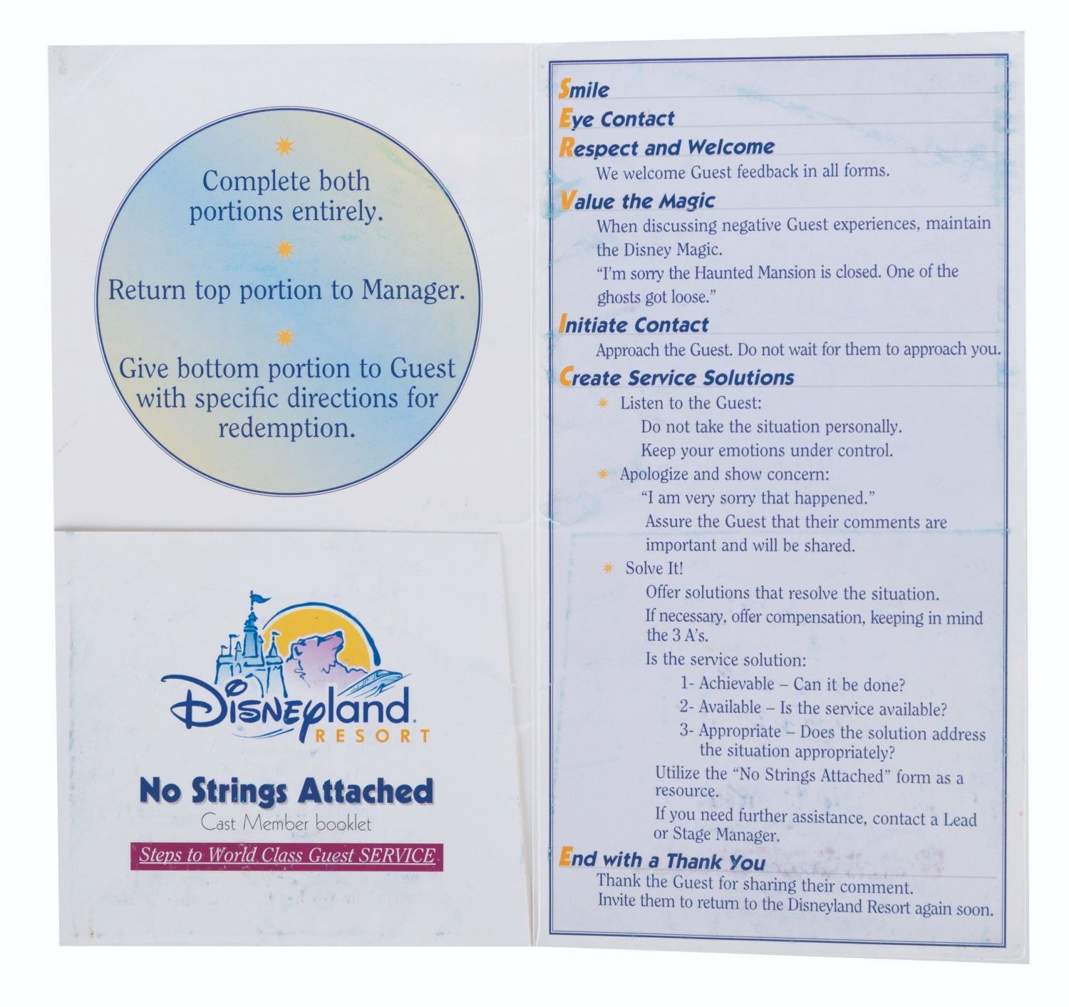 (Disneyland, 2000s) A folder with three No Strings Attached forms, given to Guests who bring complaints or problems to a Cast Member. The folder lists tips on how to properly interact with the Guest, while the forms allow the Cast Member to give them priority boarding, complimentary food, or merchandise as compensation. Measuring 6.5" x 3.5", the folder is in fair condition with creases and scuffs from use. The 6.25" x 3.25" forms are in fine condition.