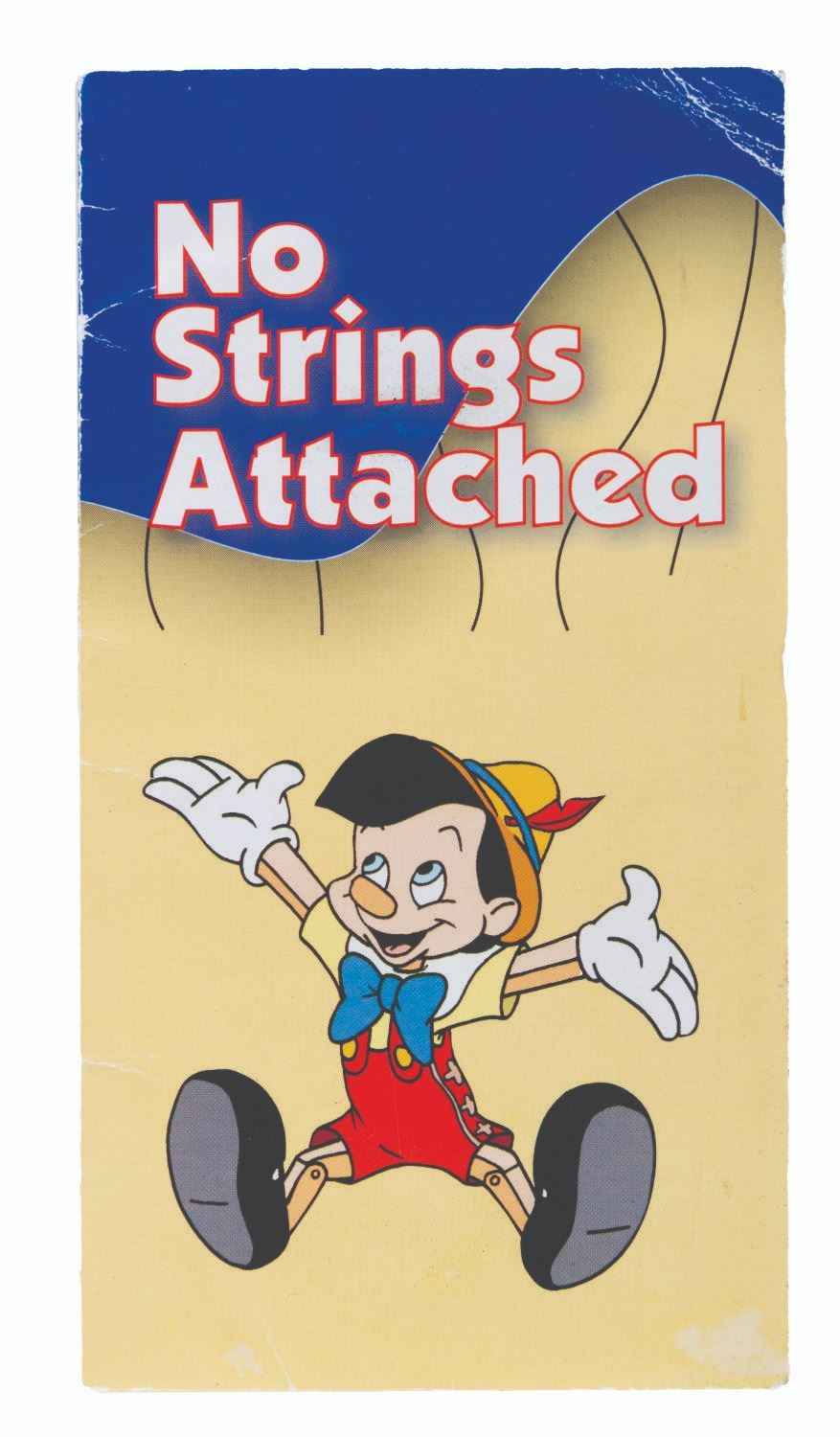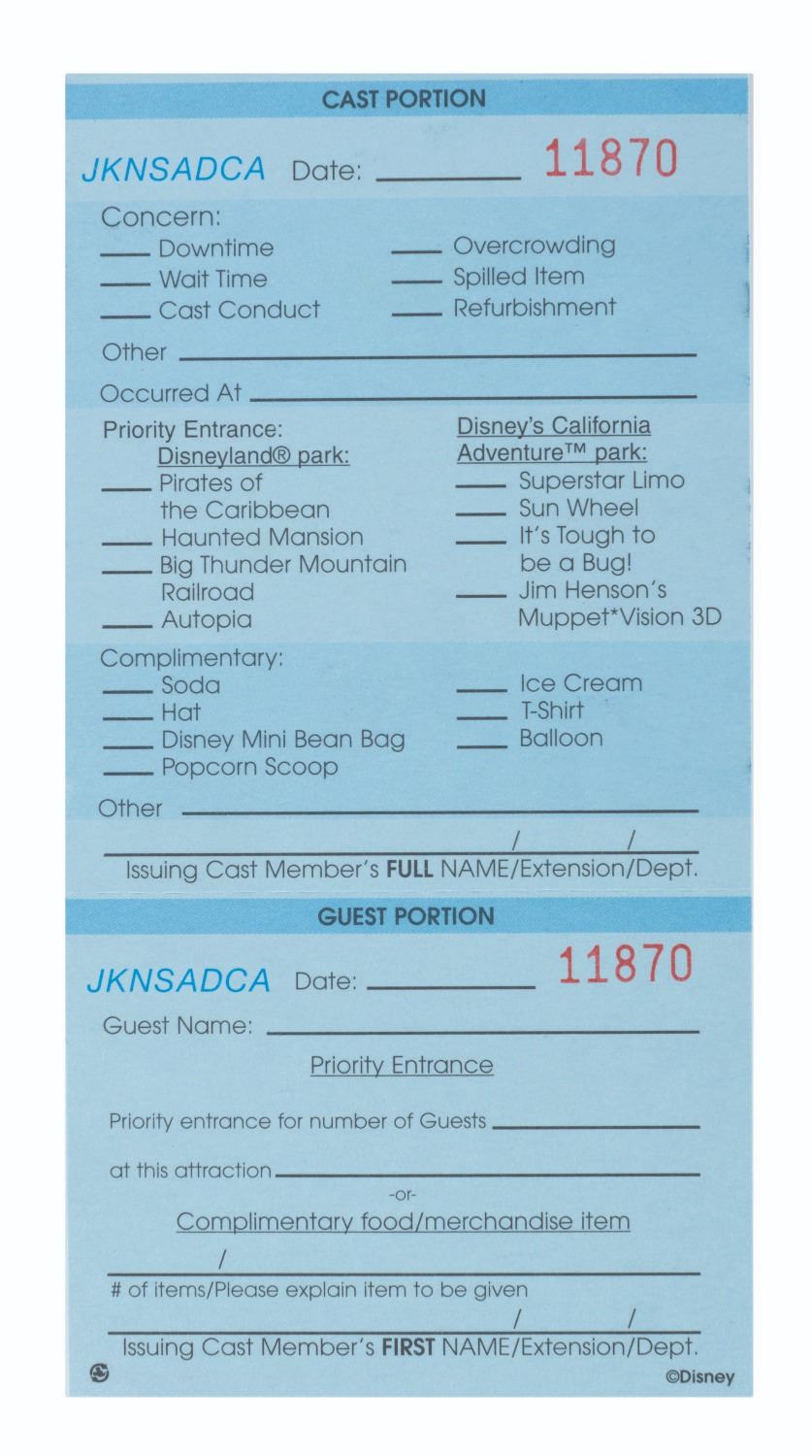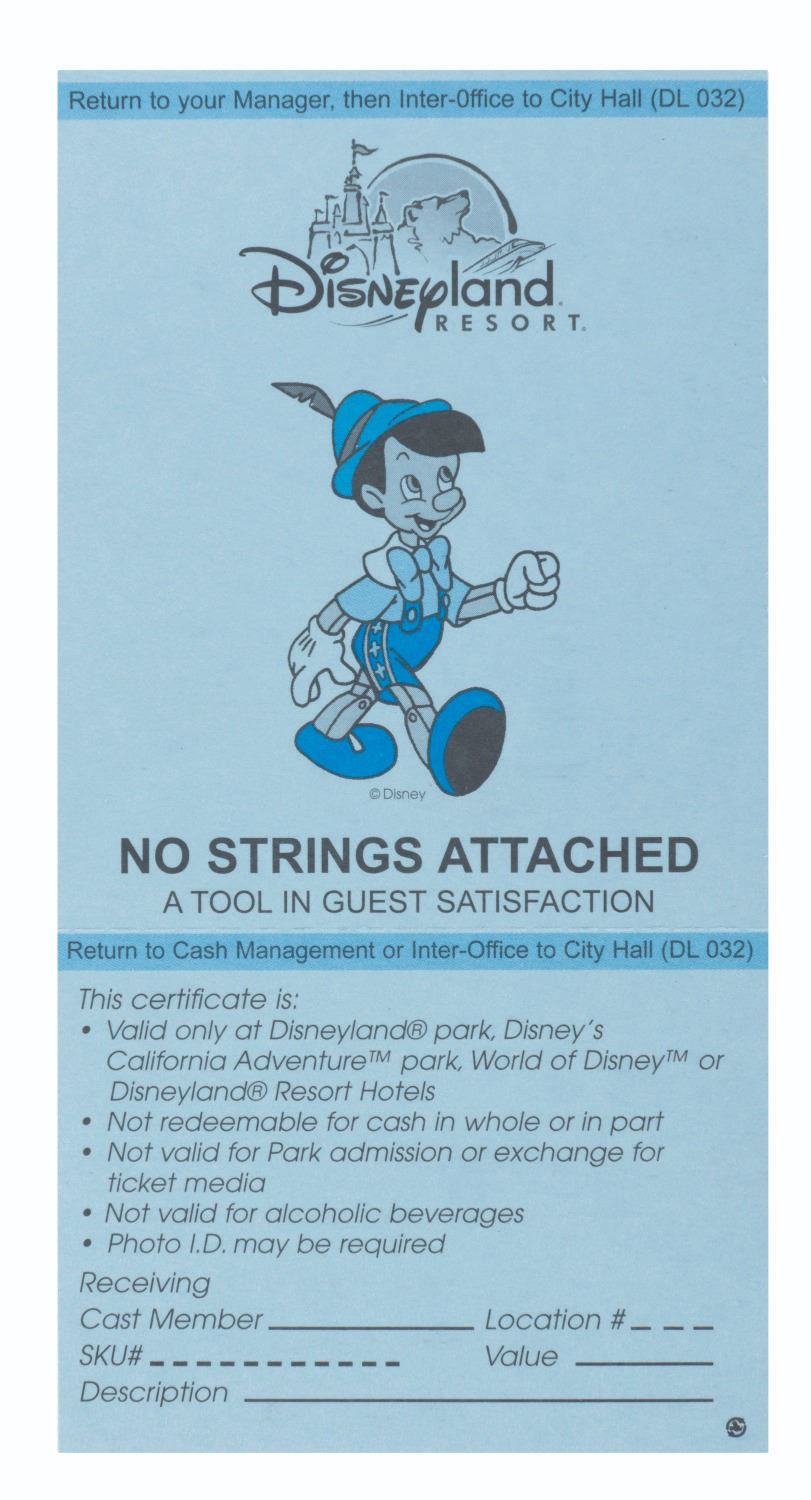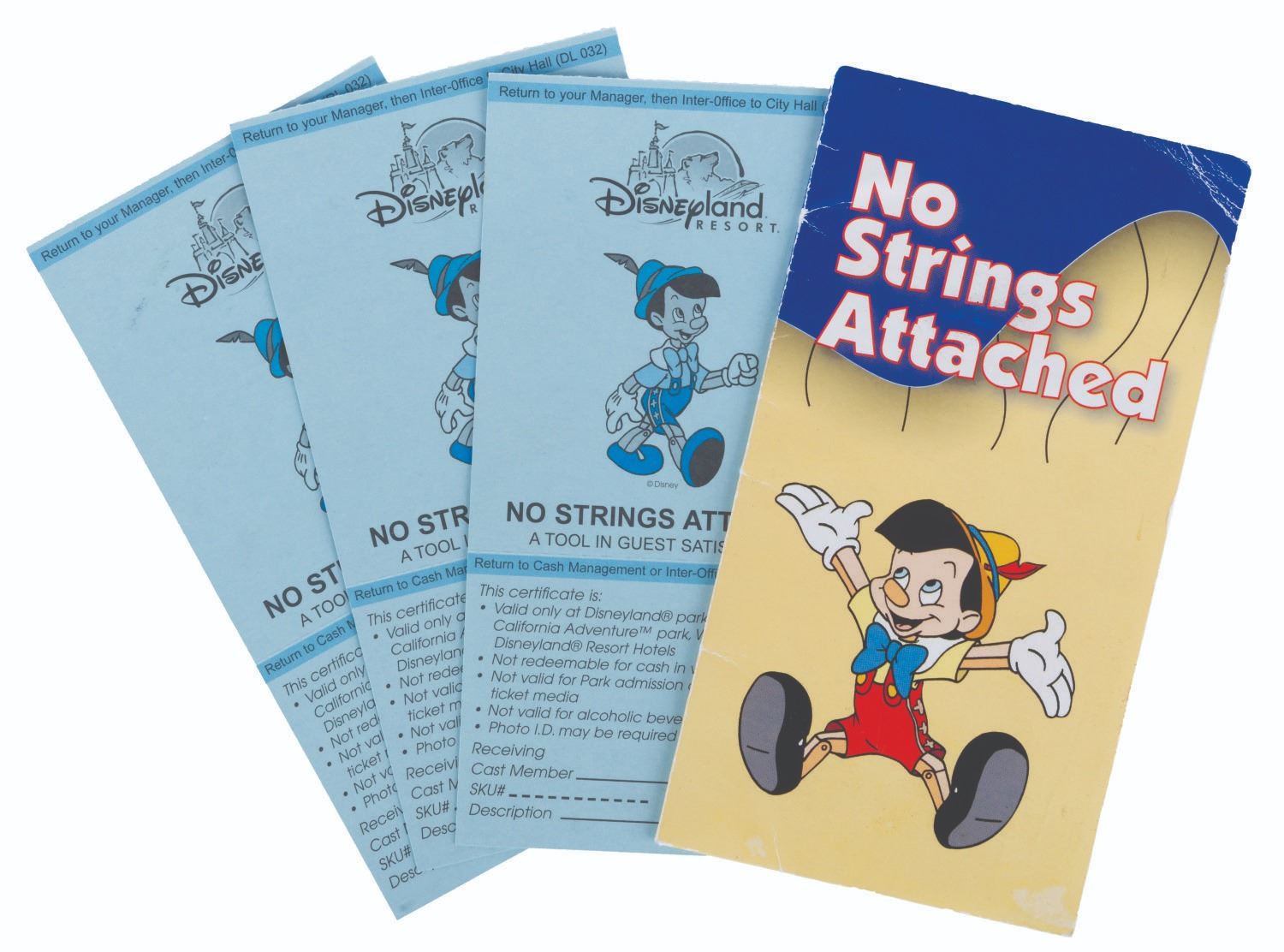(Disneyland, 2000s) A folder with three No Strings Attached forms, given to Guests who bring complaints or problems to a Cast Member. The folder lists tips on how to properly interact with the Guest, while the forms allow the Cast Member to give them priority boarding, complimentary food, or merchandise as compensation. Measuring 6.5" x 3.5", the folder is in fair condition with creases and scuffs from use. The 6.25" x 3.25" forms are in fine condition.