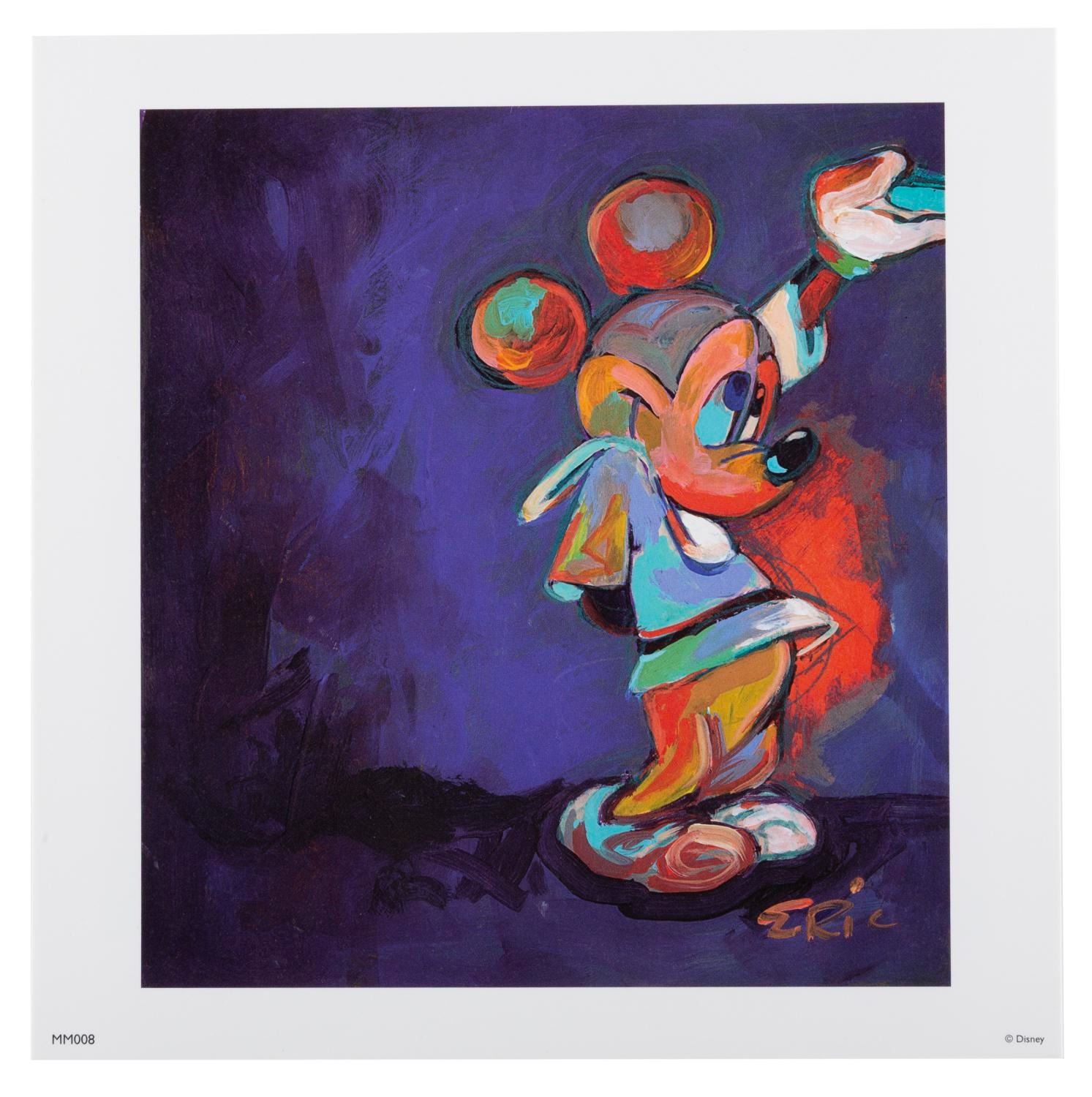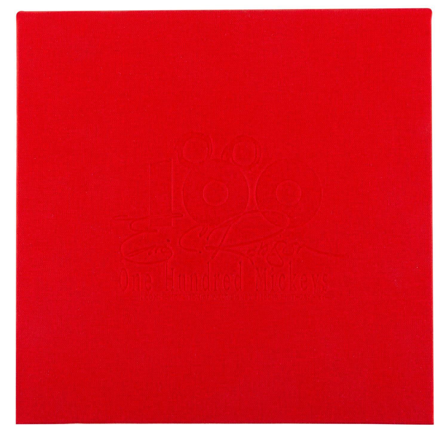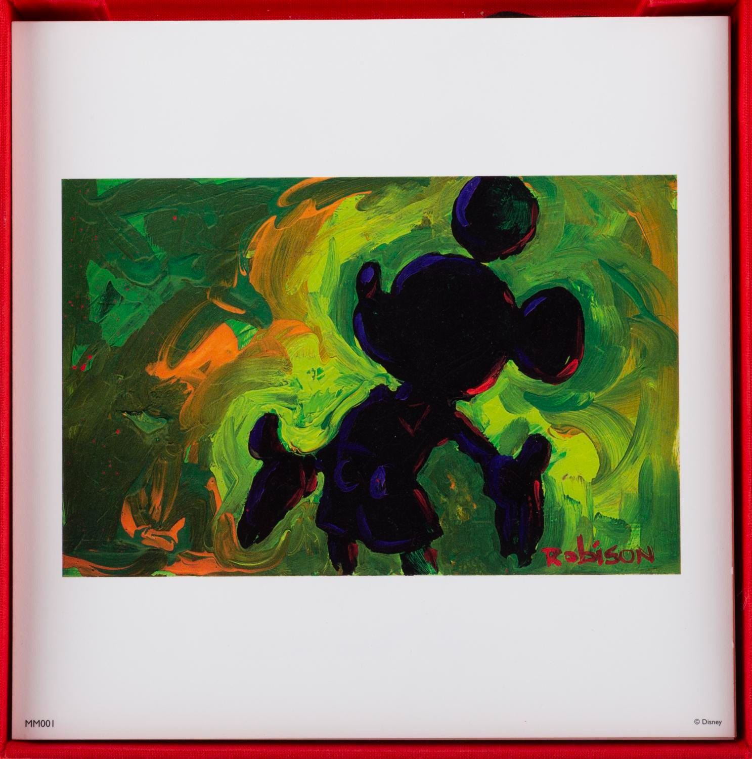 (Disneyland, 2002) A limited edition One Hundred Mickeys box set of prints by artist and Imagineer Eric Robison. In commemoration of Walt Disney's 100th birthday, Robison was asked to create 100 original paintings of Mickey Mouse; a task he achieved in under 17 months. This set contains a beautiful 7" x 7" lithographic reproduction of each of Robison's paintings, printed on acid-free, archival-quality paper, in a decorative red box embossed with the "One Hundred Mickeys" emblem. The certificate of authenticity is numbered 897/1000 and signed by Robinson. The set is in fine condition.