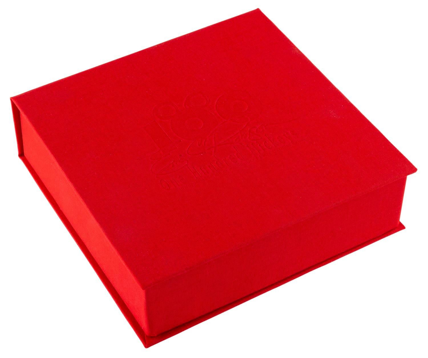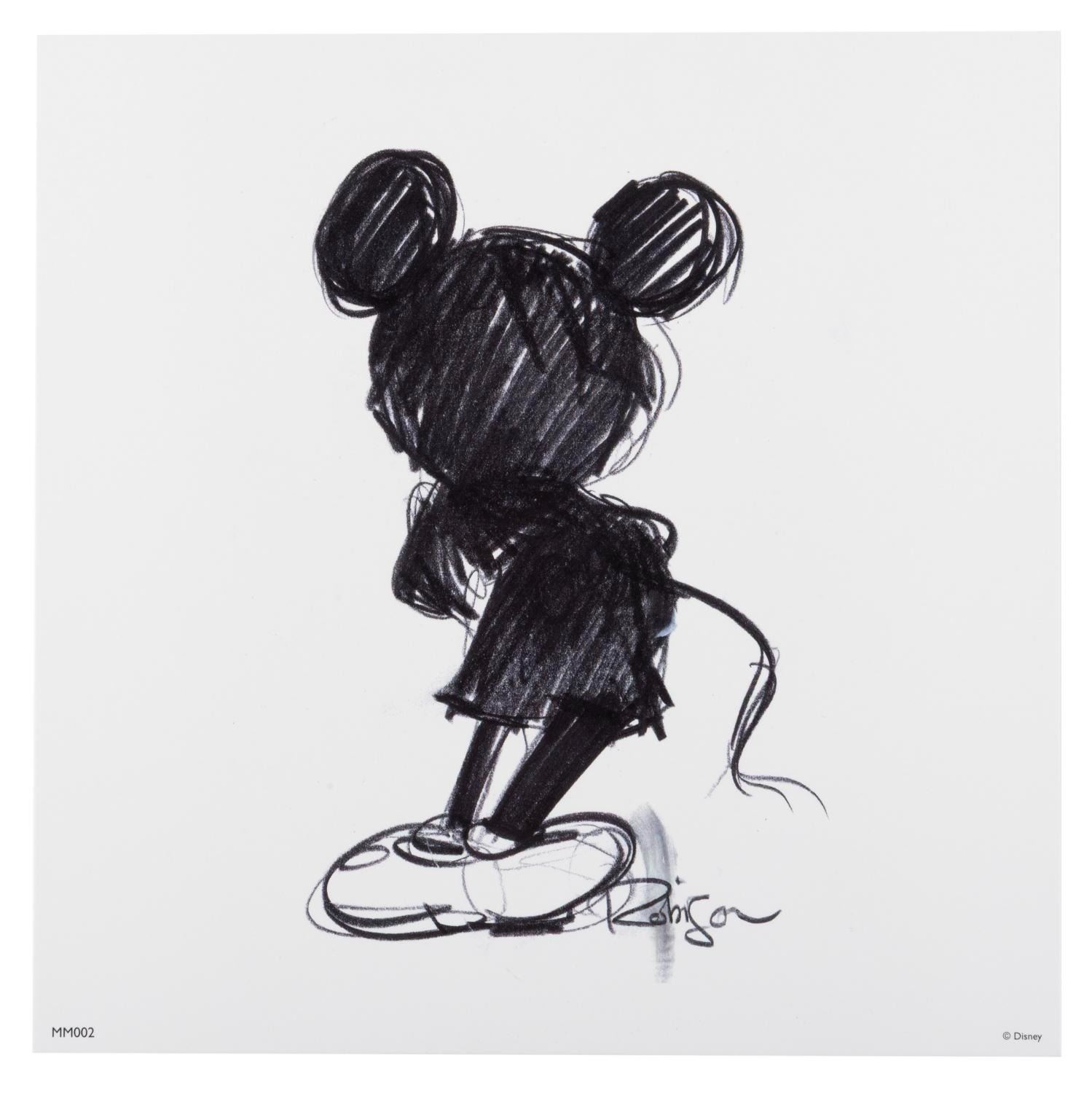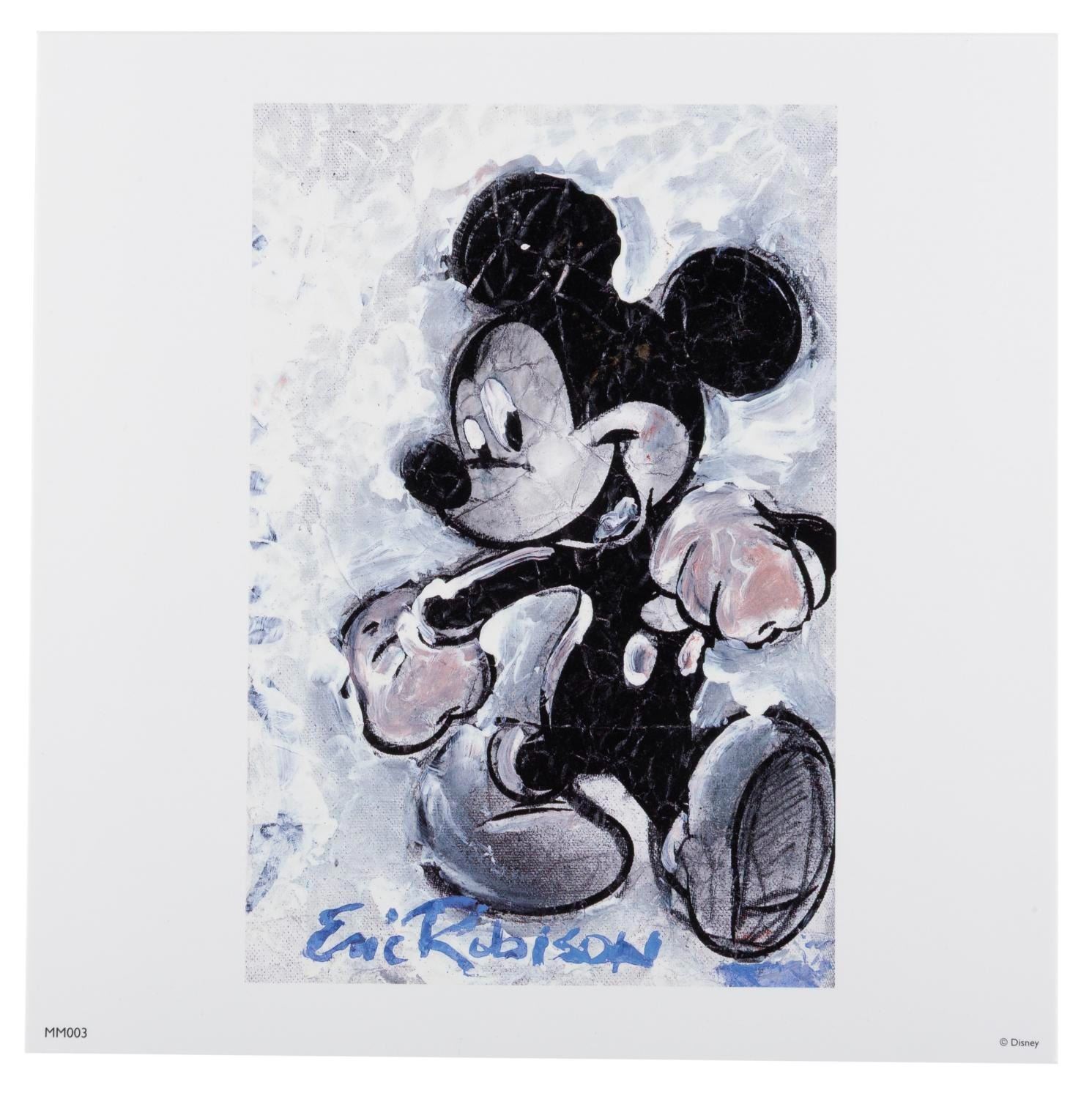 (Disneyland, 2002) A limited edition One Hundred Mickeys box set of prints by artist and Imagineer Eric Robison. In commemoration of Walt Disney's 100th birthday, Robison was asked to create 100 original paintings of Mickey Mouse; a task he achieved in under 17 months. This set contains a beautiful 7" x 7" lithographic reproduction of each of Robison's paintings, printed on acid-free, archival-quality paper, in a decorative red box embossed with the "One Hundred Mickeys" emblem. The certificate of authenticity is numbered 897/1000 and signed by Robinson. The set is in fine condition.