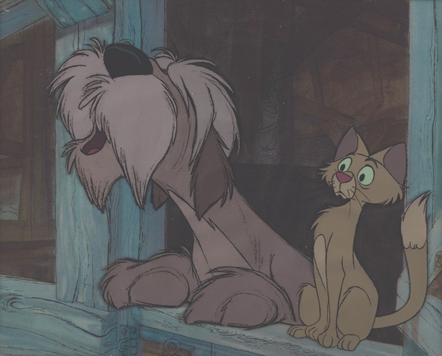 (Disney, 1961) An original production cel of Colonel and Sergeant Tibbs from "One Hundred and One Dalmatians" with a color copy background. This cel was sold at the Disneyland Art Corner, and comes with the original Art Corner gold label on the reverse of the matte. Colonel and Tibbs have an image size of 6.75" x 8.75" on a 7.75" x 9.75" visible cel. The entire matted piece measures 12" x 14". The cel is in very good condition with light warping from age and discoloration around the edges of the matte.
