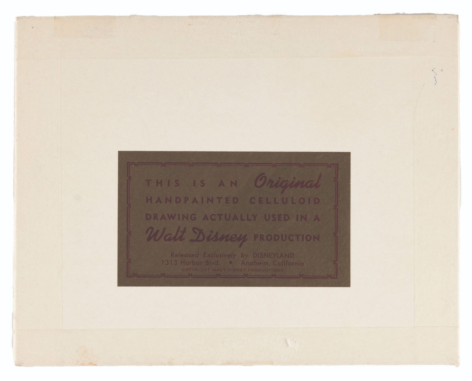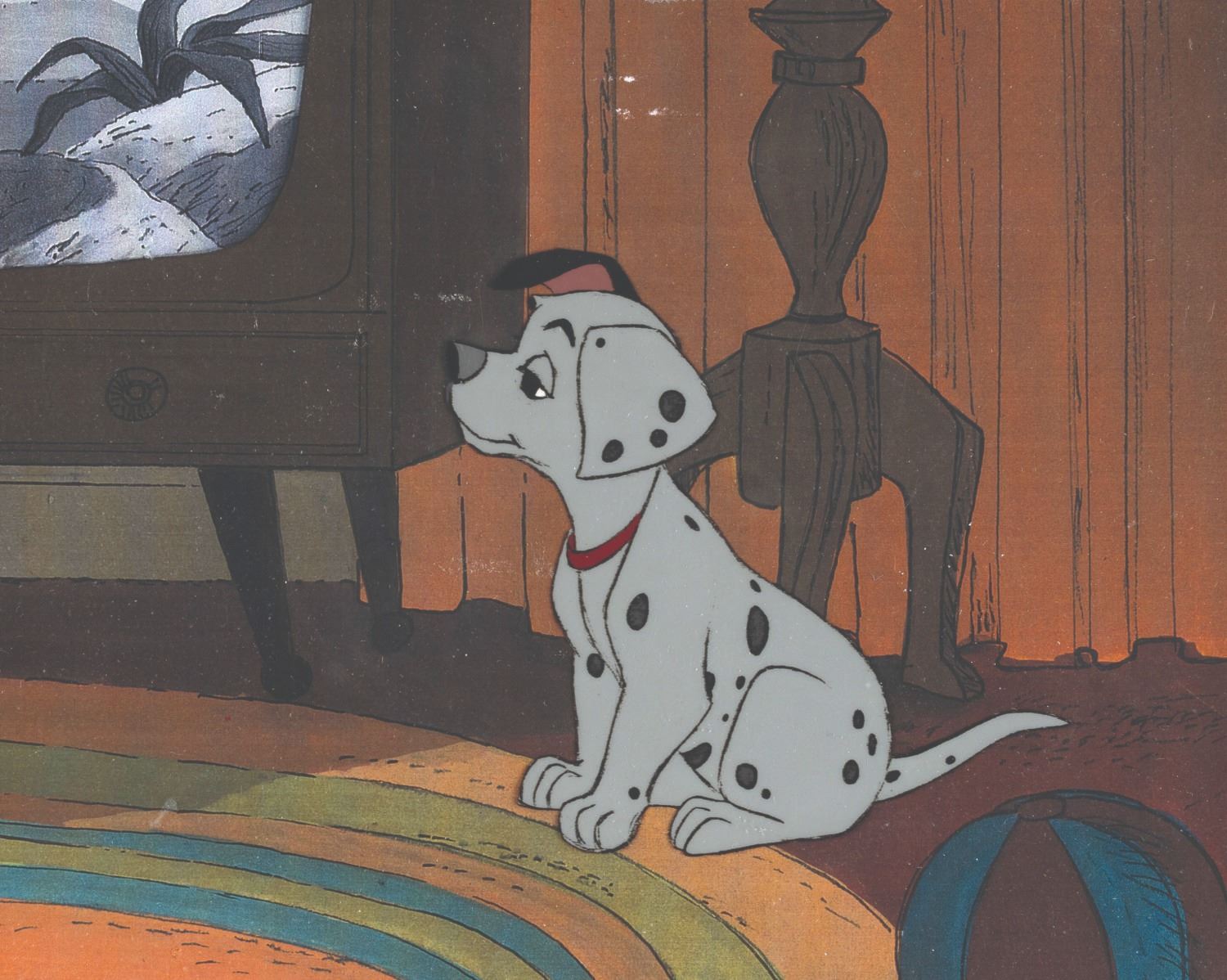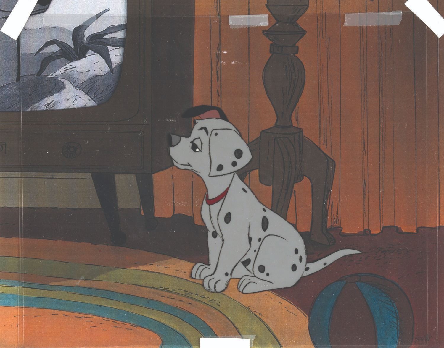 (Disney, 1961) An original production cel of Patch from "One Hundred and One Dalmatians," from the collection of Rolly Crump, who worked as an Assistant Animator on scenes involving Pongo and the puppies. This cel was first sold at the Disneyland Art Corner and comes with the original printed background, matte, and Art Corner gold label on the reverse. Patch has an image size of 3.75" x 3.75" on a 6.5" x 7.75" trimmed cel. The entire matted piece measures 8" x 9.5". The art is in very good condition with light line loss, wear from production use, and paint transfer to the background, while the matte exhibits discoloration from age and pinholes.
