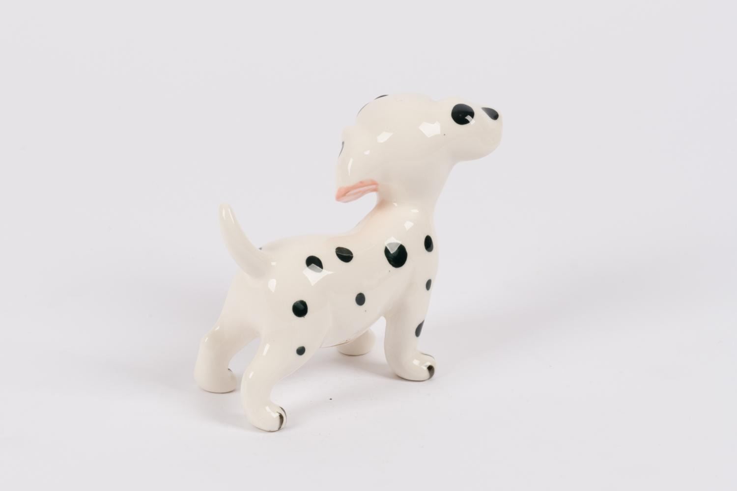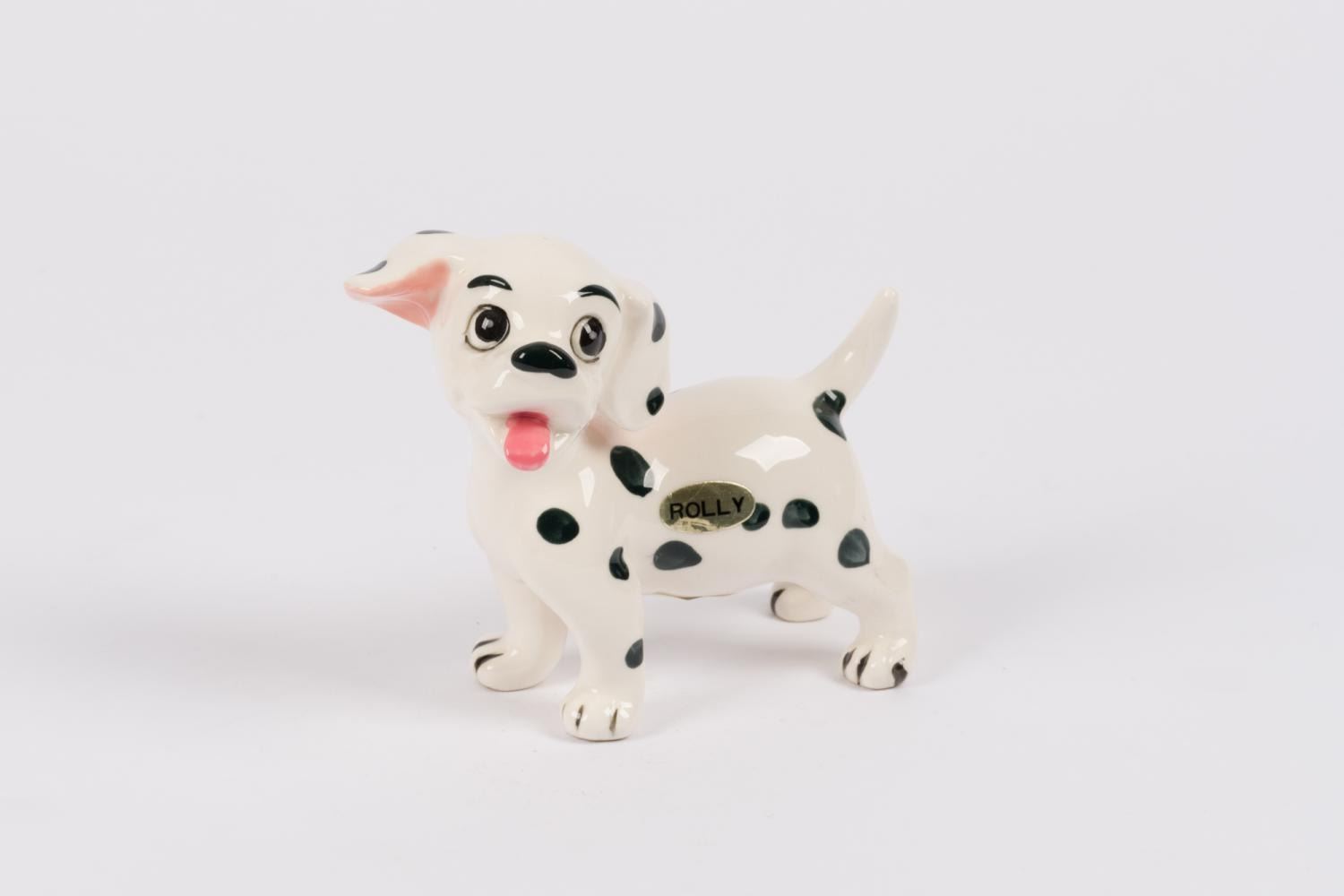 (Enesco, 1960s-70s) A ceramic figurine of the puppy Rolly from "One Hundred and One Dalmatians." Measuring 4.25" x 2.25" and 4.25" tall, the figurine is in very good condition with light soiling and adhesive residue from previous price tag on underside.