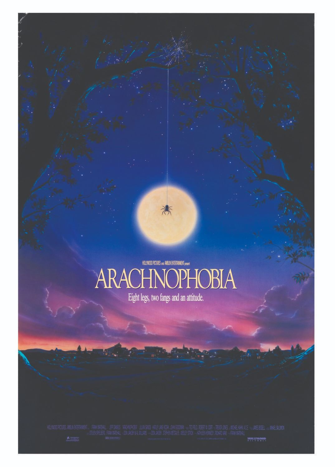 (Buena Vista, 1990) A one-sheet poster for the horror comedy "Arachnophobia," starring Jeff Daniels and John Goodman. The film marked the directorial debut of Frank Marshall, producer of "Raiders of the Lost Ark,” "Back to the Future,” and "Who Framed Roger Rabbit.” Measuring 27” x 40”, the poster is in good condition with edge wear and tears, particularly the top left corner.