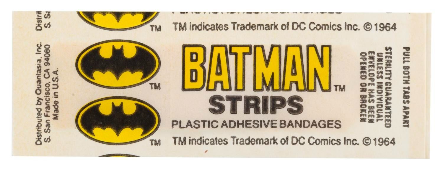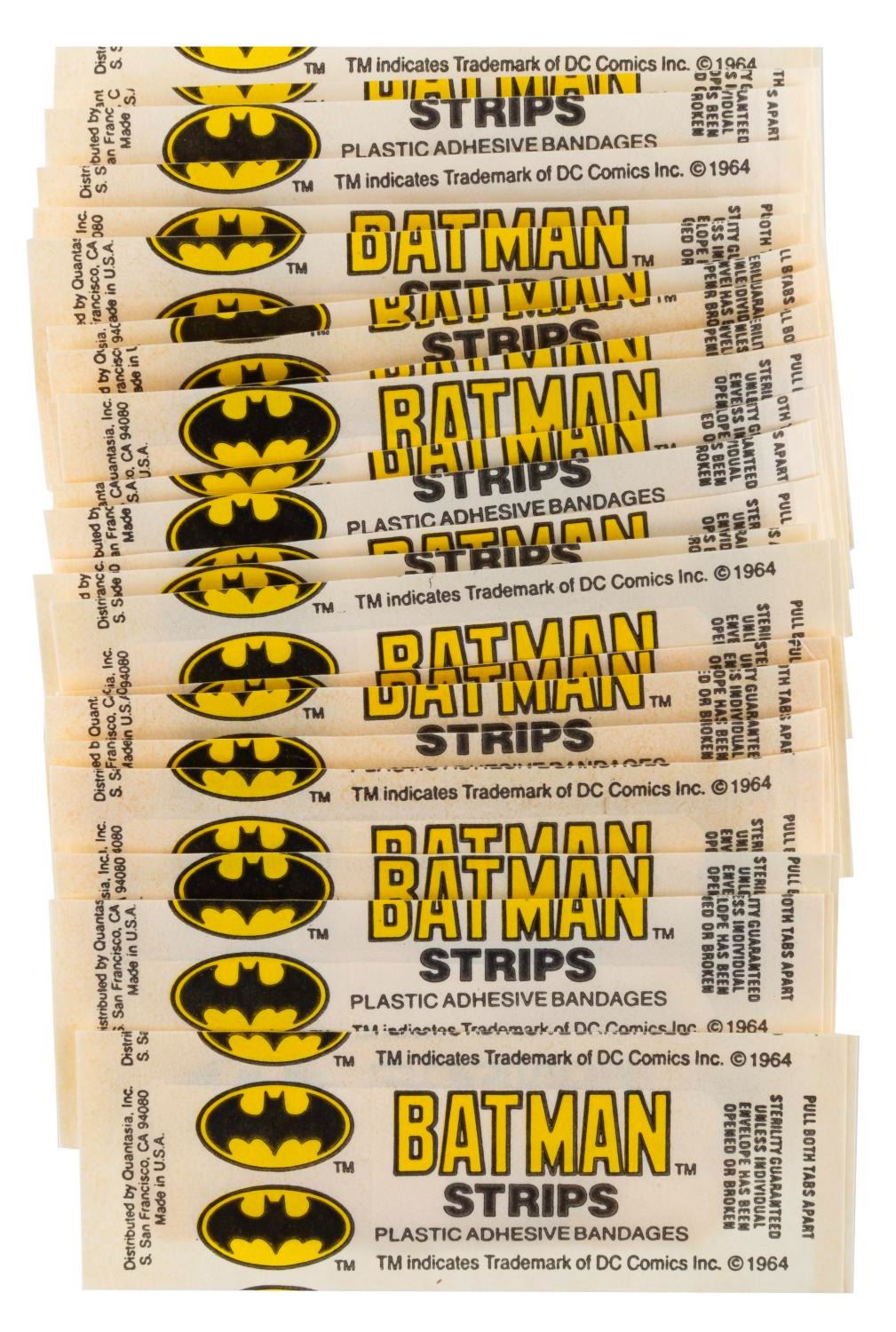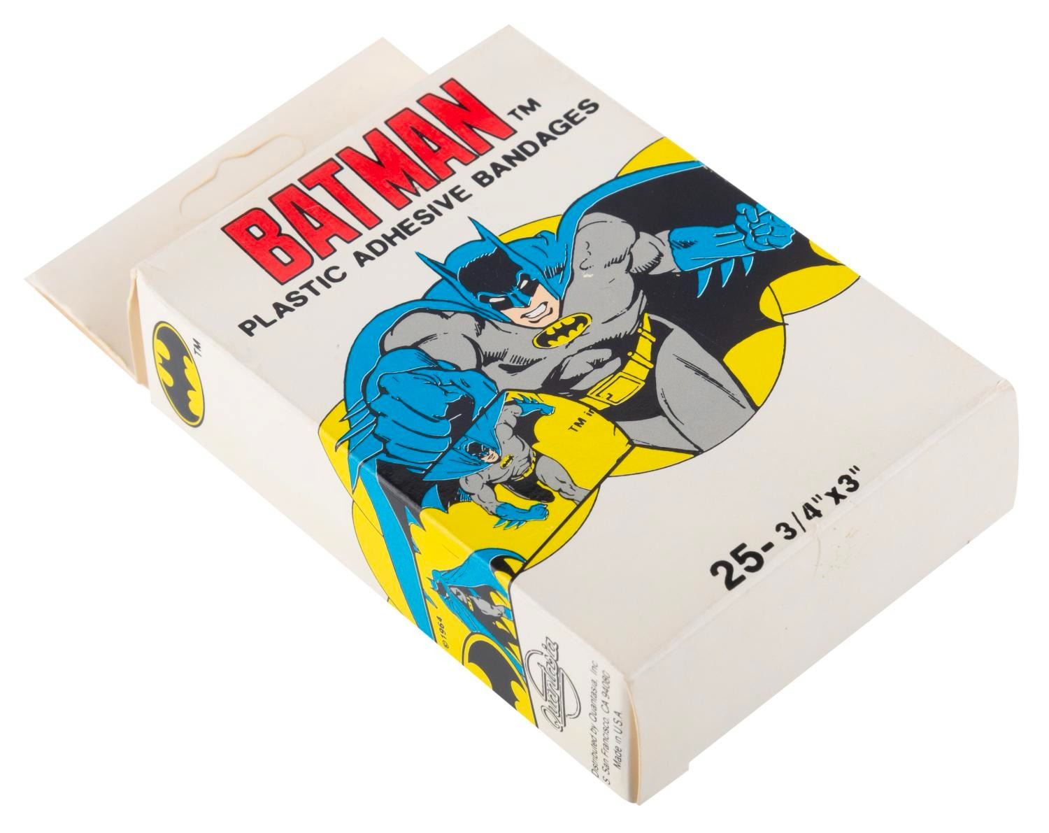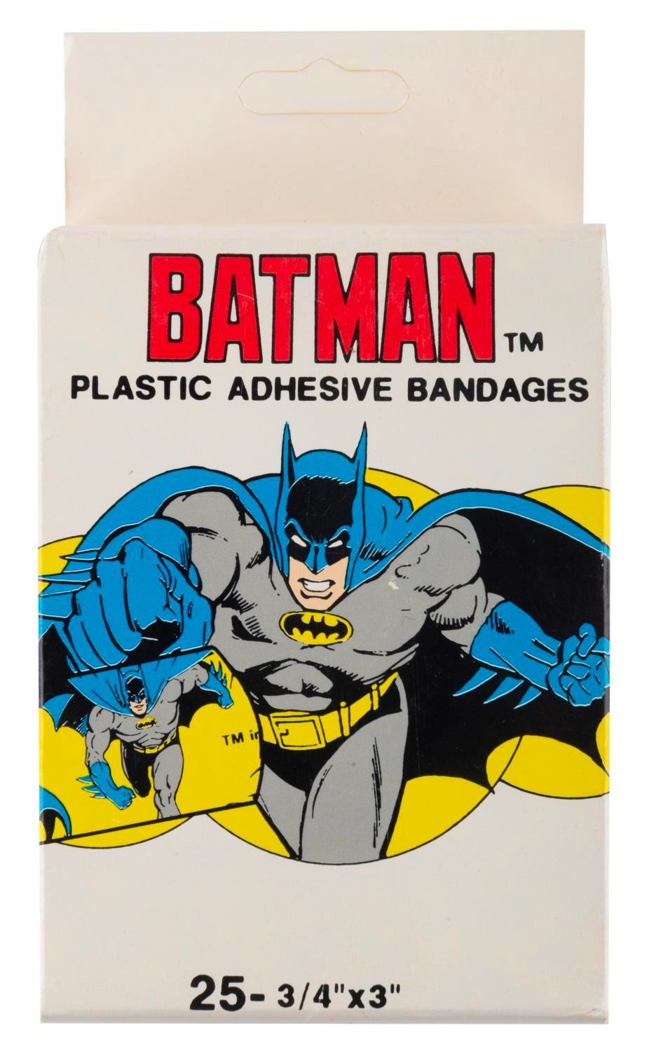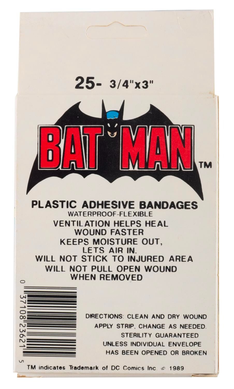 (Quantasia, 1989) A package of 25 plastic adhesive bandages featuring Batman designs. Measuring 3” x 1” x 5.5” tall, the package displays in very good condition with light dents and creases.