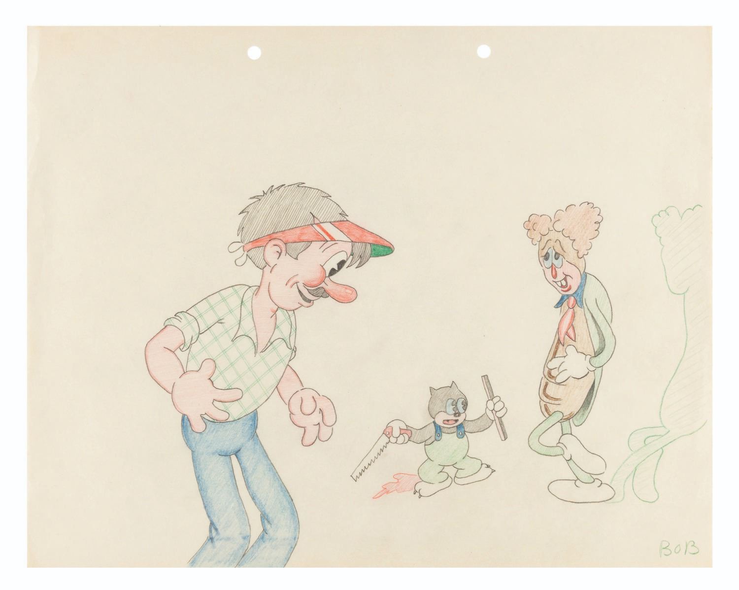 (Warner Bros., 1930s) A page of drawings by Bob Clampett of characters from 1930s Warner Brothers shorts. The characters include Beans, the cartoonist from “A Cartoonist’s Nightmare,” and a cockroach parody of Rudy Vallee from “The Lady in Red.” The characters have an image size of 6.75” x 9.75” on 9.5” x 12” animation paper. The graphite and colored pencil drawing is in very good condition with light creases.