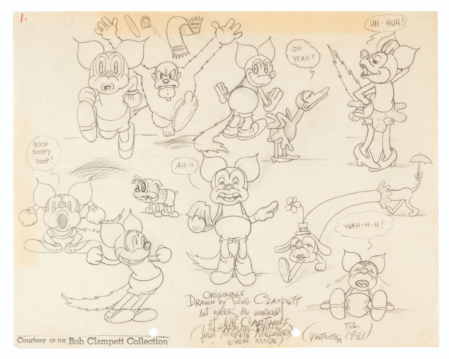(Harman-Ising, 1931) A page of character studies drawn by Bob Clampett during the first week he worked at the Harman-Ising Studio. Clampett was working on the very first Merrie Melody cartoon, "Lady, Play Your Mandolin," which includes Foxy, Roxy, and the ape waiter. Clampett was only seventeen years old when hired, and this is likely the oldest surviving work of his on a Warner Brothers cartoon. Clampett inscribed the drawing at a later date --”Originals drawn by Bob Clampett 1st week he worked at WB Cartoons on Harman-Ising first merrie melodies ever made.” Measuring 9.5” x 12” with character imagery taking up most of the page, the graphite drawing is in good condition stamped “Courtesy of the Bob Clampett Collection,” with an area of discoloration from tape along the top and left sides, two horizontal creases running the length of the paper near the top and bottom, creasing and edge wear from production use, and light discoloration from age.