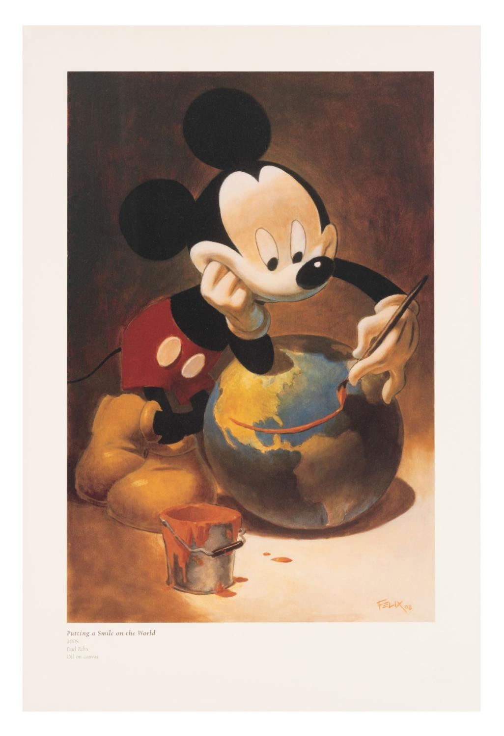 (Disney, 2008) A Mickey Mouse “Putting a Smile on the World” print by Paul Felix, given as a gift to Charter Members of the D23 fan club in 2008. Measuring 20" x 30" with an image size of 16" x 24" the print displays in fine condition with a 1" spot of wear to the top left edge.