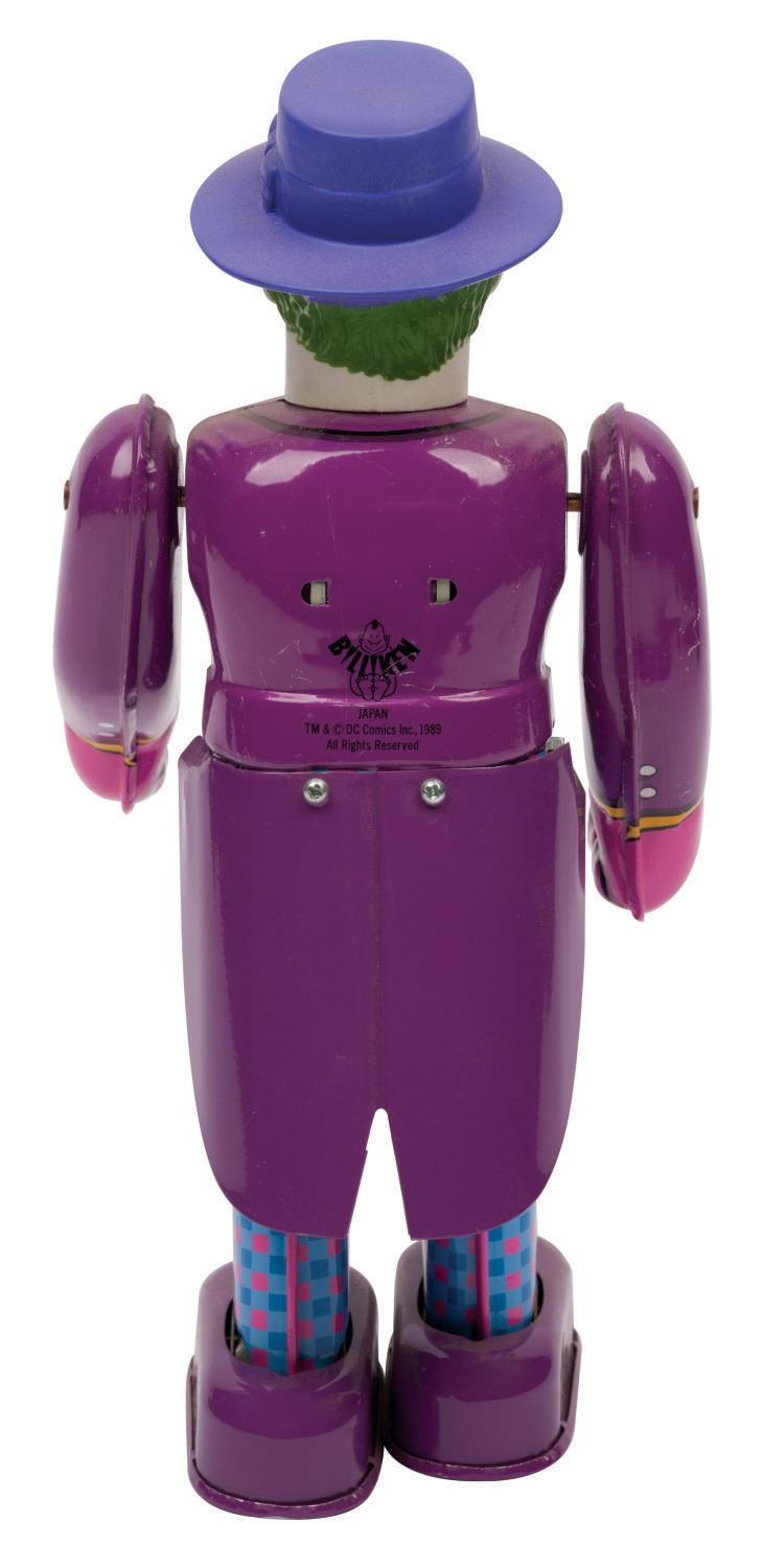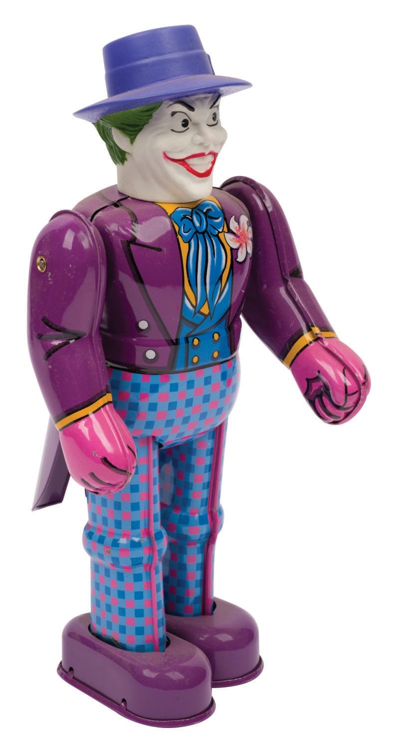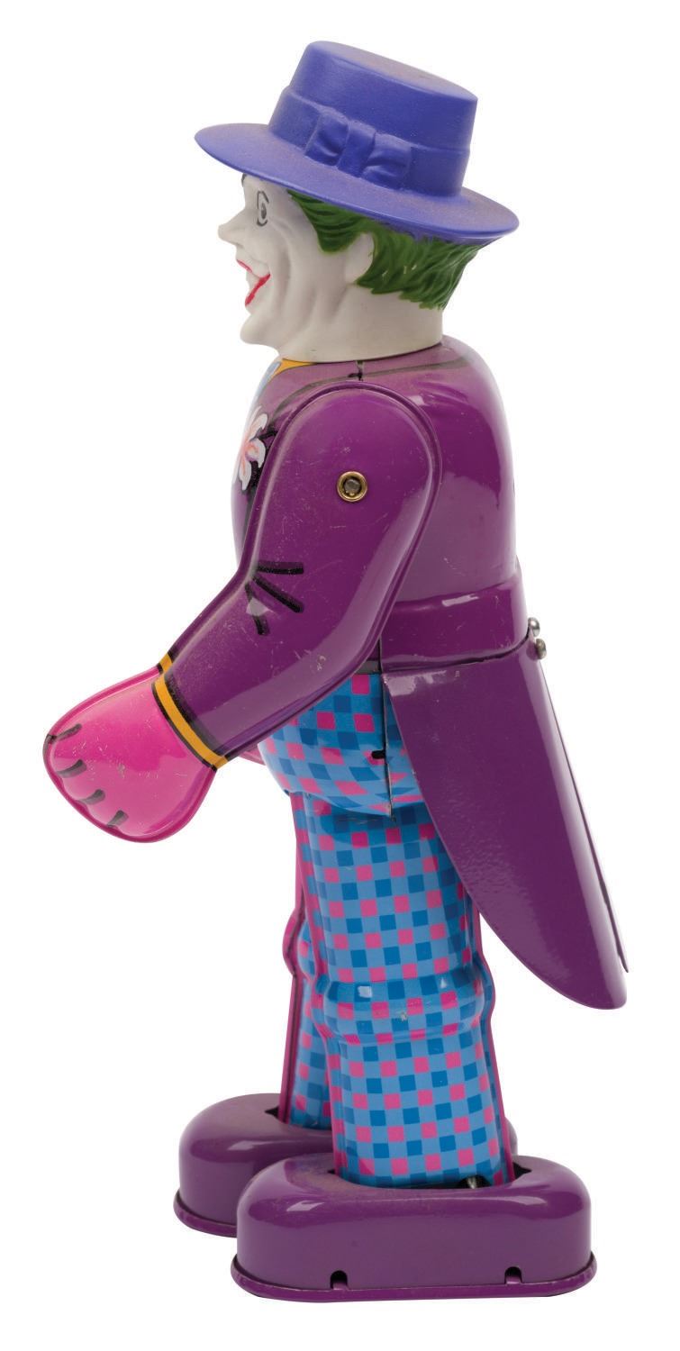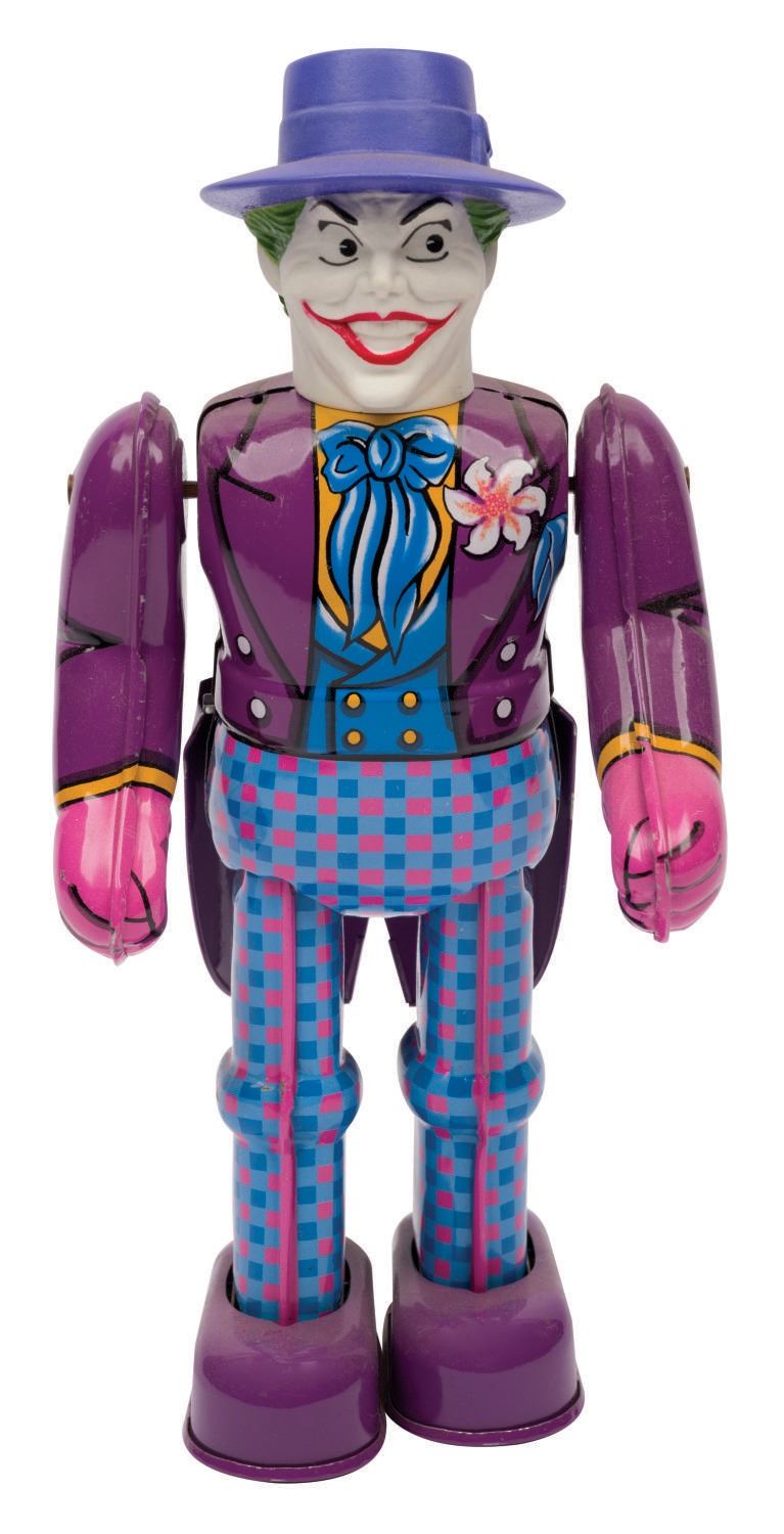 (Billiken, 1989) A 9" tall tin litho wind-up toy of Batman and an 8.5" tall tin litho wind-up toy of The Joker based on the 1989 "Batman" film starring Michael Keaton. The toys feature a tin litho body and a vinyl head. When wound, Batman and the Joker move forward and move their arms. These limited production toys are in very good condition with wear from display. Each comes with its 3.5"x4.5"x9.5" very good condition box. The original key is included with The Joker, which winds either toy. Both function well.