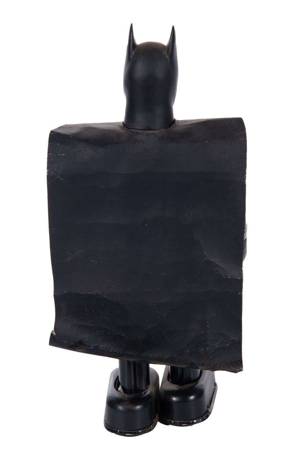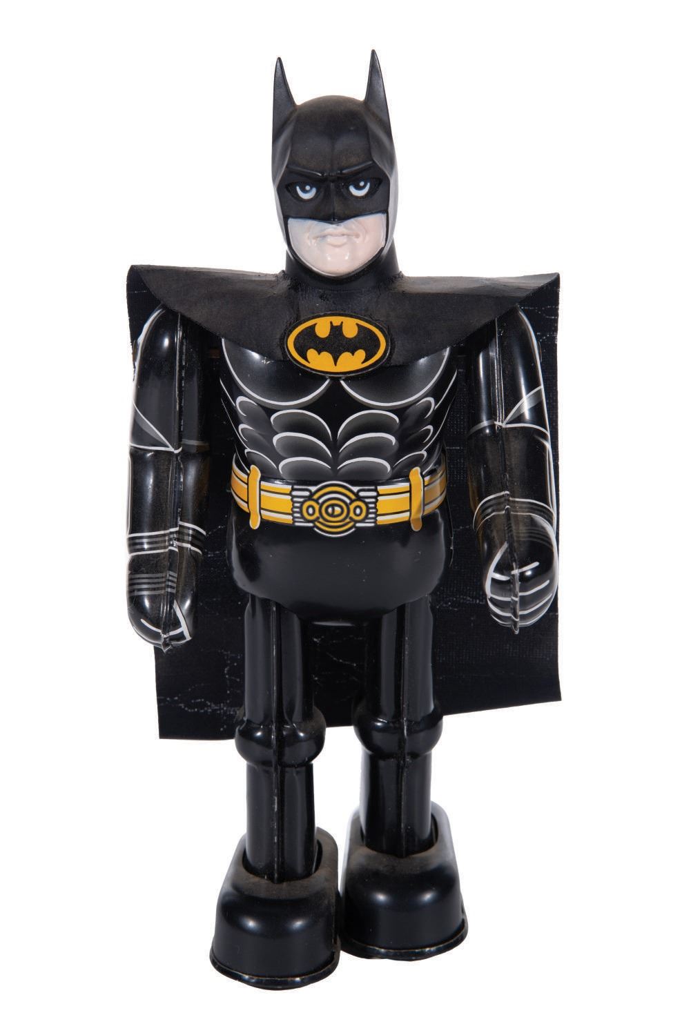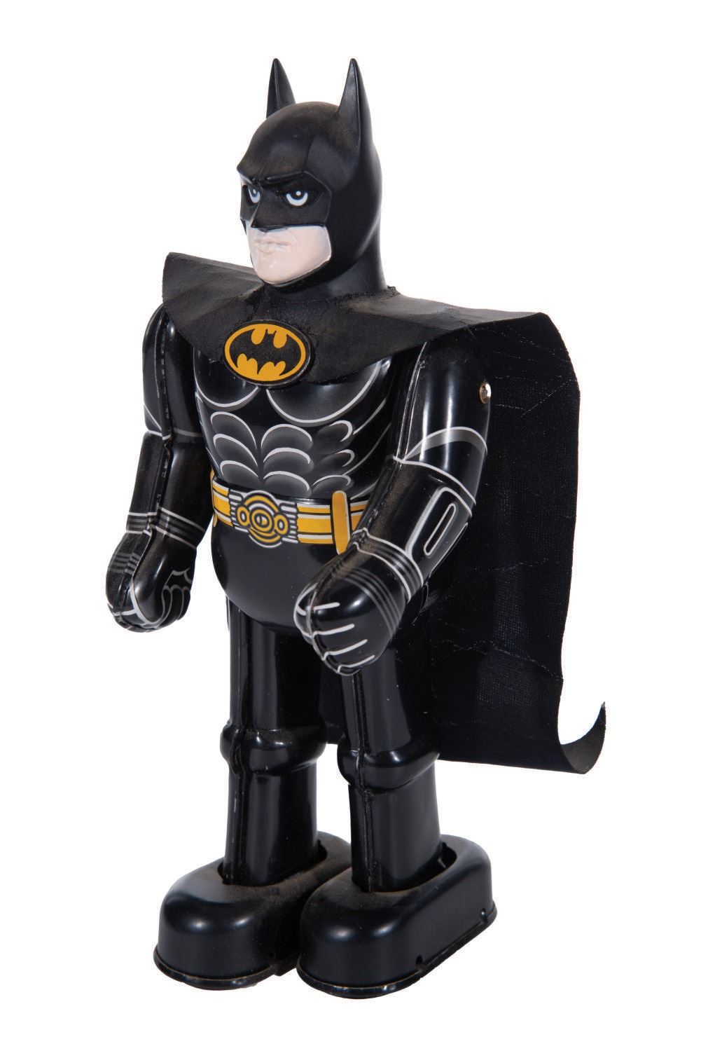 (Billiken, 1989) A 9" tall tin litho wind-up toy of Batman and an 8.5" tall tin litho wind-up toy of The Joker based on the 1989 "Batman" film starring Michael Keaton. The toys feature a tin litho body and a vinyl head. When wound, Batman and the Joker move forward and move their arms. These limited production toys are in very good condition with wear from display. Each comes with its 3.5"x4.5"x9.5" very good condition box. The original key is included with The Joker, which winds either toy. Both function well.