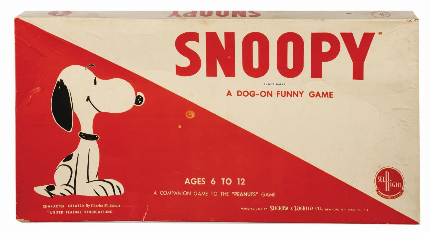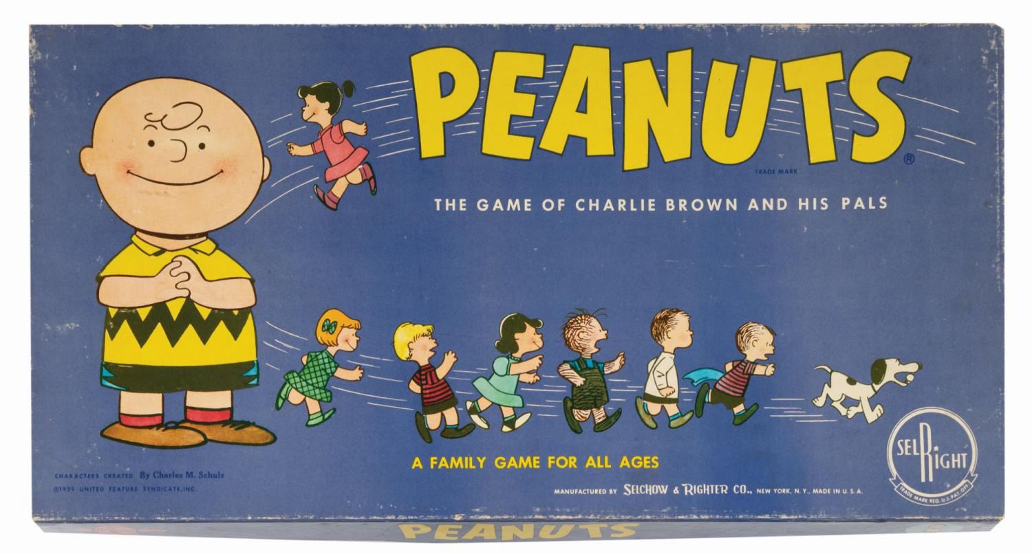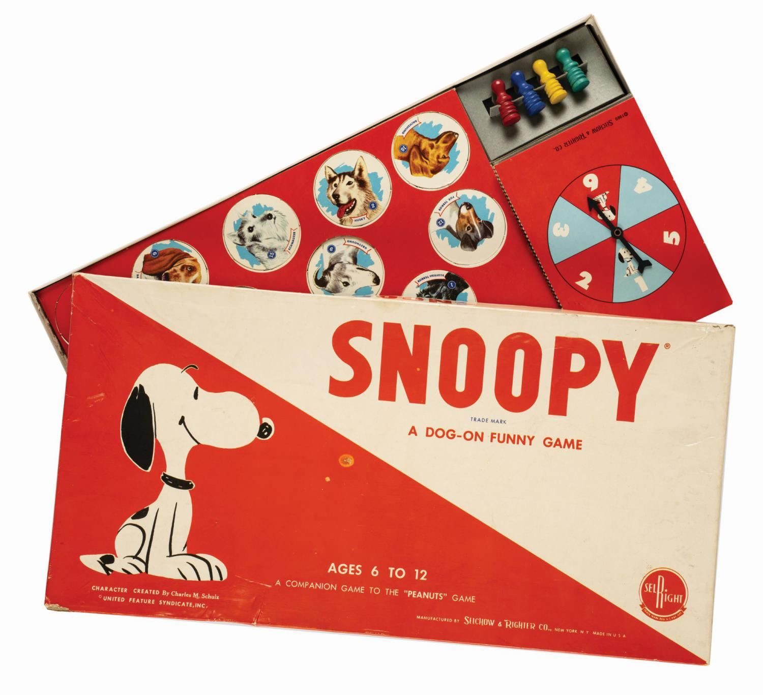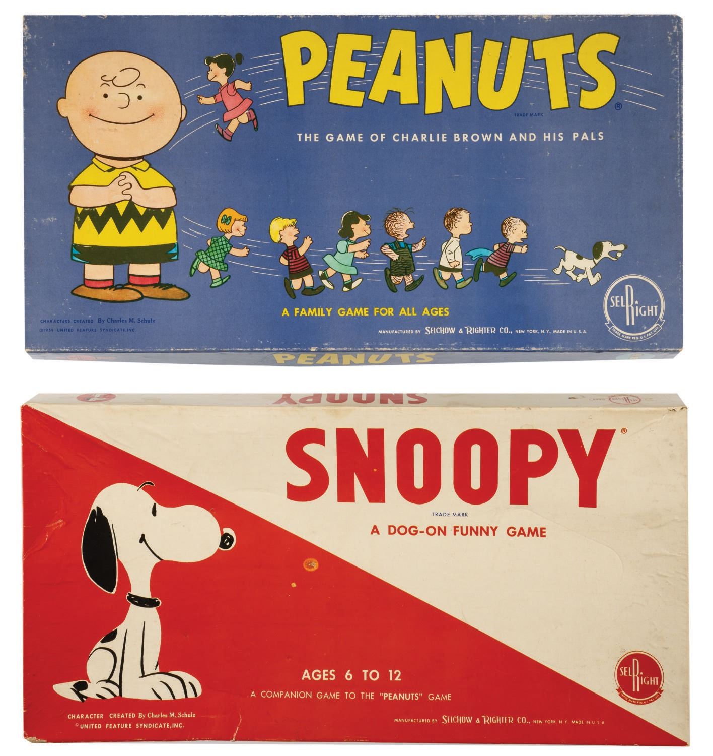 (SelRight, 1959/1960) A pair of Peanuts themed board games by Selchow & Righter Co. Both games are packaged inside a 18.75"x9.75" boxes and have all their pieces. Both are in very good condition with some creases, scuffs, and wear to the lids, edges, and corners of the boxes.