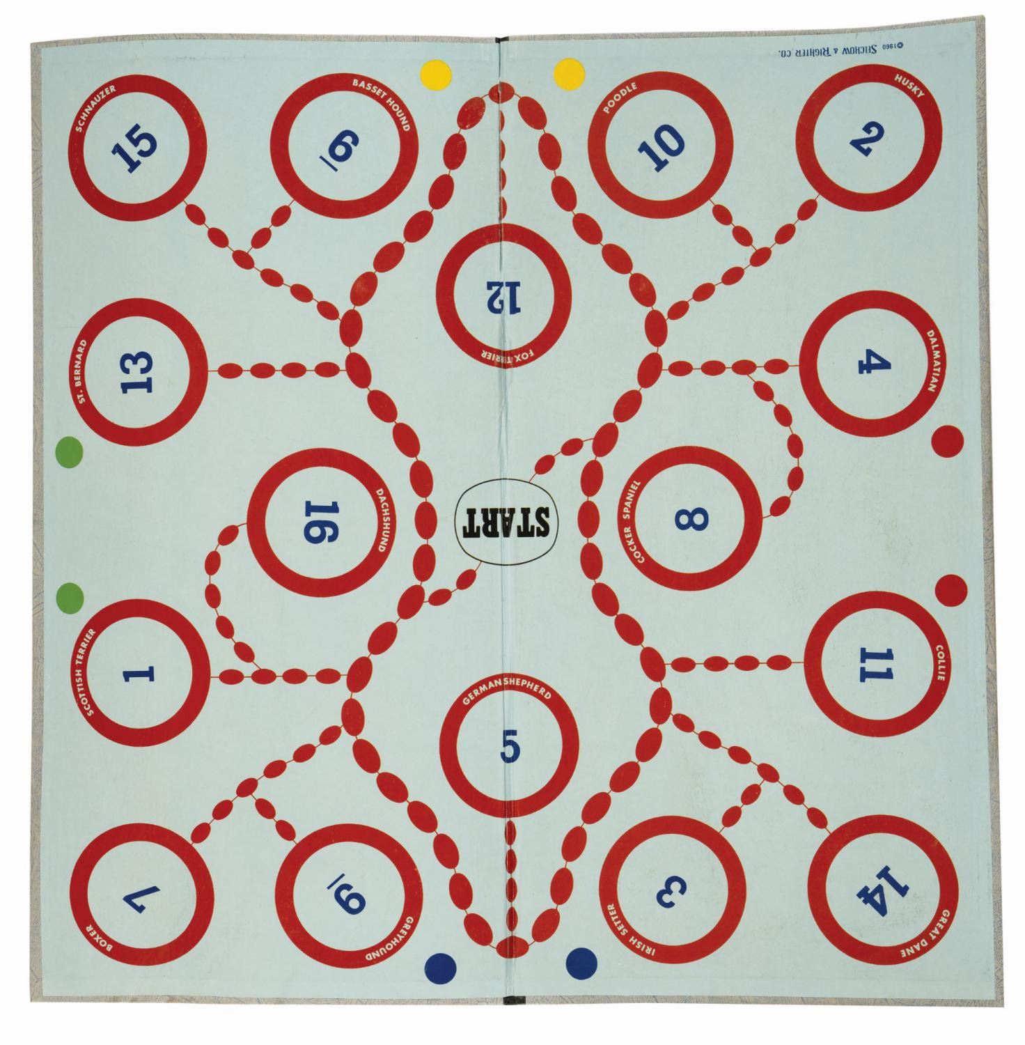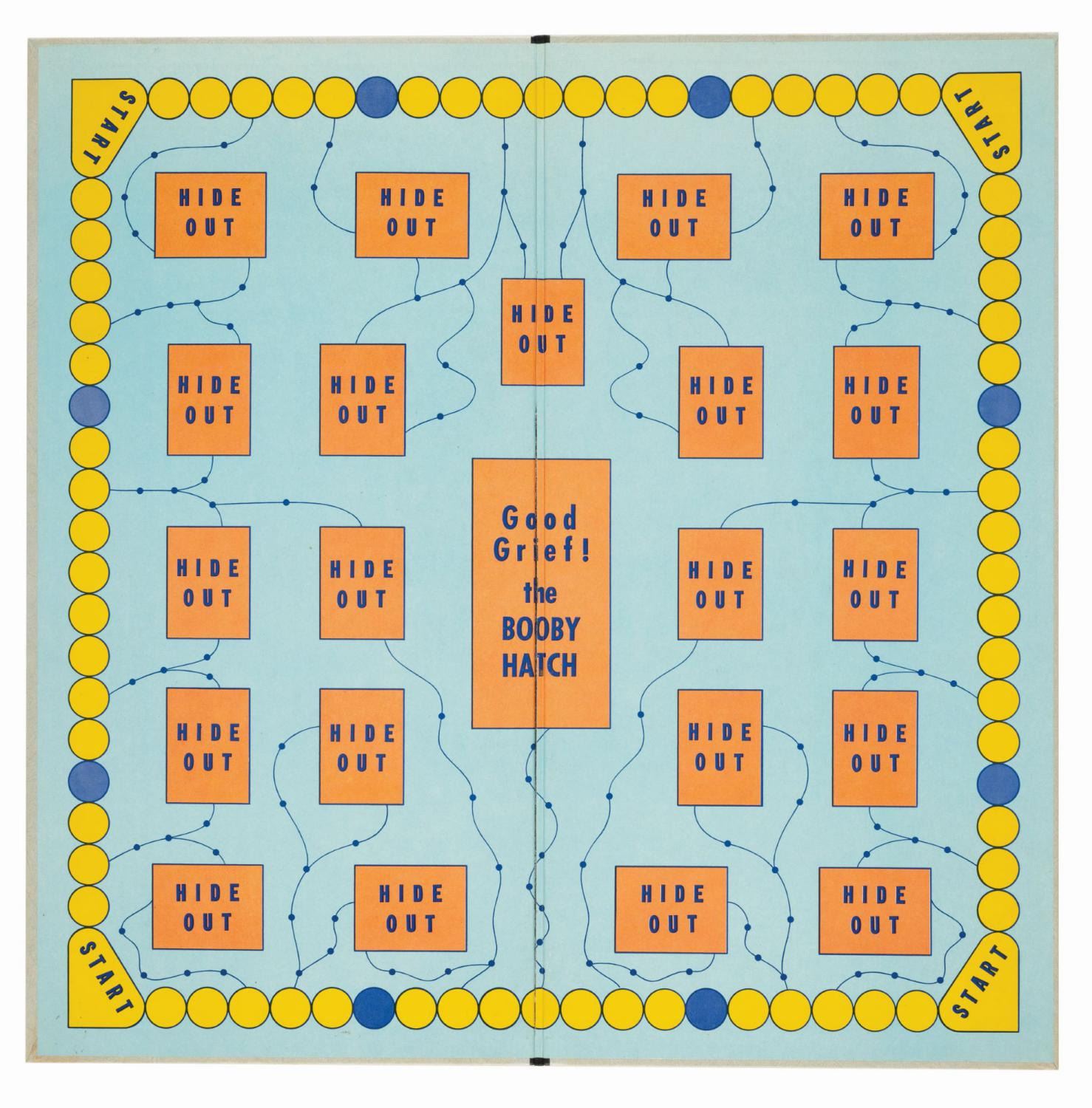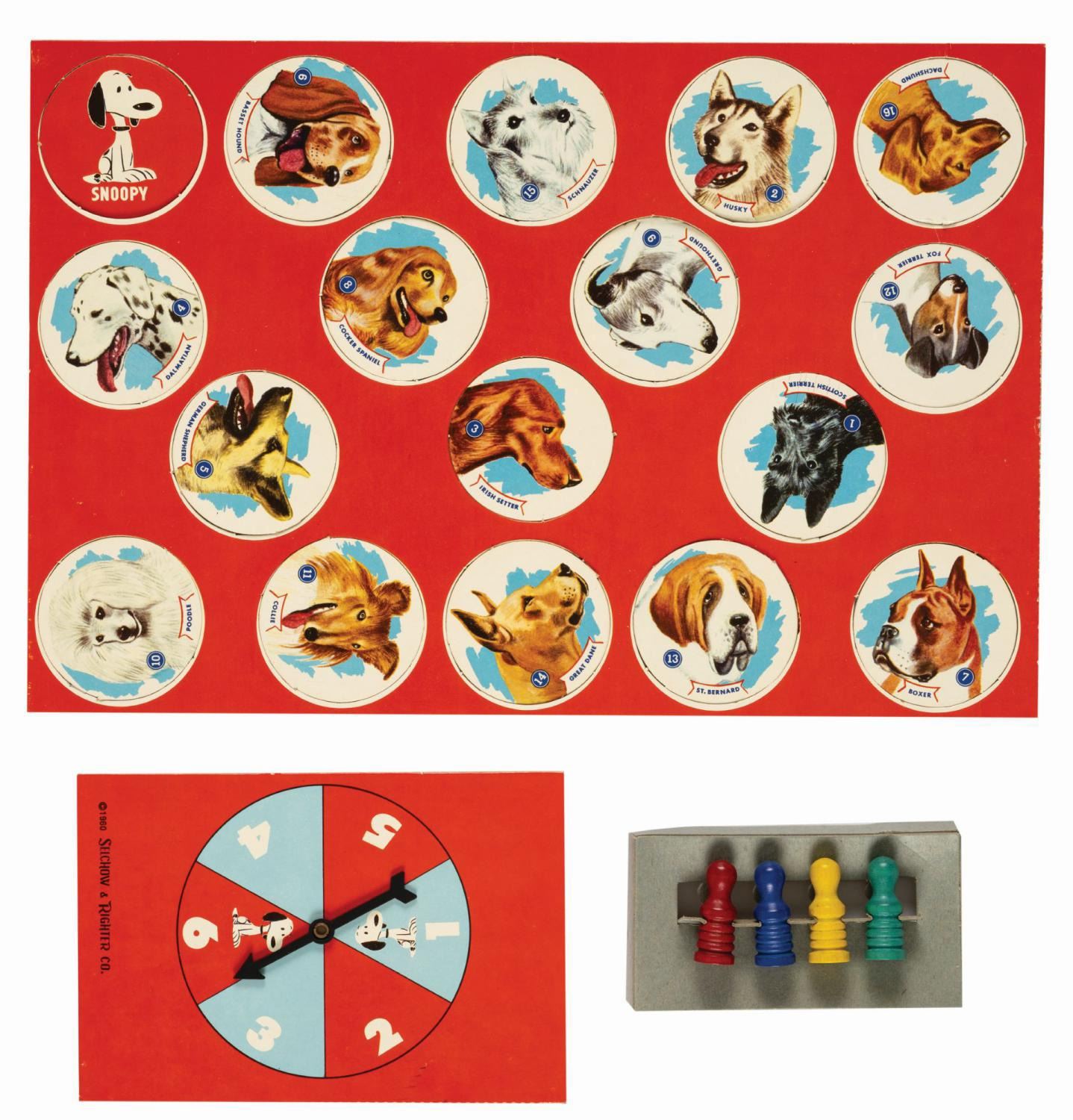(SelRight, 1959/1960) A pair of Peanuts themed board games by Selchow & Righter Co. Both games are packaged inside a 18.75"x9.75" boxes and have all their pieces. Both are in very good condition with some creases, scuffs, and wear to the lids, edges, and corners of the boxes.