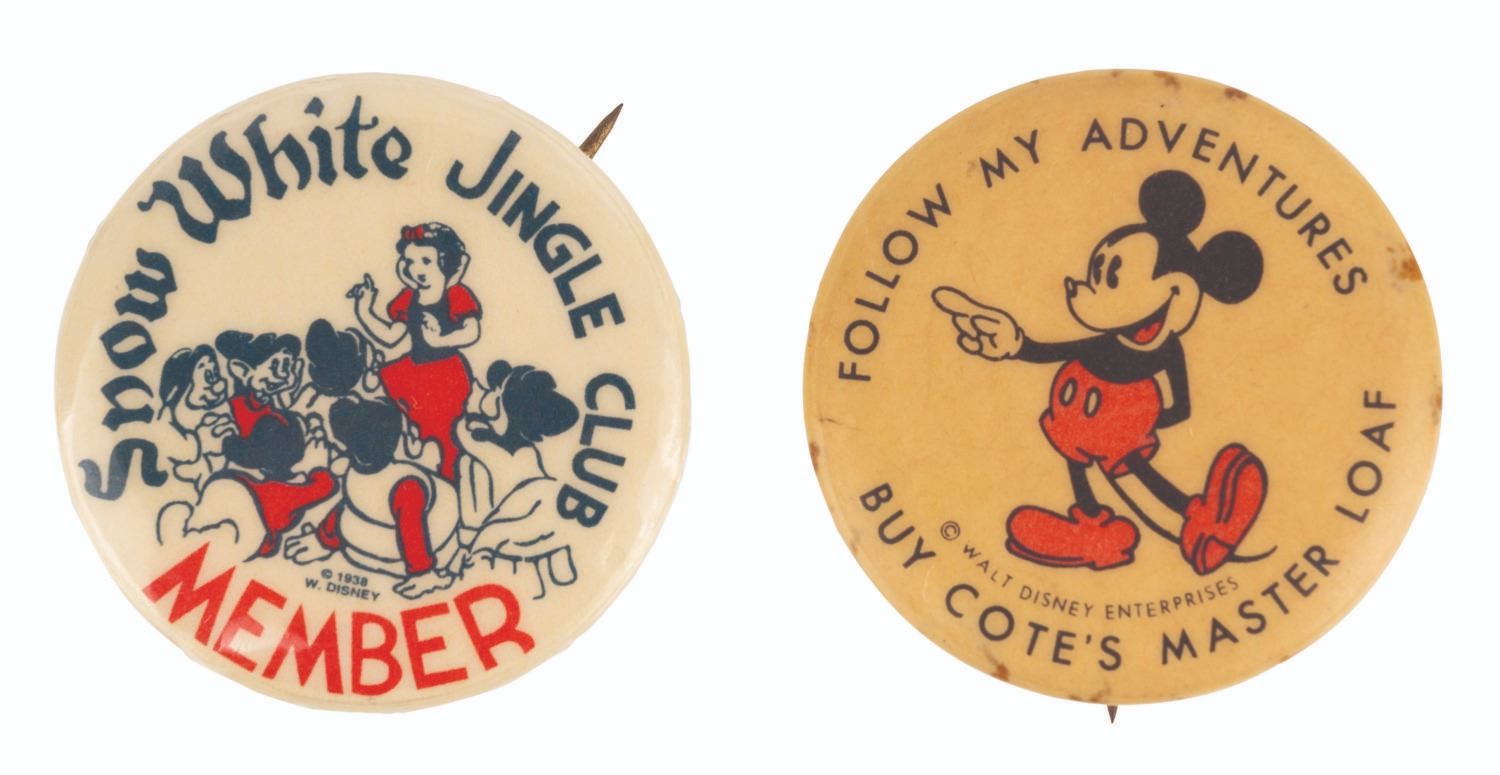 (Disney, 1930s) A pair of early Disney promotional buttons. The Snow White Jingle Club was sponsored by businesses like laundry services and bakeries, and Mickey Mouse also had promotional tie-ins with bakeries across the country in the 1930s. Each measuring 1.25” in diameter, the Snow White button is in very good condition with light wear, and the Mickey pin displays in good condition with light wear, and heavy oxidation to the back.