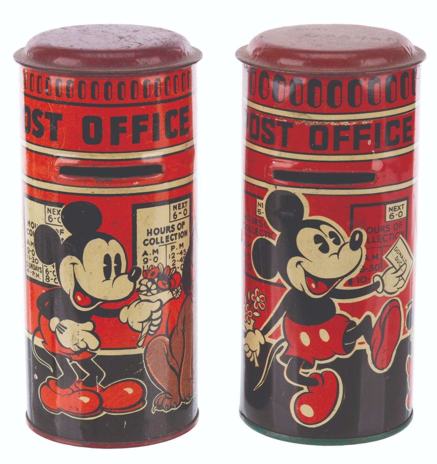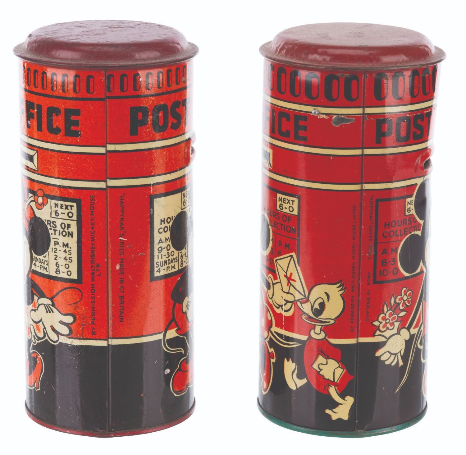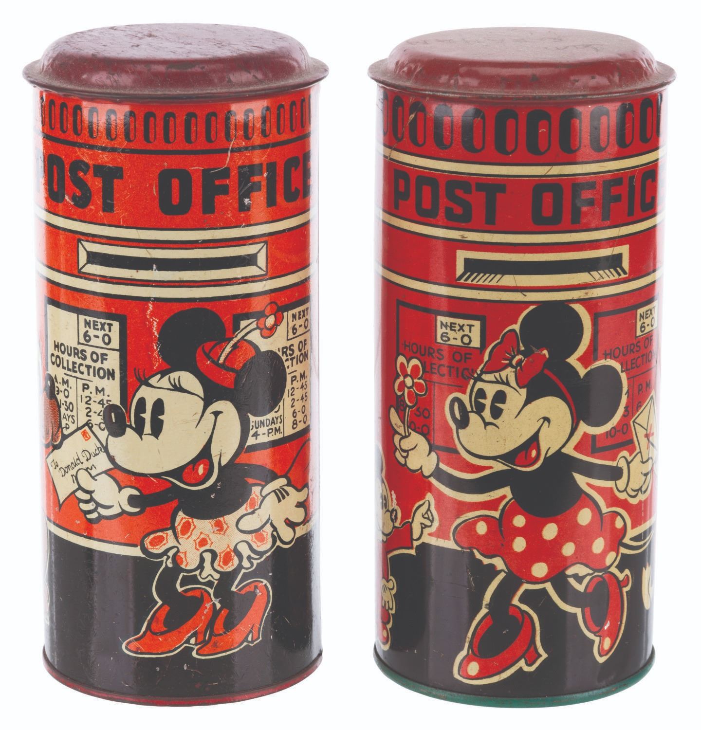 (Happynak, 1930s) A pair of tin litho Mickey and Minnie Mouse post office coin banks made in England by Happynak. One bank features Pluto while the other, Series No. 612, features one of Donald’s and one of Mickey’s nephews. Measuring 6" tall and 3" in diameter, the banks are in fair to good condition with heavy scratches, dents, oxidation from age, and a name engraved on one lid.