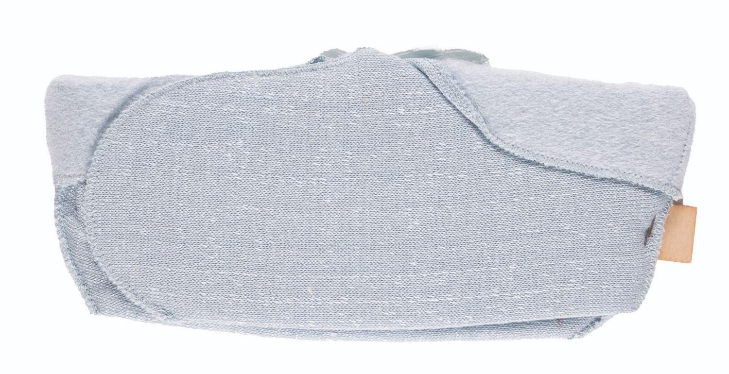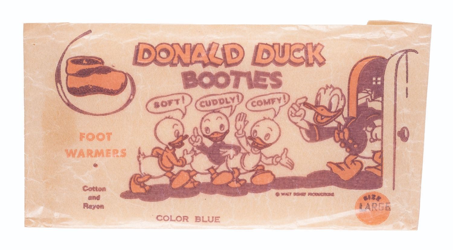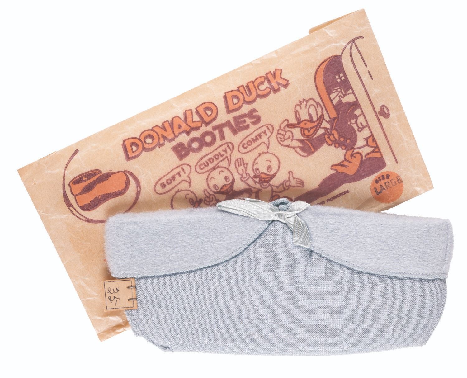 (Disney, 1940s) A pair of blue Donald Duck booties with the original envelope package. Labeled a size large, the cotton and rayon booties are in very good condition, with the envelope in good condition with creases throughout and discoloration from age.