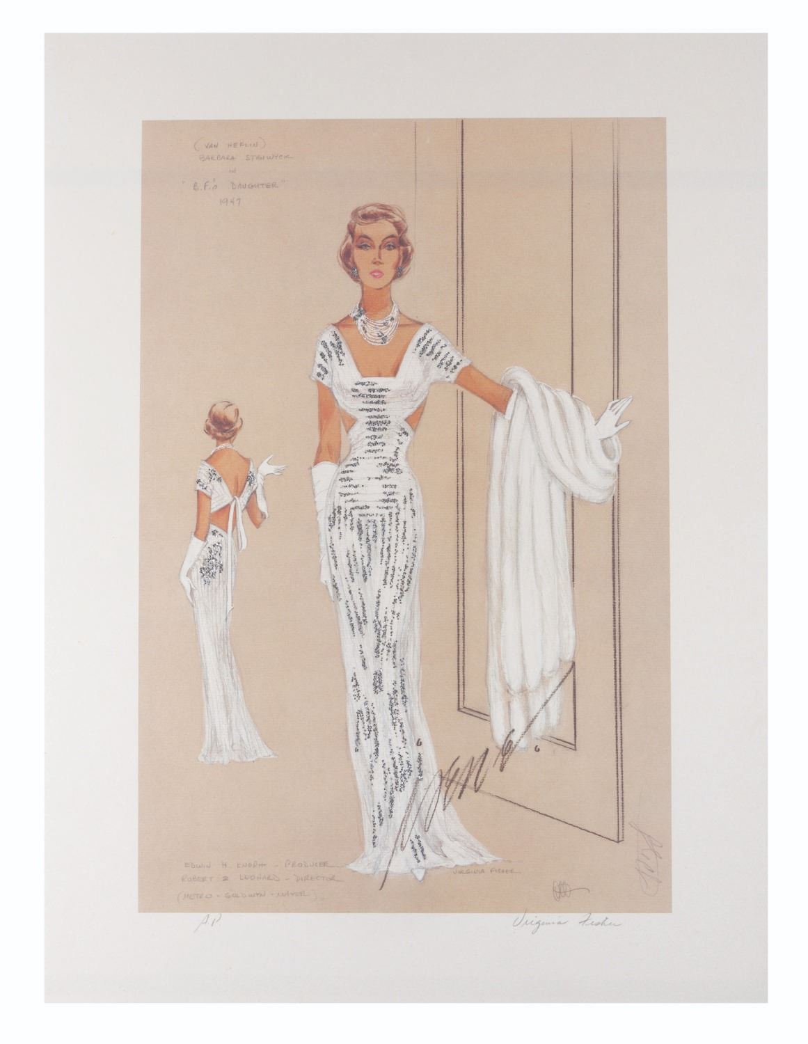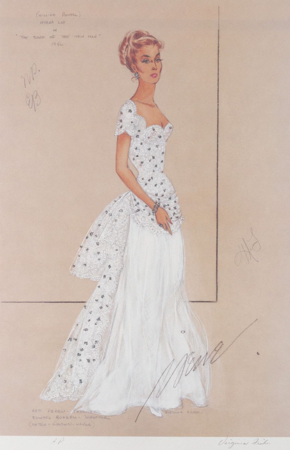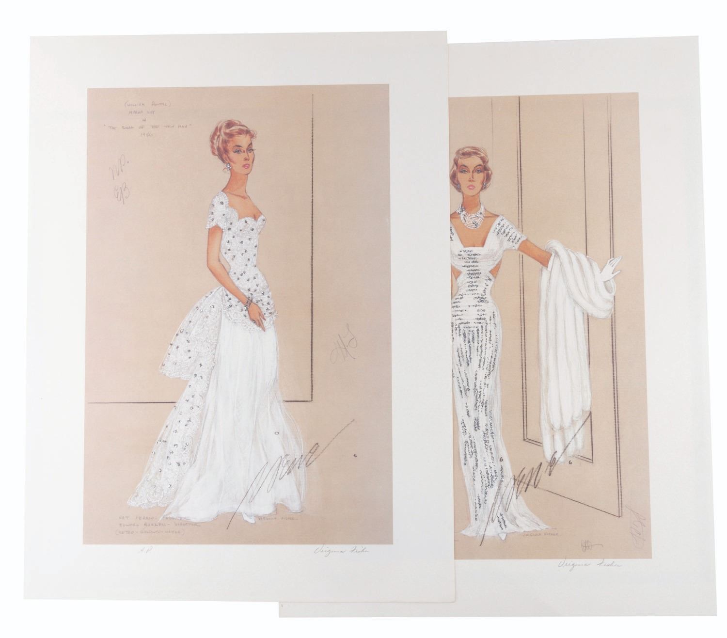 (Virginia Fisher, 1970s) A pair of lithographs of 1940s Hollywood costume designs by Virginia Fisher. Included are outfits for Myrna Loy in "The Song of the Thin Man” and Barbara Stanwyck in "B.F.’s Daughter.” These artist proofs are hand embellished with glitter accents and pencil inscriptions, including Fisher’s signature at the bottom right of each. With image sizes of 13” x 19.25” measuring 18” x 24” overall, the prints are in very good condition with stray marks and glitter from the production process.