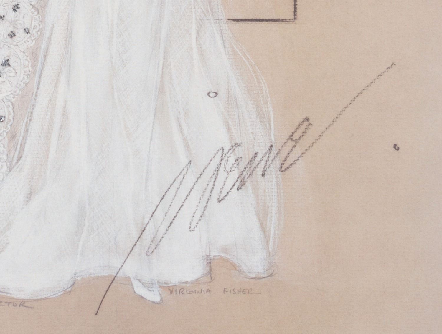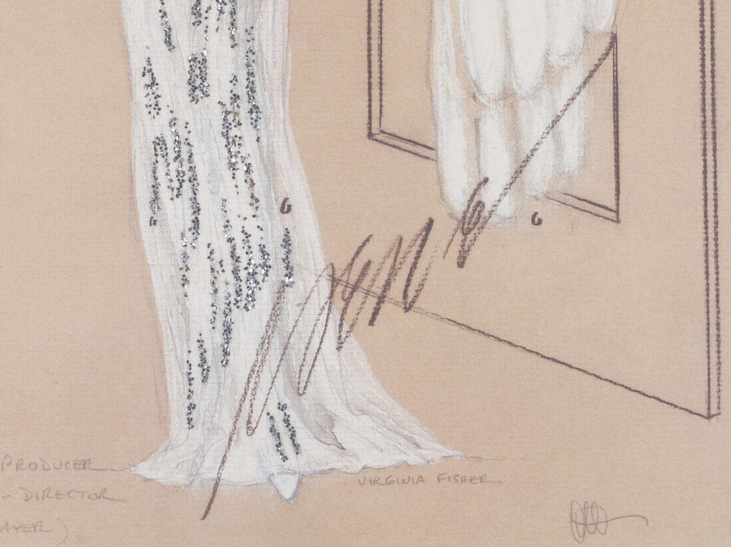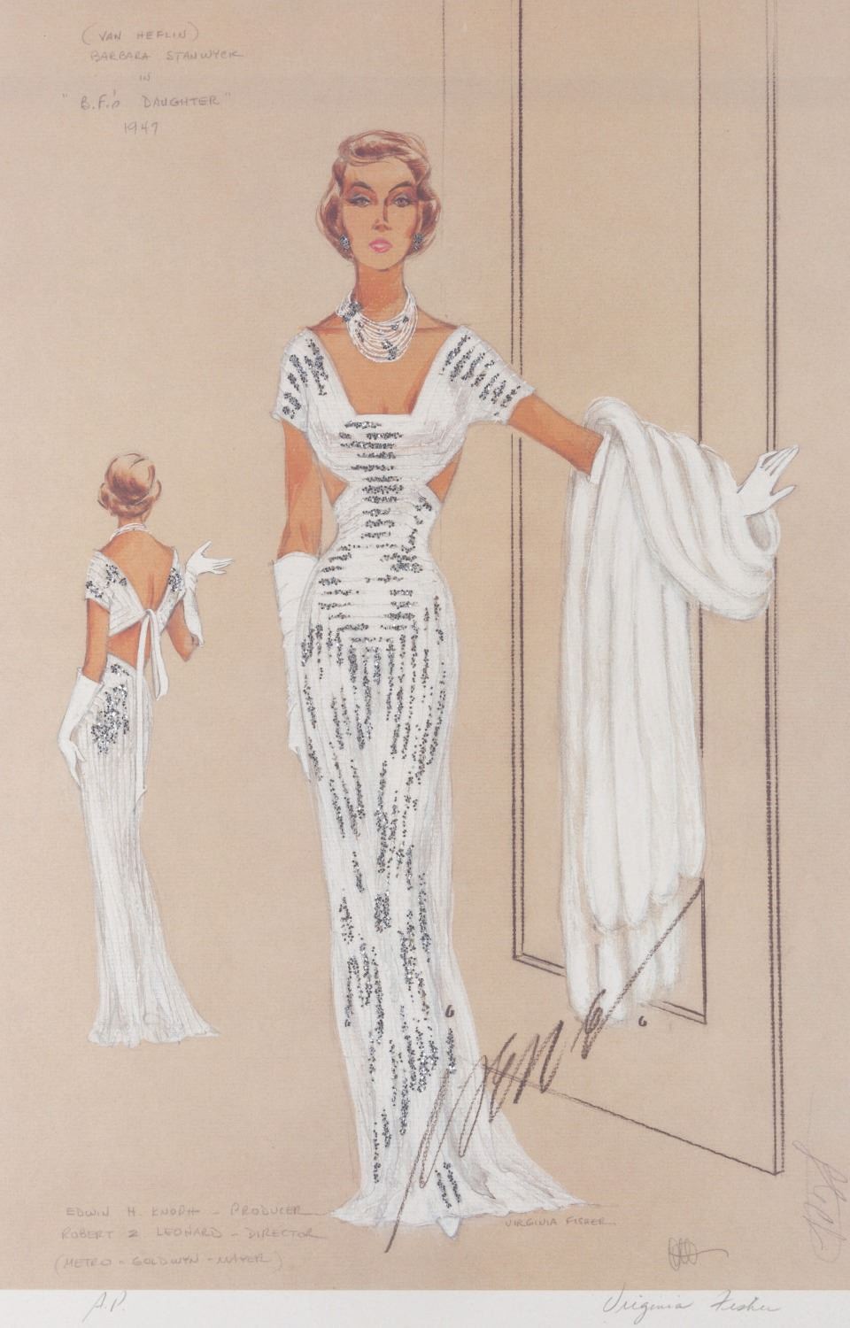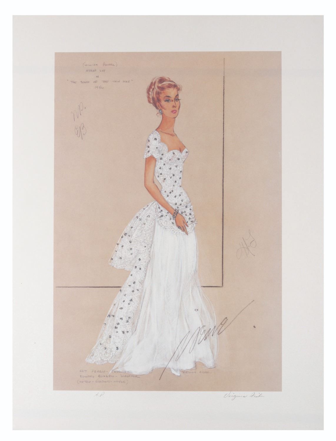 (Virginia Fisher, 1970s) A pair of lithographs of 1940s Hollywood costume designs by Virginia Fisher. Included are outfits for Myrna Loy in "The Song of the Thin Man” and Barbara Stanwyck in "B.F.’s Daughter.” These artist proofs are hand embellished with glitter accents and pencil inscriptions, including Fisher’s signature at the bottom right of each. With image sizes of 13” x 19.25” measuring 18” x 24” overall, the prints are in very good condition with stray marks and glitter from the production process.