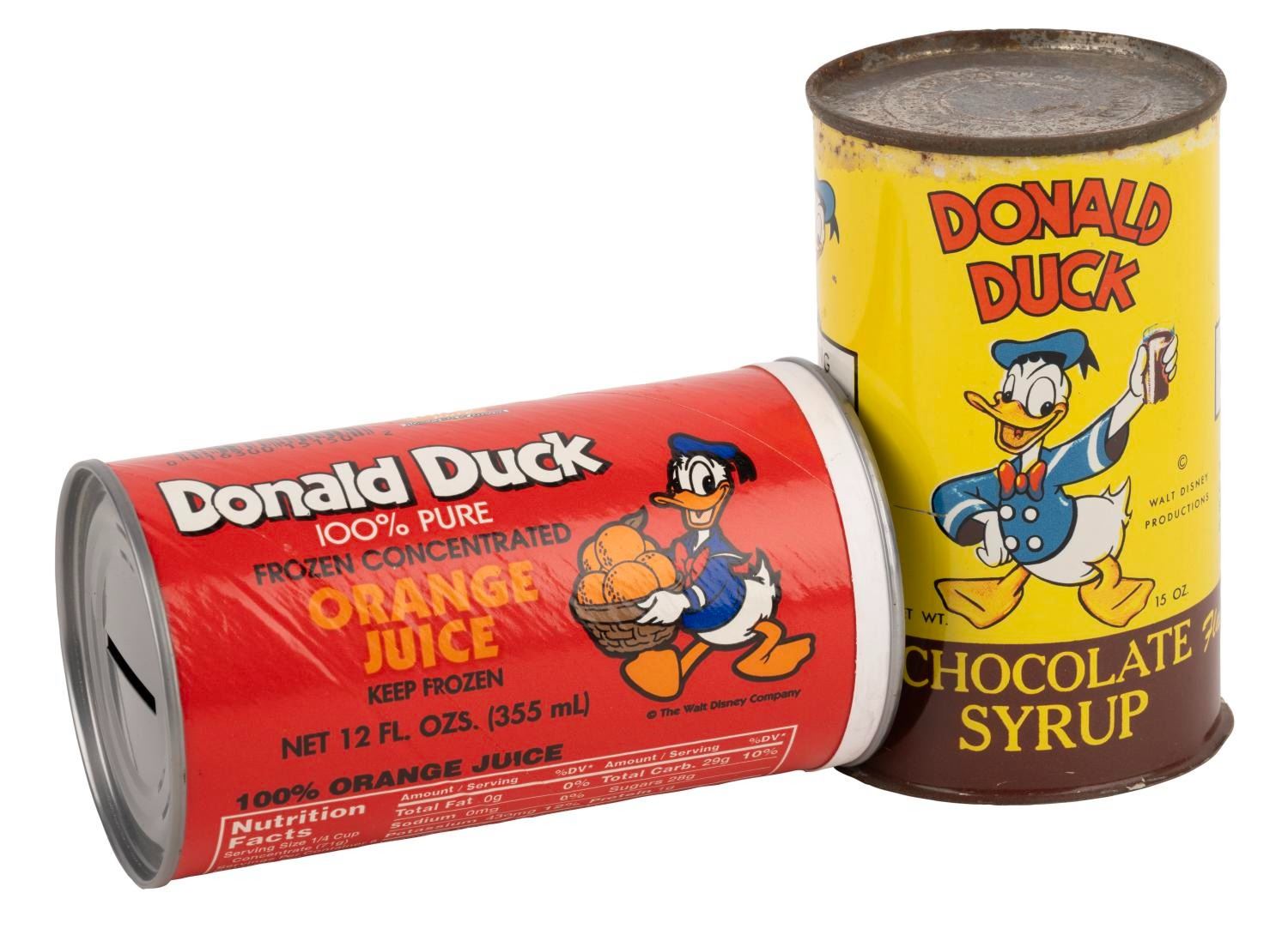 (Atlantic/Citrus World, 1950s) An Atlantic Chocolate Syrup can and a Citrus World Orange Juice can, featuring Donald Duck. The chocolate syrup can's lid is missing, while the orange can's lid has a slit and was used as a coin bank. Each measuring 4.5" and 4.75" tall, and 2.75" in diameter, the cans are in good condition, exhibiting few dents, spots of discoloration, minor oxidation, scuffs, and wear.