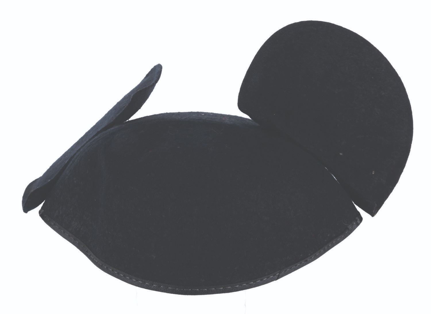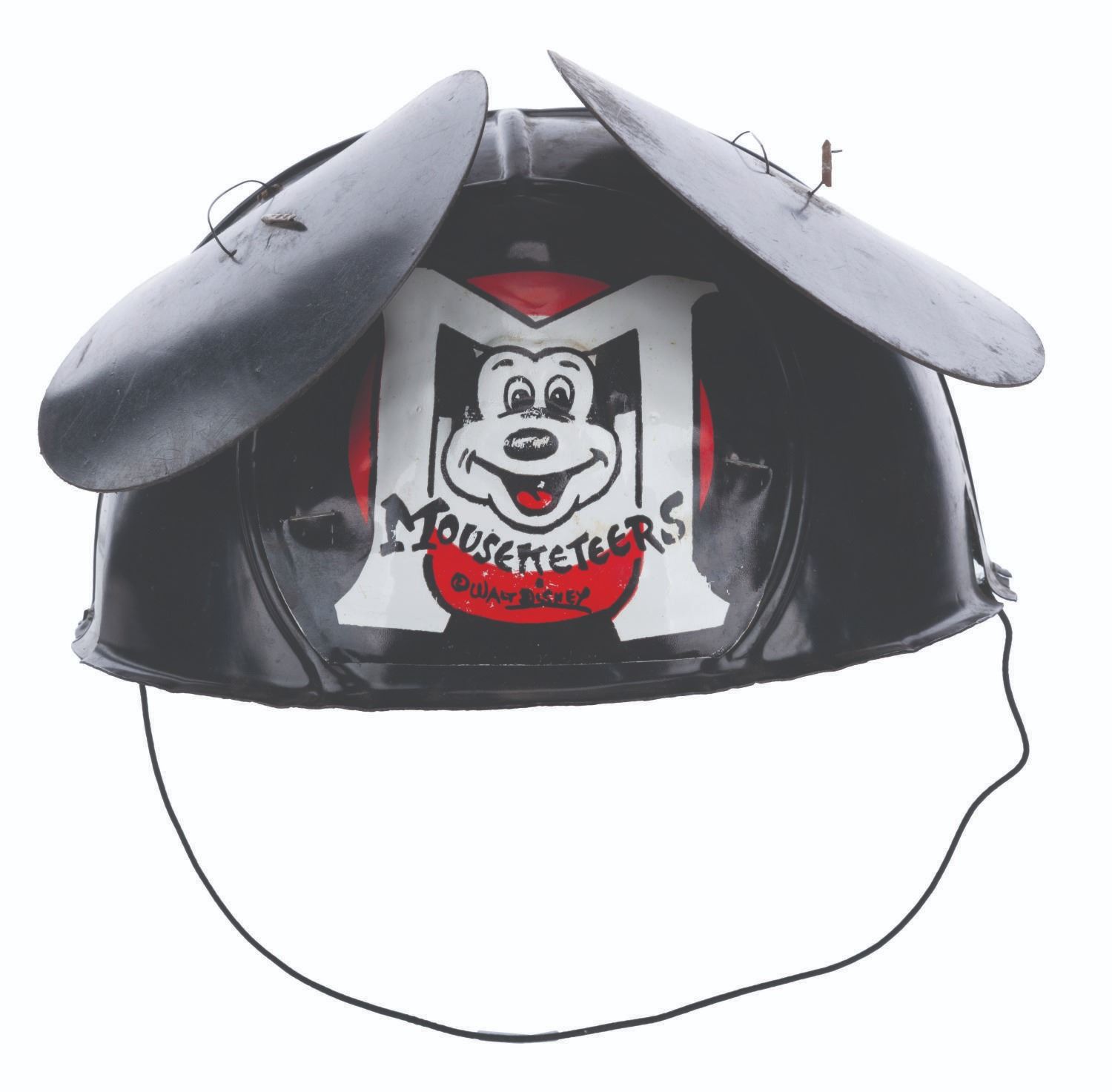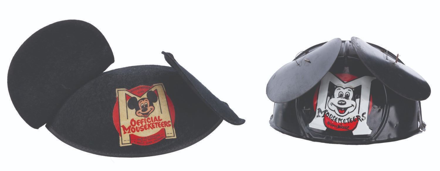 (Benay Albee/ Welded Plastics Co., 1950s) A plastic Mouseketeers Wiggle Ears Hat manufactured by Welded Plastics Corp and a felt Mouseketeers ear hat manufactured by Benay Albee. The plastic hat is in fair condition with heavy wear, paint loss, and cracks as long as 2.75”, while the felt hat is in good condition with light wear and heavy discoloration from age.