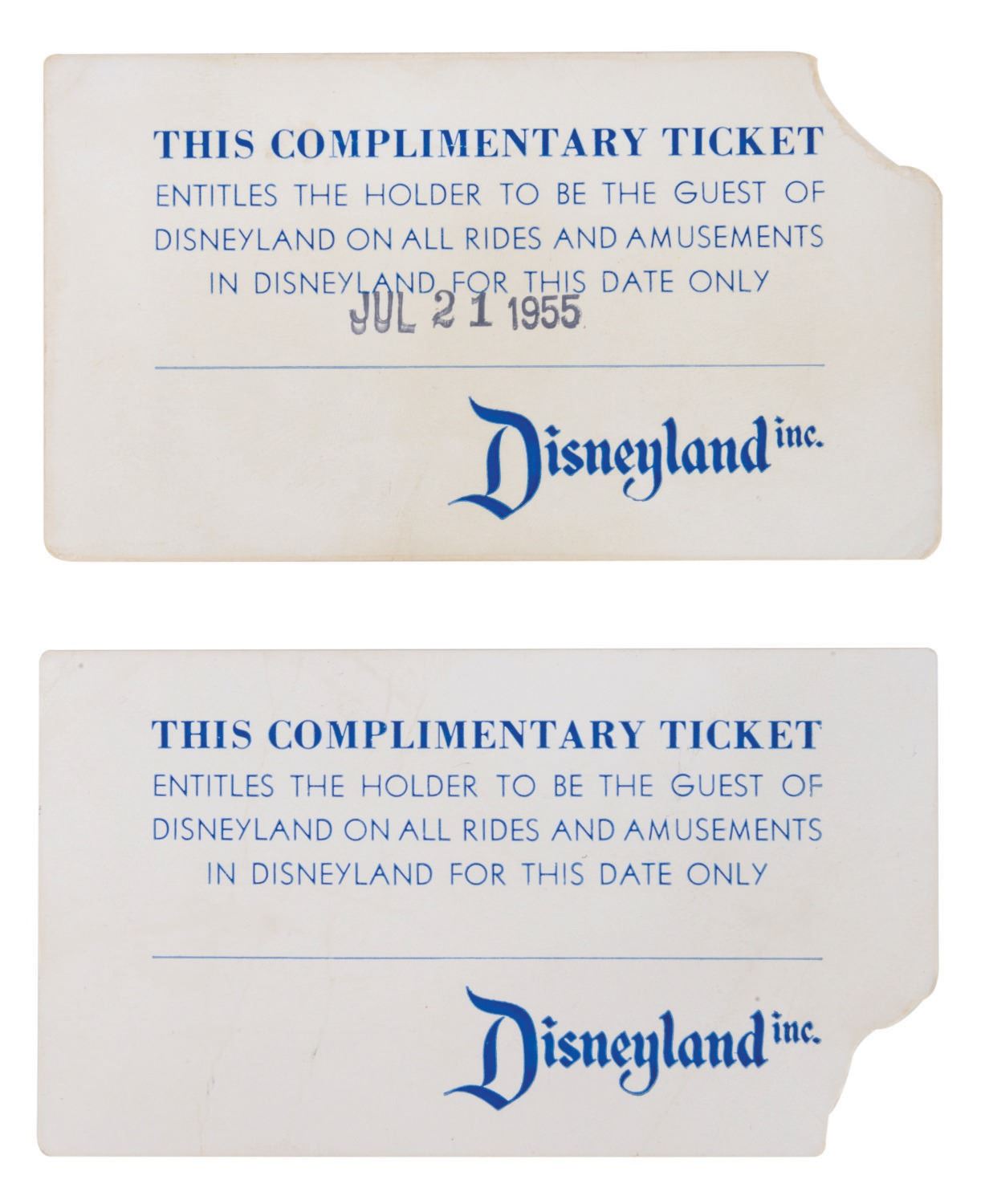 (Disneyland, 1955) A pair of the earliest complimentary tickets to Disneyland. These tickets granted both access to the Park and admission to all rides, which were usually individually ticketed. One is blank while the other is stamped July 21 1955, used during the first week of the Park's opening. Measuring 2.25"x4" each, both are in very good condition, with light wear from handling, and a single corner intentionally torn off each during original use.