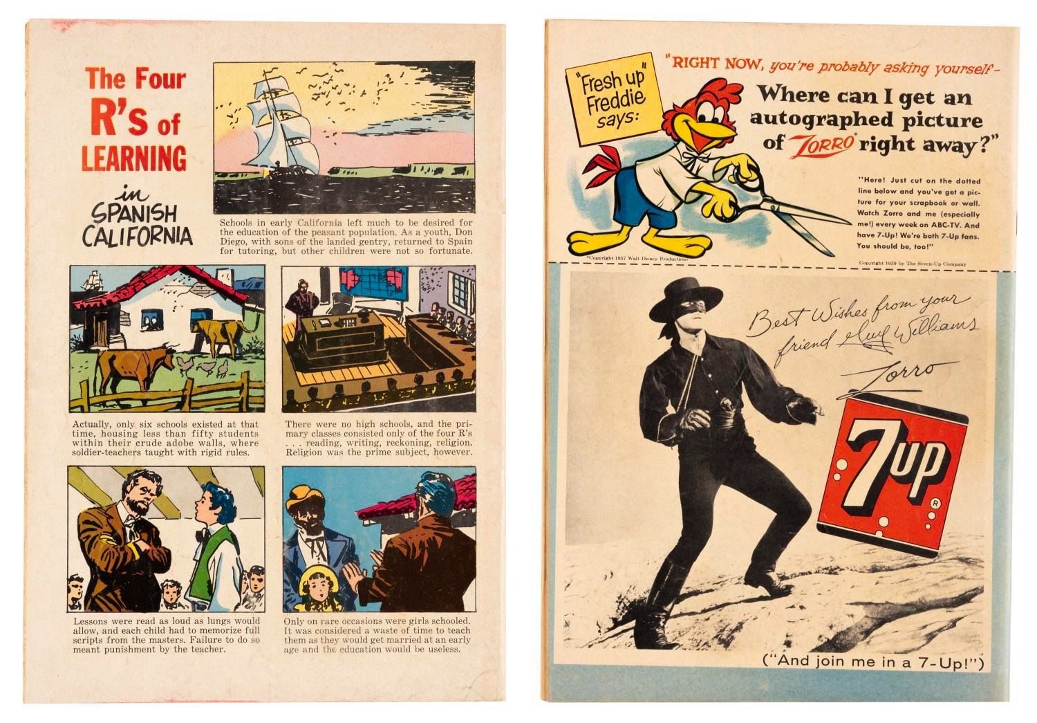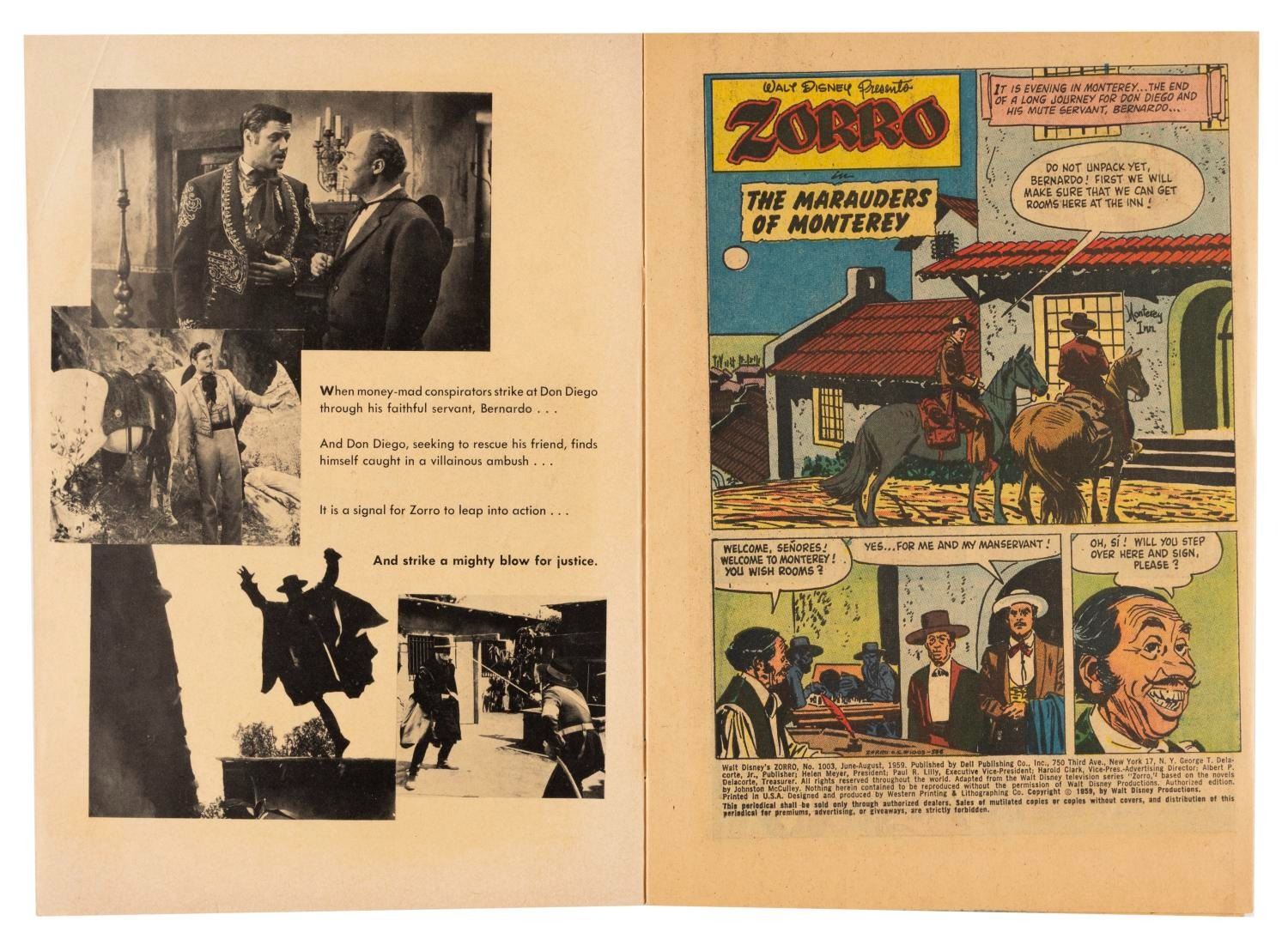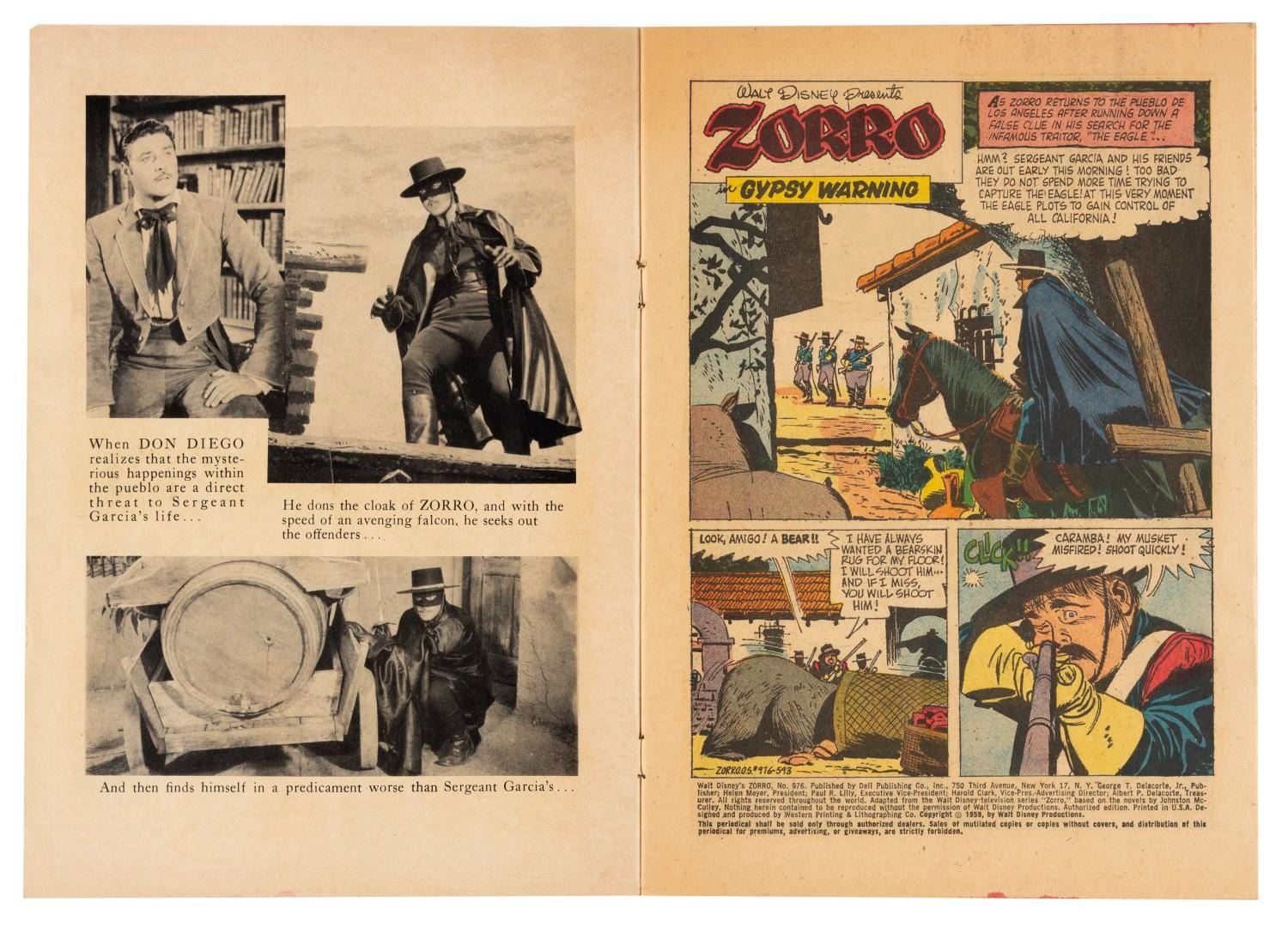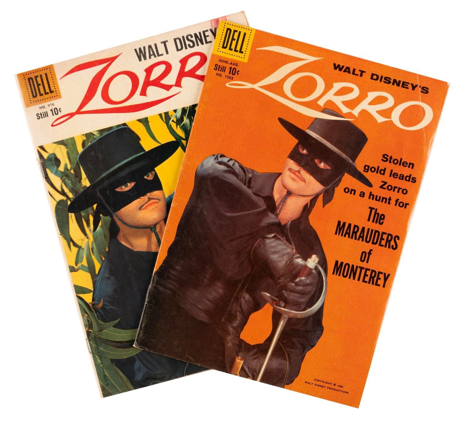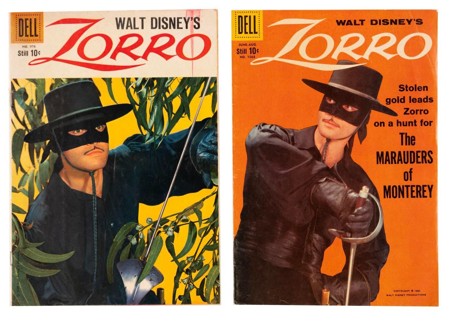 (Dell, 1959) A pair of "Zorro" comic books featuring Guy Williams on the cover, published in 1959. The comic books are in good condition, with typical handling wear, and a stain to one cover.