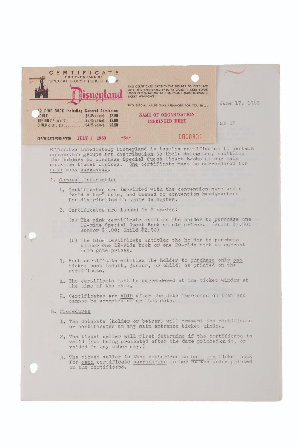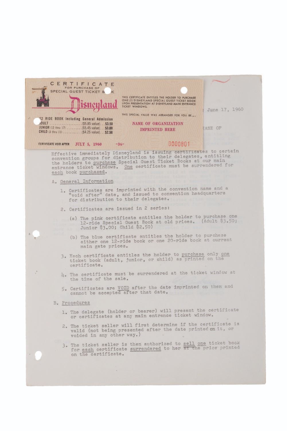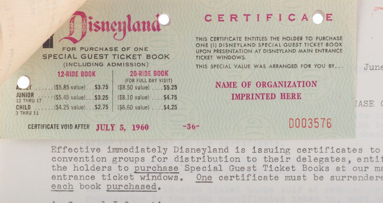 (Disneyland, 1960) Two sample certificates and a letter regarding the correct procedure for exchanging certificates for Special Guest ticket books. The certificates measure 2.5 " x 6.5 " and the letter 8.5 " x 11 ", all displaying in very good condition with light edge wear, tears at the hole punches, spots of discoloration, a stray red mark at the top of the page, and oxidation from age on the staple.