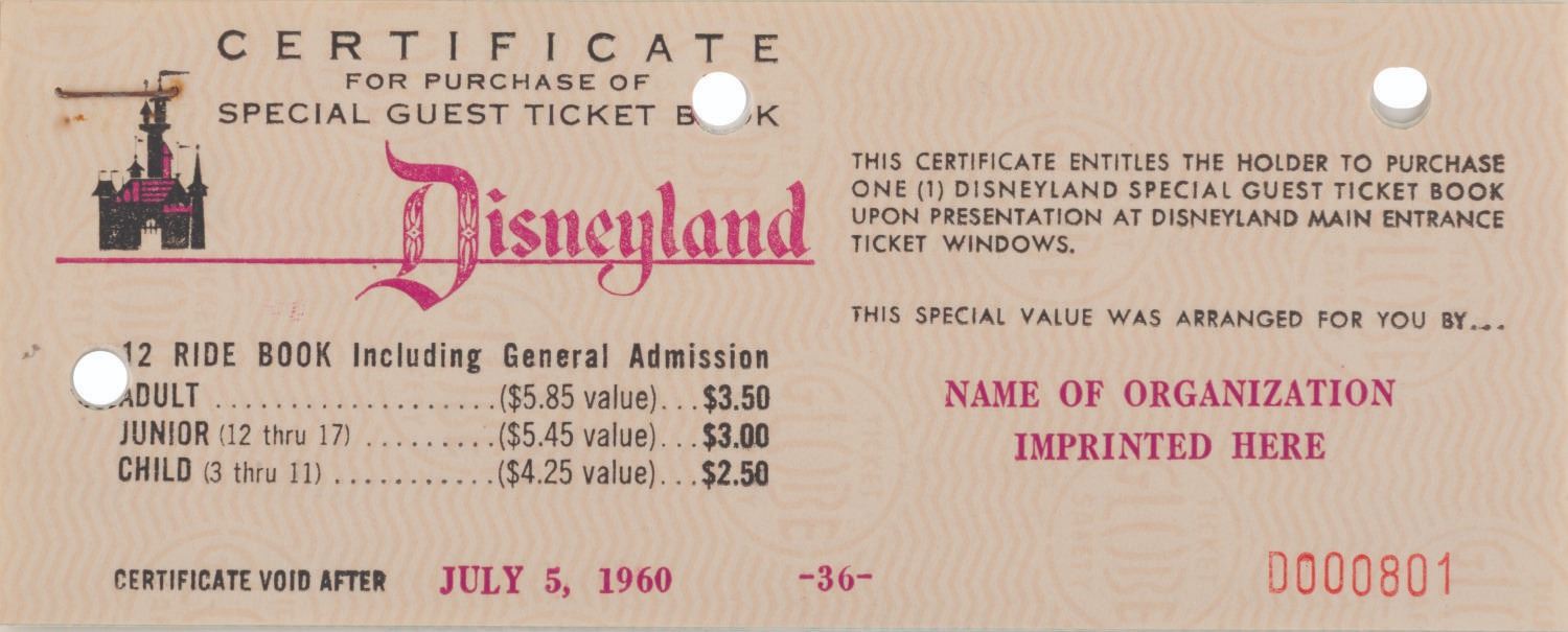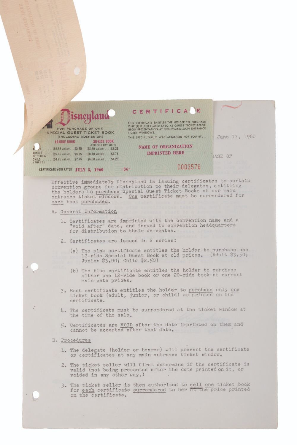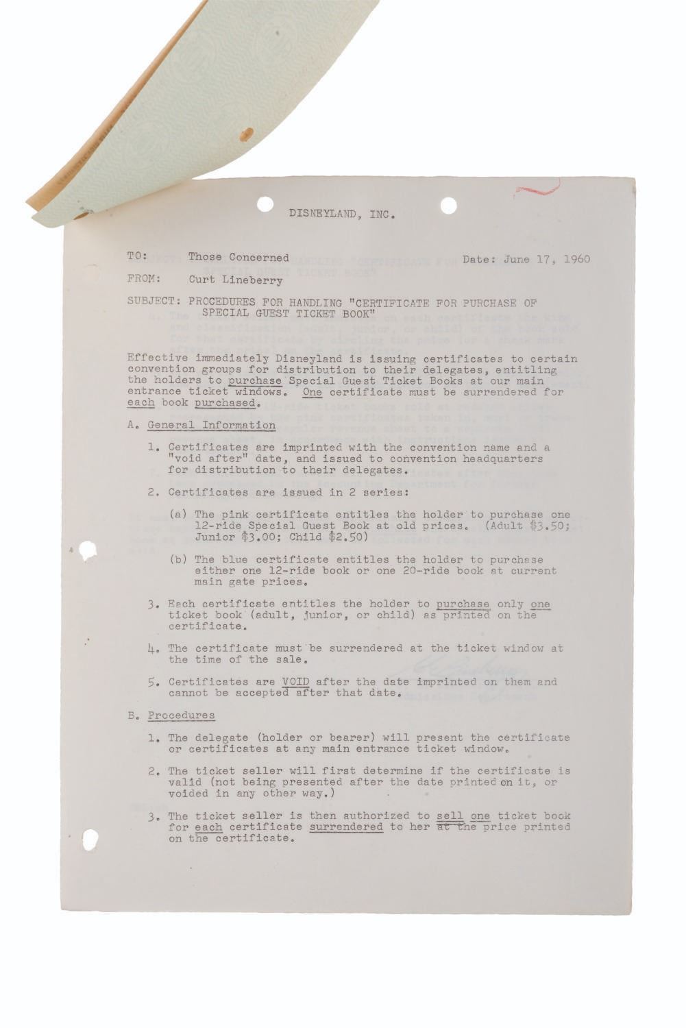 (Disneyland, 1960) Two sample certificates and a letter regarding the correct procedure for exchanging certificates for Special Guest ticket books. The certificates measure 2.5 " x 6.5 " and the letter 8.5 " x 11 ", all displaying in very good condition with light edge wear, tears at the hole punches, spots of discoloration, a stray red mark at the top of the page, and oxidation from age on the staple.