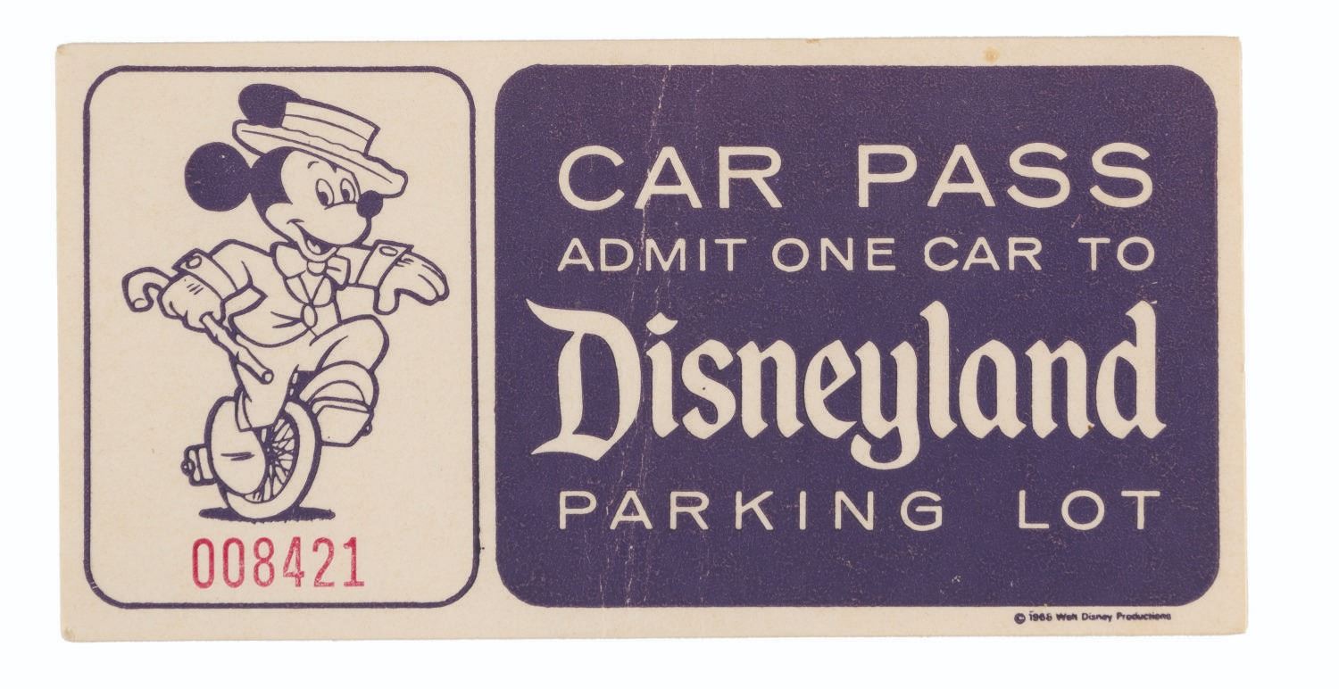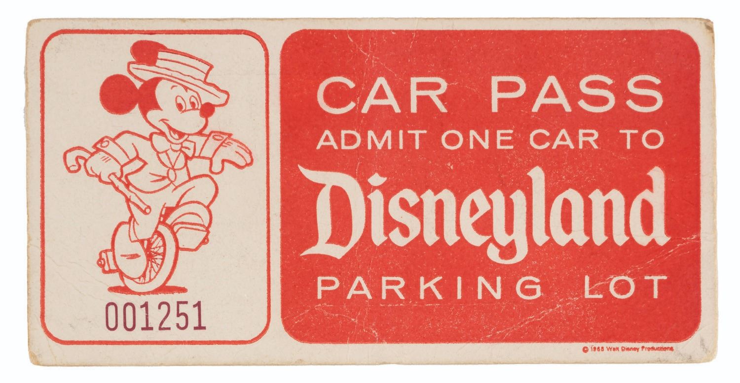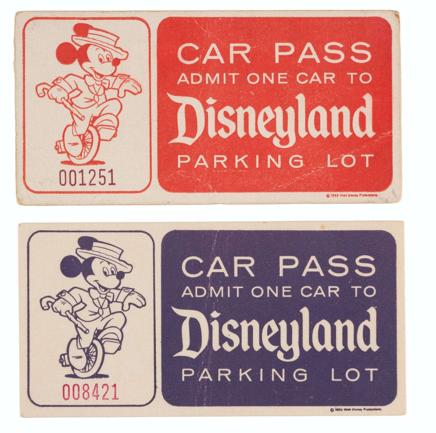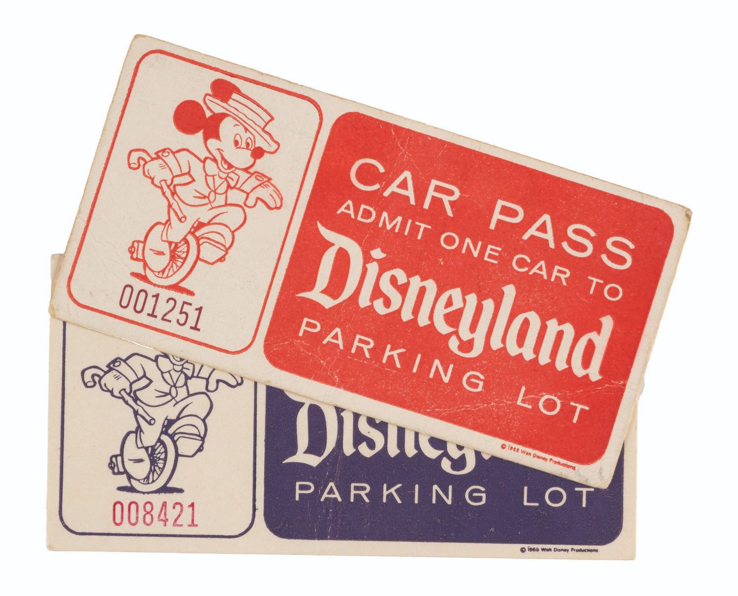 (Disneyland, 1966-68) A pair of Disneyland Car Passes from 1966 and 1968, numbered 008421 and 001251, respectively. Measuring 2" x 4" each, the passes display in good condition with creases, edge wear, light soiling, and light discoloration from age.