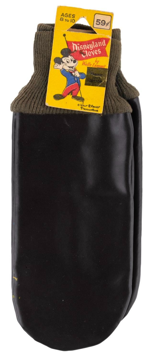 (Disneyland, 1960s) An unused pair of leatherette Disneyland Gloves with the original paper hangtag. Measuring 3.5” x 9” for ages 8-10, the gloves are in very good condition with light wear to the leatherette and wear and creasing to the hangtag.