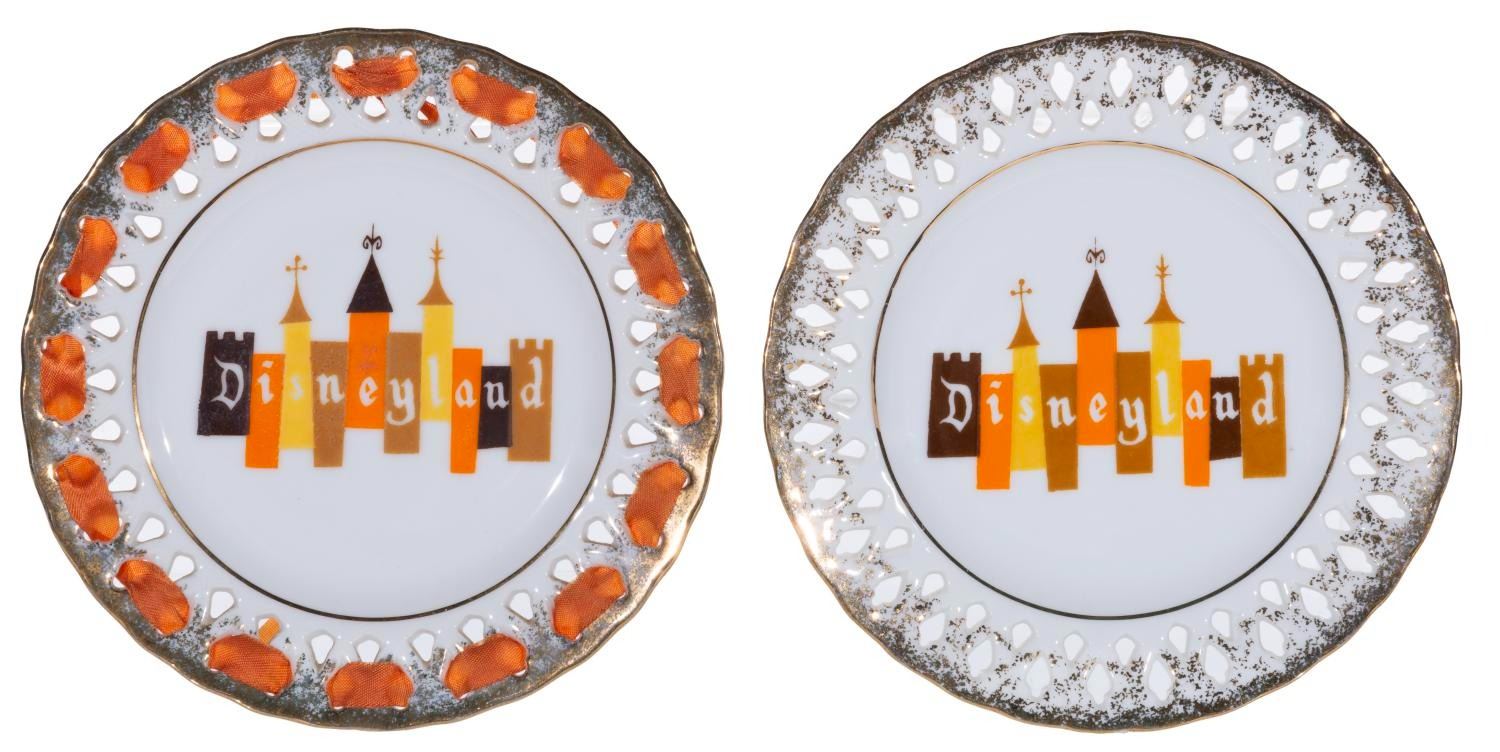 (Disneyland, 1960s) A pair of Disneyland lace-edged plates featuring a castle-themed marquee with gold-tone accents. One plate has a ribbon and the other has a cord on its back for mounting. Measuring 6.25" in diameter, each ceramic plate is in very good condition, exhibiting minor wear.
