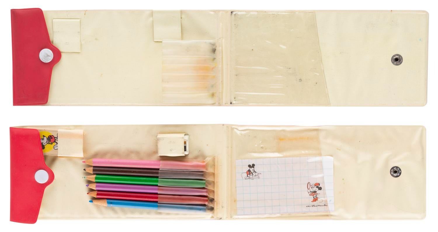(Disneyland, 1960s) A pair of vinyl souvenir of Disneyland pencil cases featuring Mickey Mouse. Once case includes six pencil crayons, a pencil sharpener, a Mickey eraser, and a single piece of notepaper. Measuring 3.5" x 7.5" each, the empty case is in fair condition with a smudge to the front image, and writing and marks on the inside. The set with pencils is in very good condition with light wear from use.