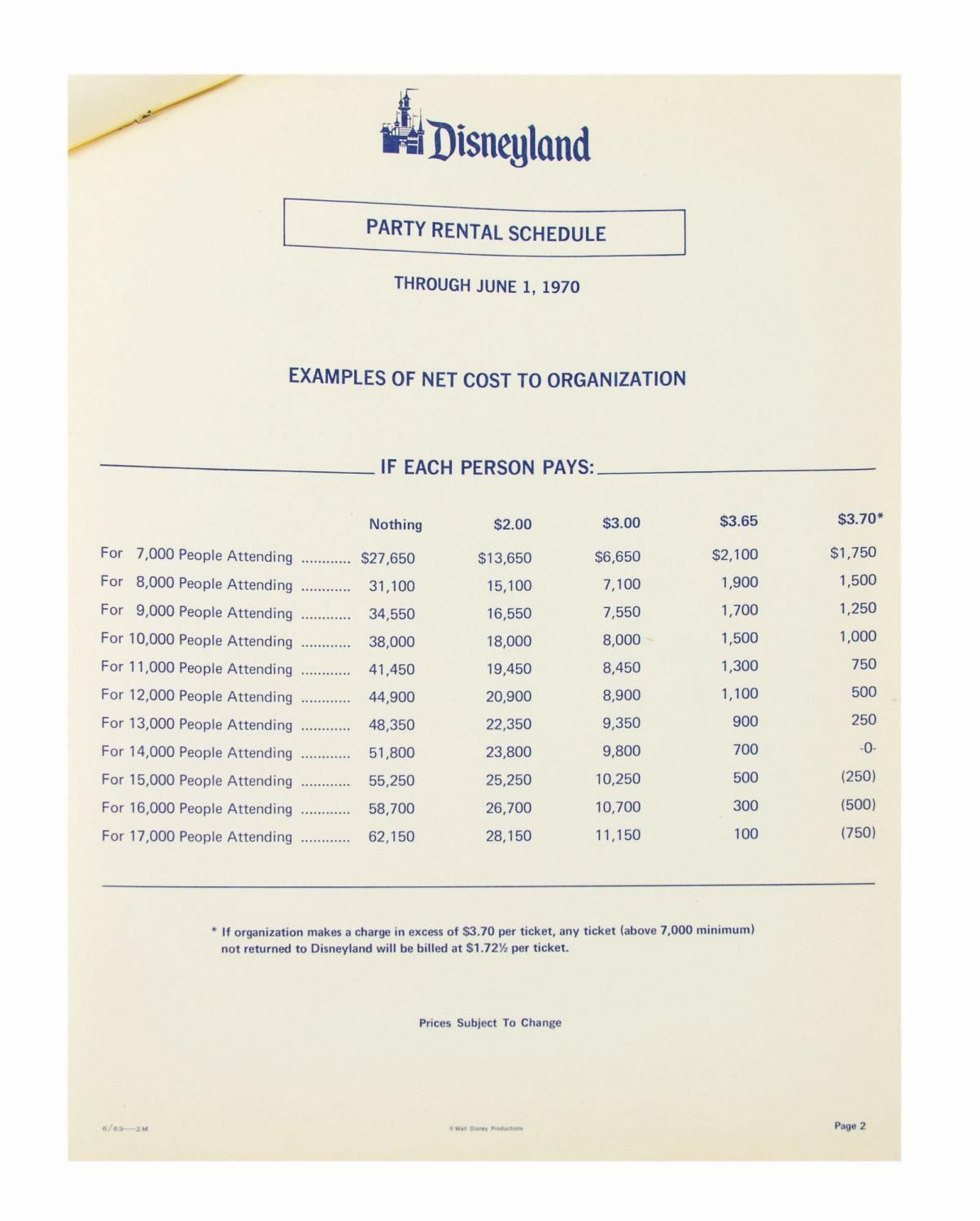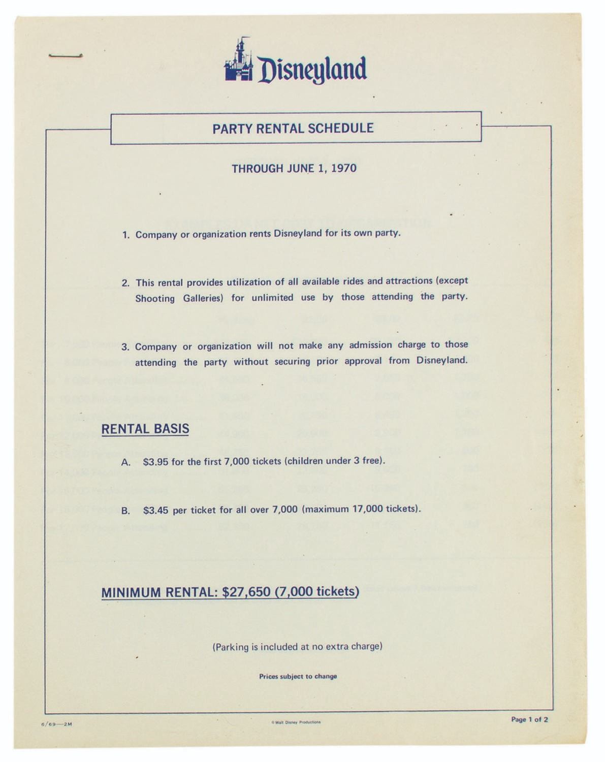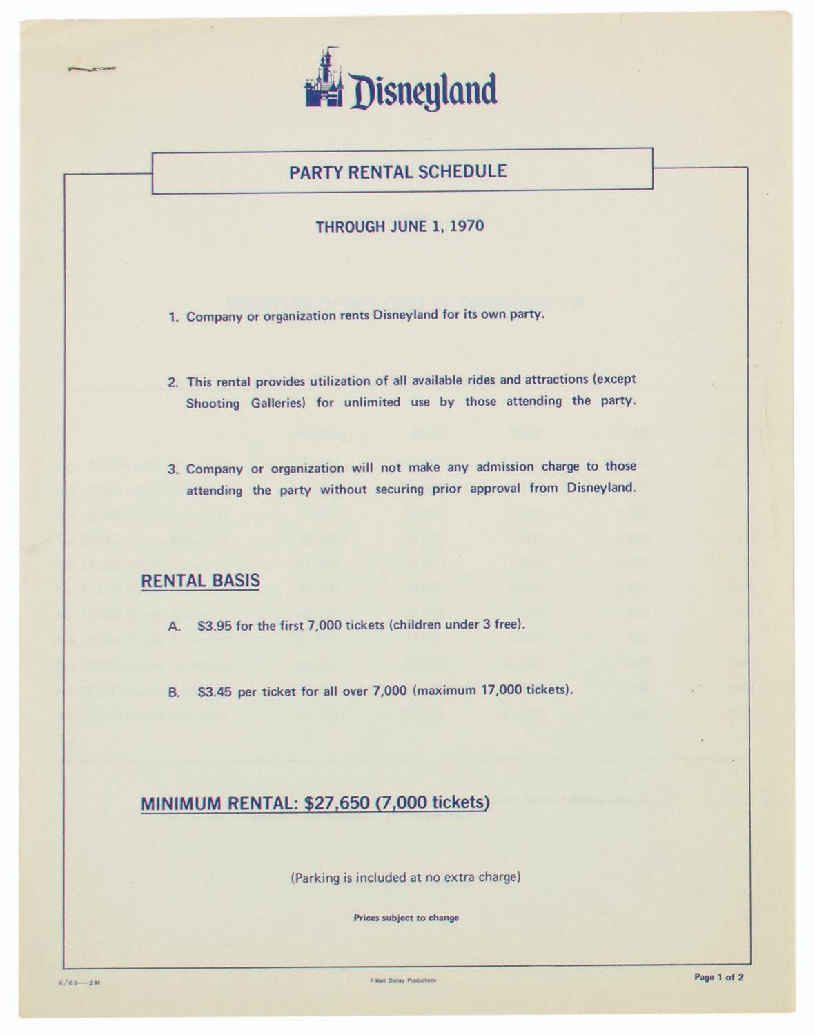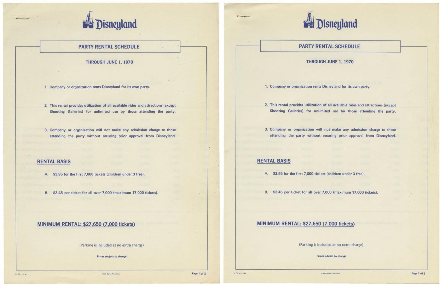 (Disneyland, 1970) A Pair of 1970 Disneyland Private Party Prices and Schedules outlining the cost of private parties at Disneyland. Measuring 8.5"x11", this pair of two-page documents is in very good condition with yellowing, faint creases, and wear.