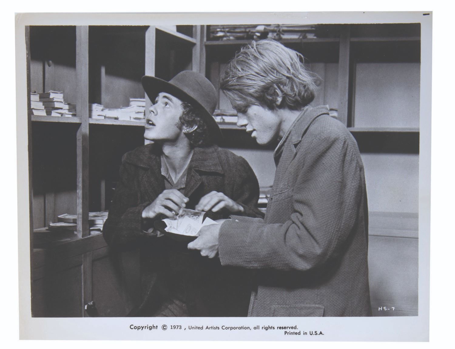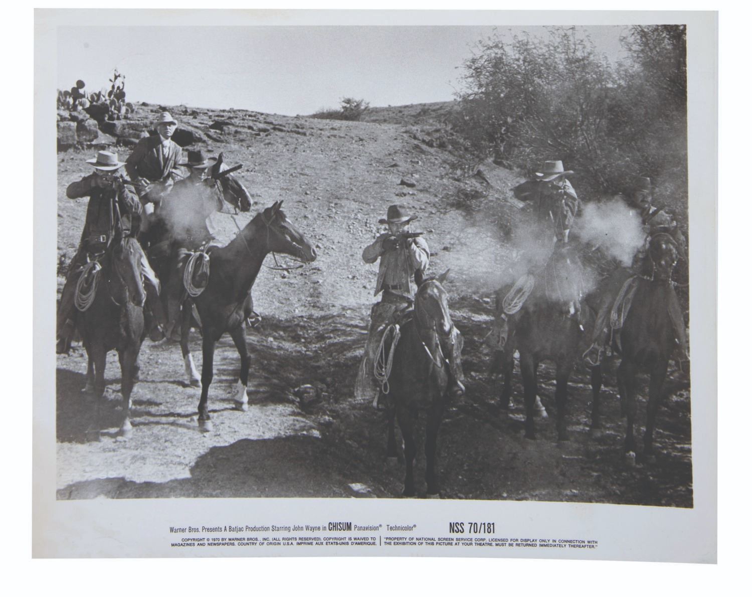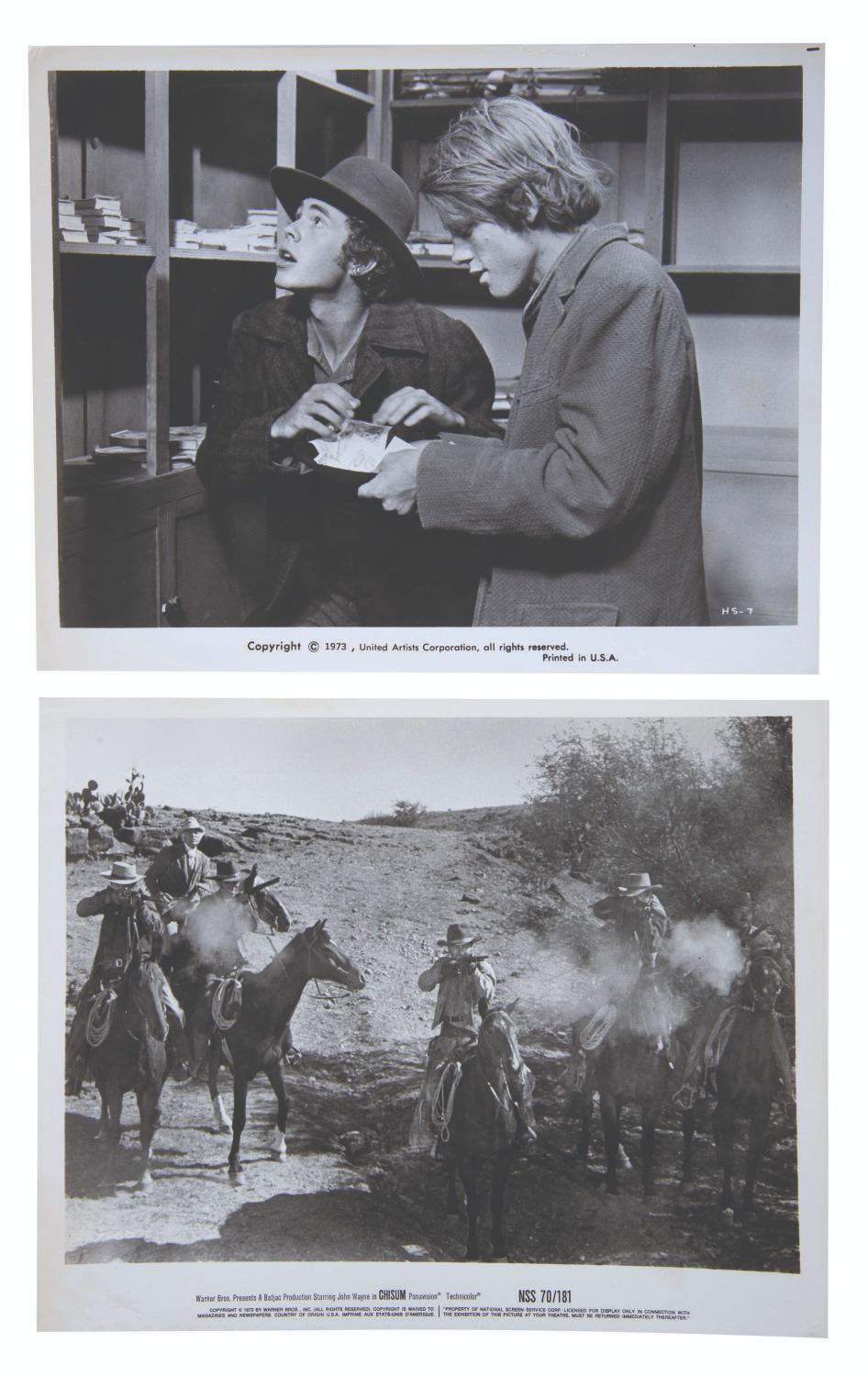 (Warner Bros./United Artists, 1970-1974) A pair of publicity photos from 1970's western movies. Included in the lot are a print from John Wayne's 1970 film Chisum, and a print from the 1974 film The Spikes Gang, featuring Ron Howard. each measuring 8"x10", the photos are in good condition, with light wear from handling and small creases to the top border of the Spikes Gang photo.