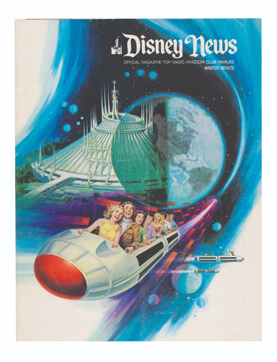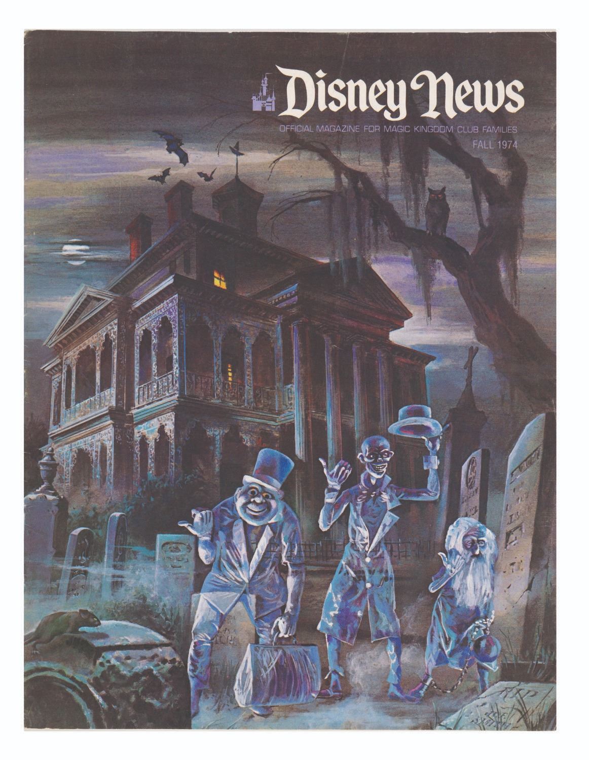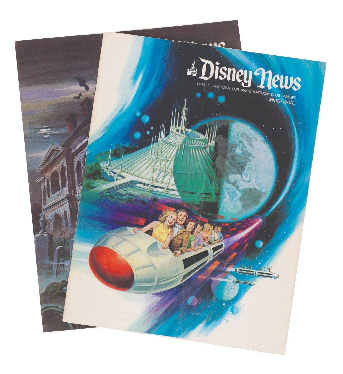 (Disney, 1974/75) A pair of Disney News magazines, dated Fall 1974 and Winter 1974/75. These issues of the Official Magazine for Magic Kingdom Families feature cover stories on The Haunted Mansion and Space Mountain. Measuring 8.5" x 11", the magazines are in very good condition with typical light wear.