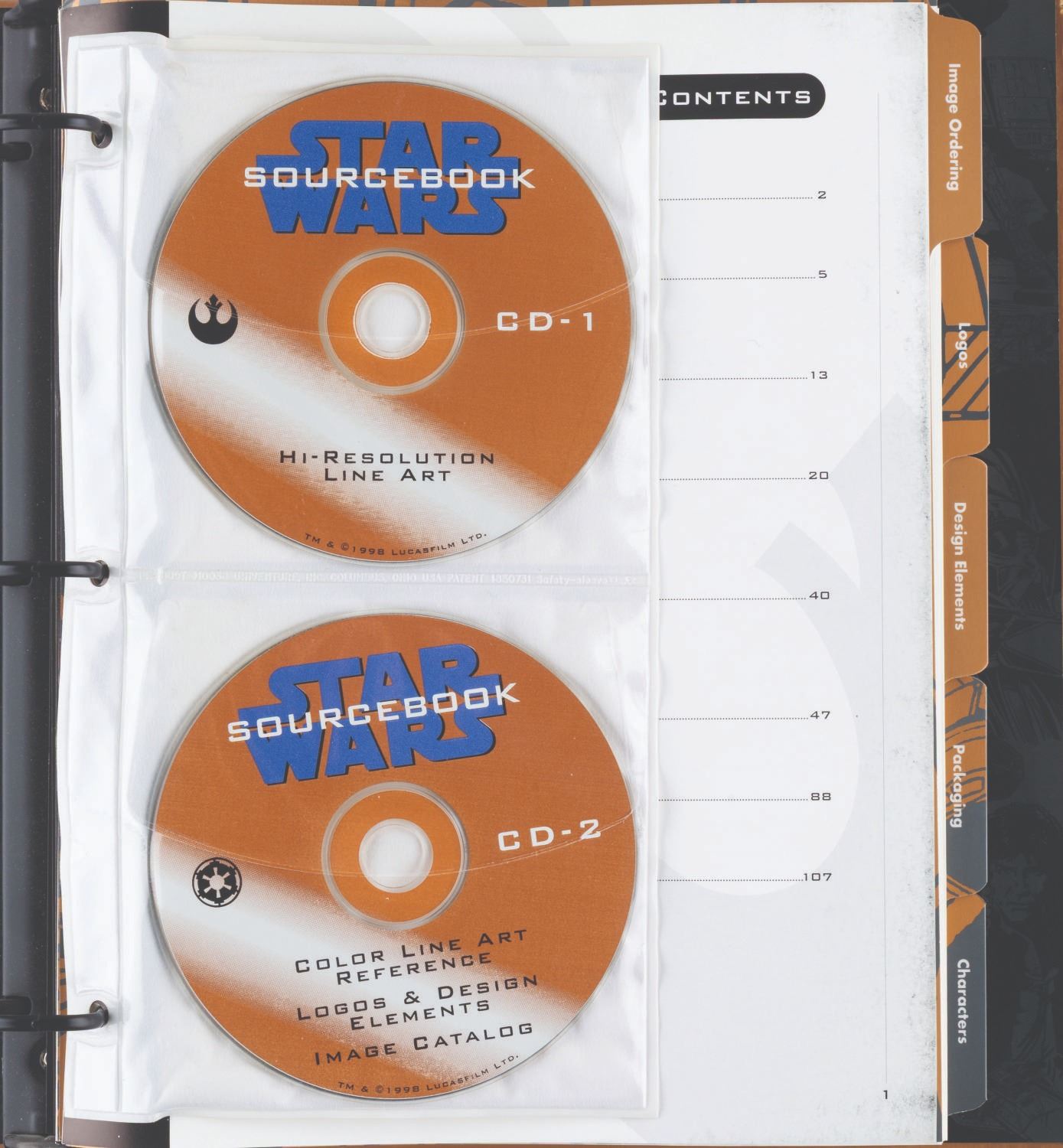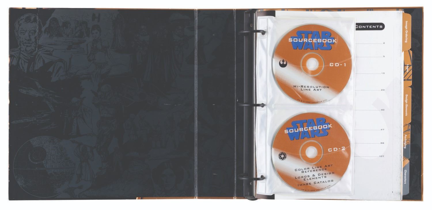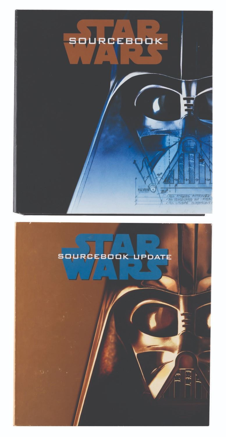 (Lucasfilm, 1998) Two Star Wars Sourcebooks, released by Lucasfilm in 1996 and 1998, with line art, logos, and guidelines for licensees to develop Star Wars merchandise. The 1996 Star Wars Sourcebook contains 206 pages of assets towards celebrating the 20th anniversary of the franchise in 1997. The Star Wars Sourcebook Update from 1998 includes two CD-Roms with digital files of the artwork, and 127 pages that include new logos for the Trilogy Special Edition Home Video releases. Each measuring 11" x 11.75" x 2.5" and 3.5", the guides are in very good condition overall, with interior pages in near-fine condition, and the covers with typical scuffs and edge wear from production use.