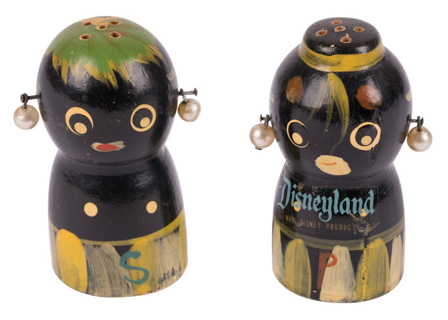 (Disneyland, 1960s) A salt and pepper shaker set sold in Disneyland's Adventureland. Measuring 2.5" tall, the hand-painted wooden shakers display in very good condition with some paint wear from use, scuffs, and retain their original cork stoppers and "earrings."
