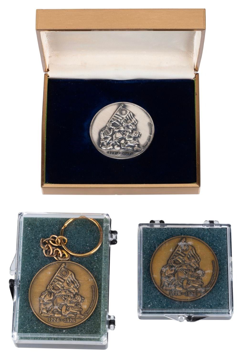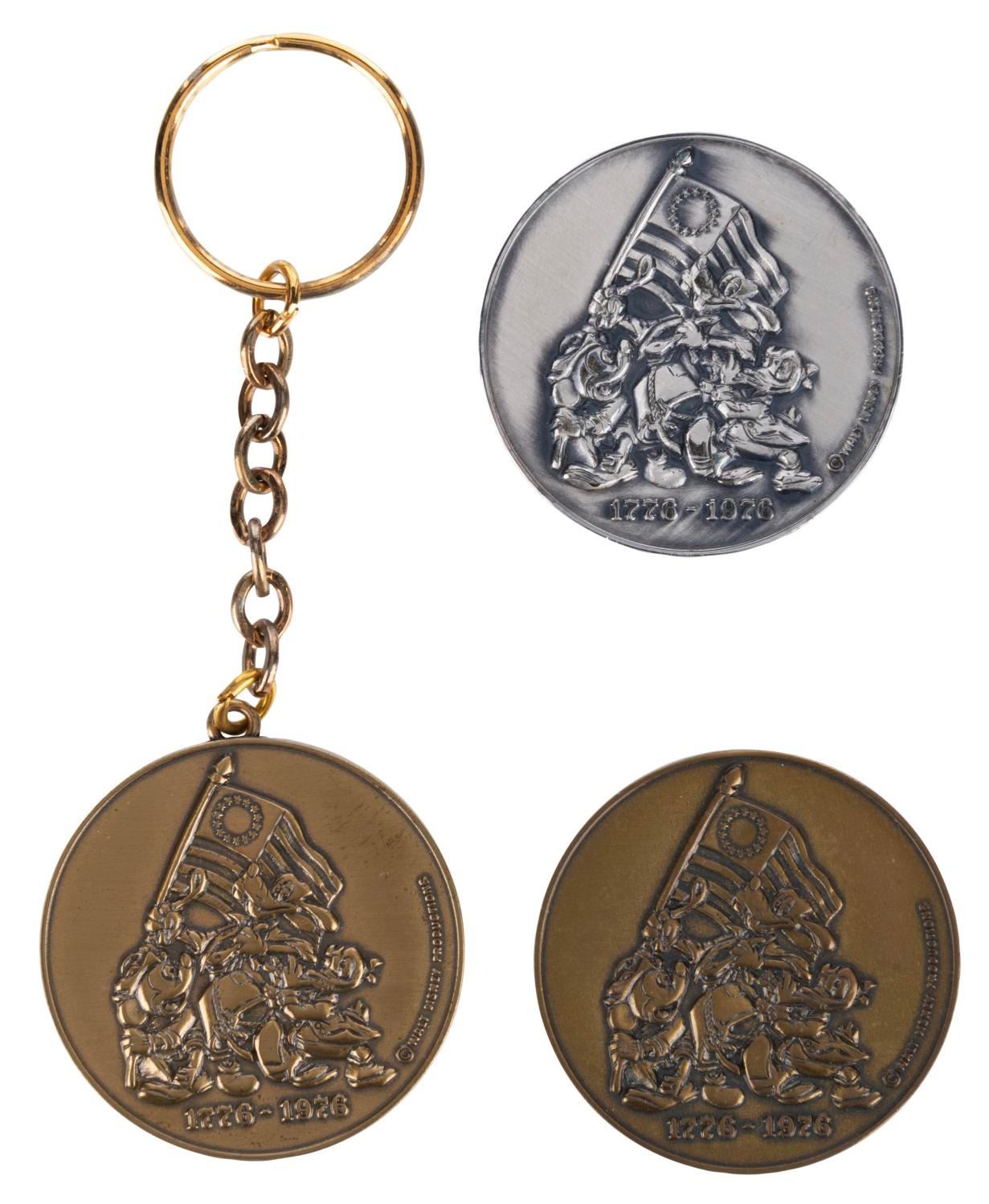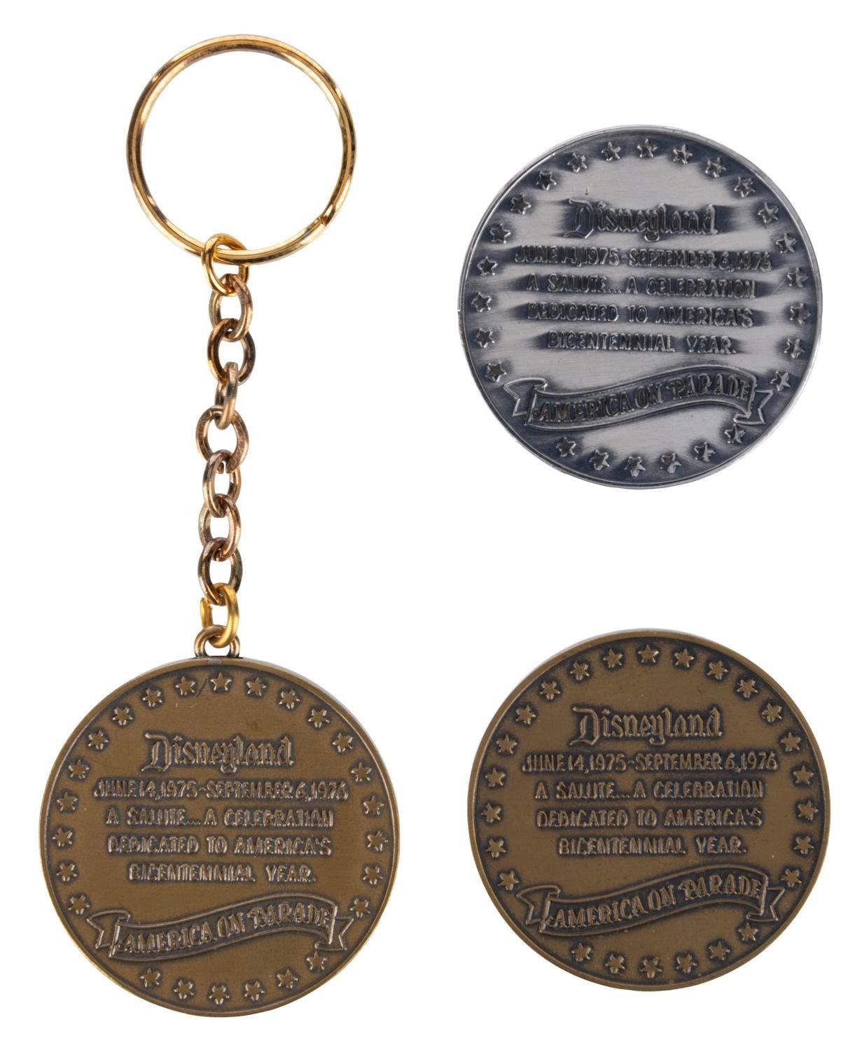 (Disneyland, 1975-76) A pair of souvenir medallions and a keychain from Disneyland's bicentennial celebration "America on Parade." Measuring 1.5" in diameter each, in cases measuring 3"x3.5" and 1" thick, the souvenirs are in very good condition with minimal wear to the coins surface.