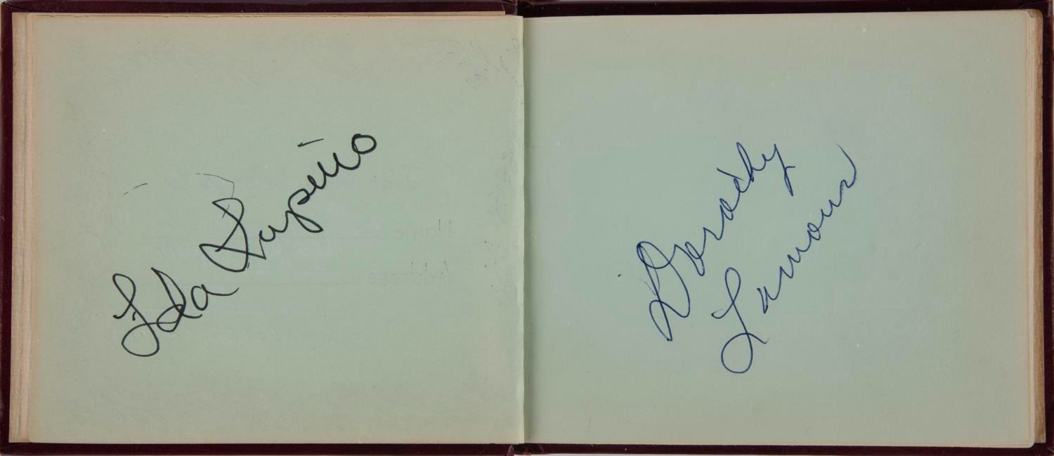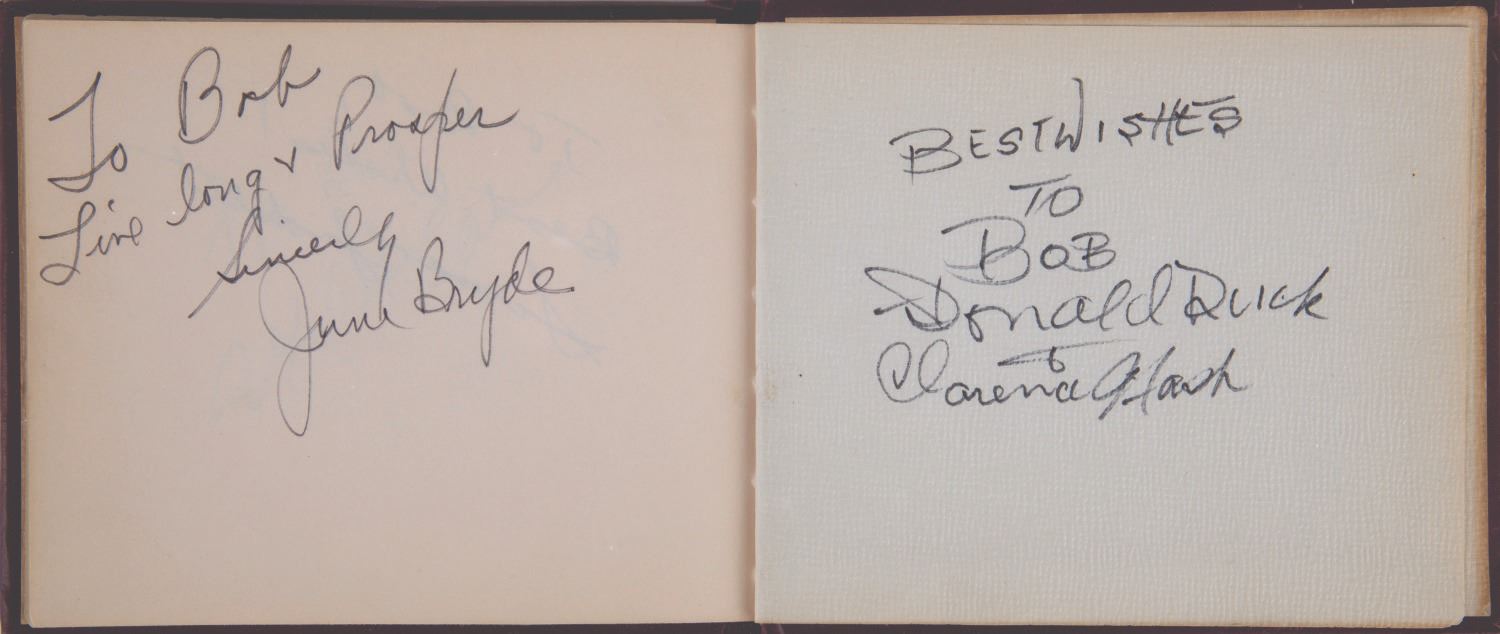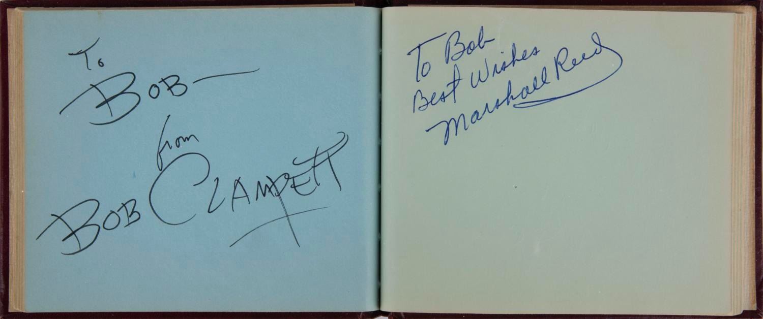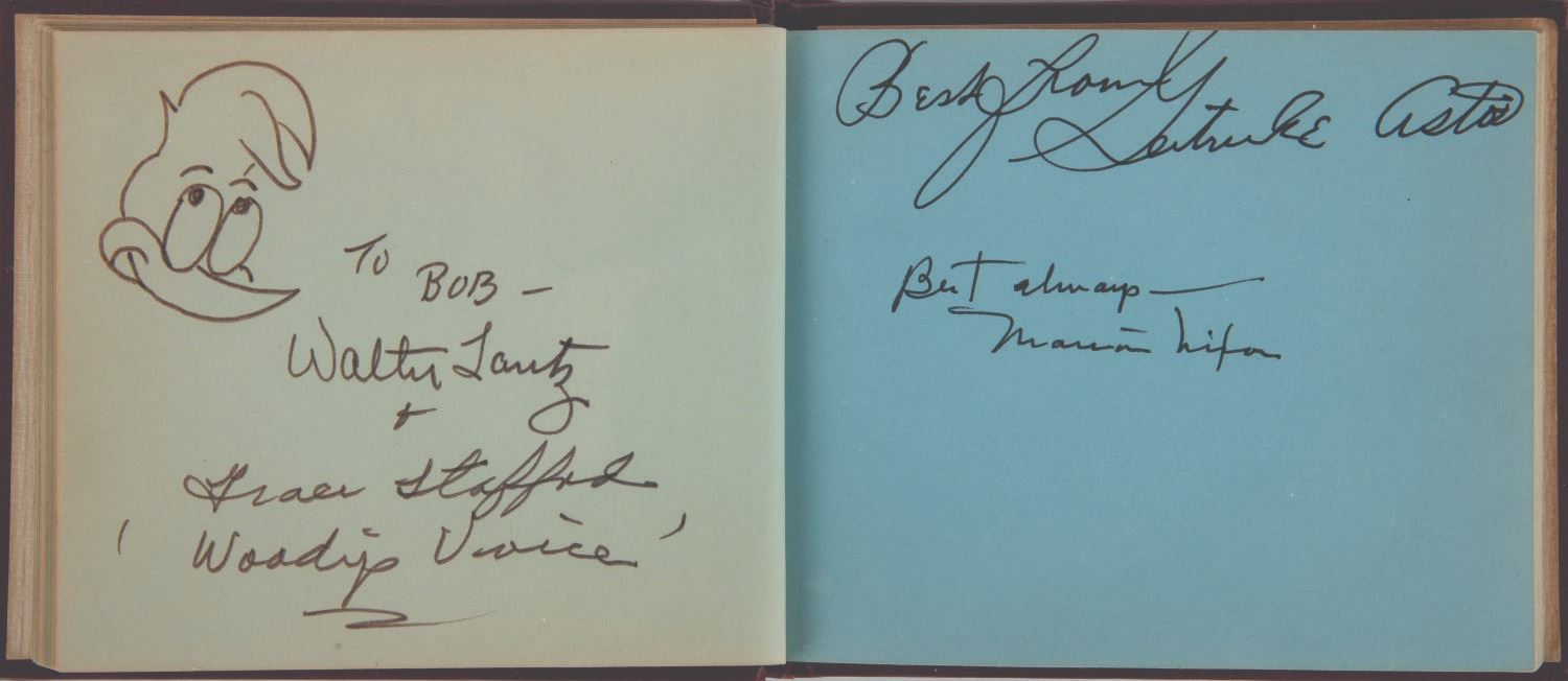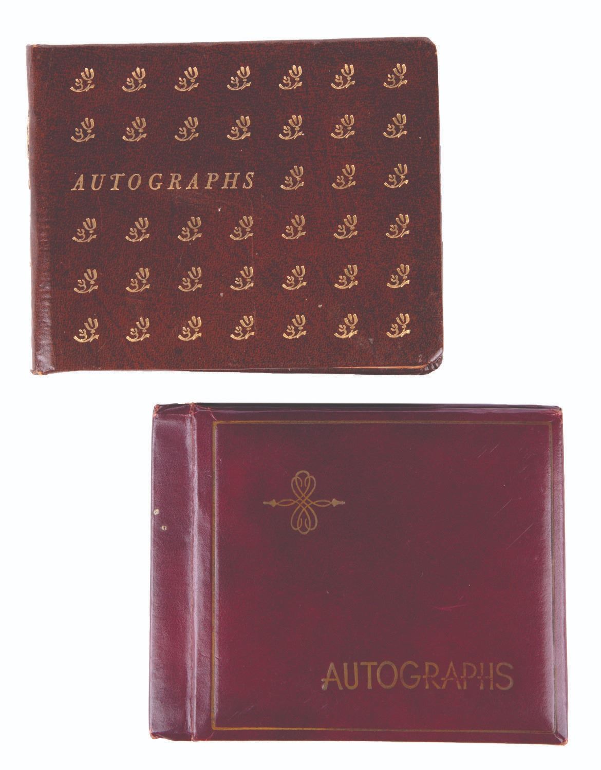 (1970's) A pair of autograph books containing over (90) signatures from actors and artists of the day. The autographs include an early Mark Hamill (Luke Skywalker), Christopher Lee (Dracula & later Star Wars), Walter Lantz (Woody Woodpecker), and Clarence Nash (the voice of Donald Duck. The rest cover film and TV actors ranging from Mitzi Gaynor to Forrest Tucker to Grace Lee Whitney. Each album measures 5"x6", with both in very good condition showing typical wear from age and handling.