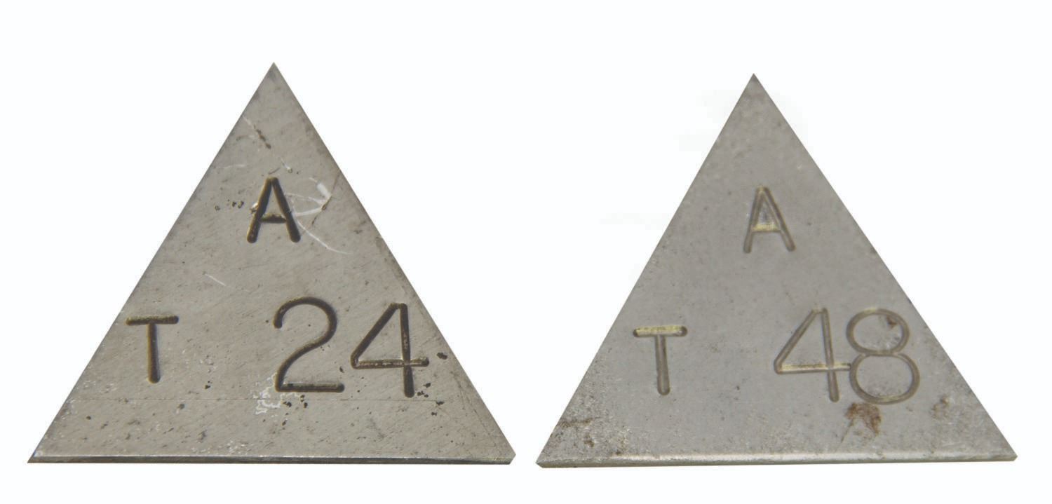 (Disneyland, c.1980s) A pair of small, galvanized metal track markers used on Autopia at Disneyland. The triangular markers were manufactured in the Sheet Metal Department of the Backstage Cycling Shop, and used to designate specific points along the Autopia track. The markers reading "A T 24" and "A T 48" were retained by a Cast Member after removal from service. An unusual and seldom seen part of Disneyland history, the triangular markers measure 2"x2" and are in very good Park-used condition.