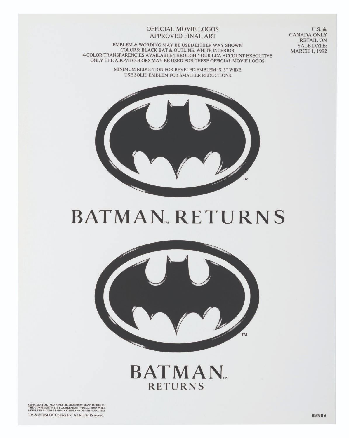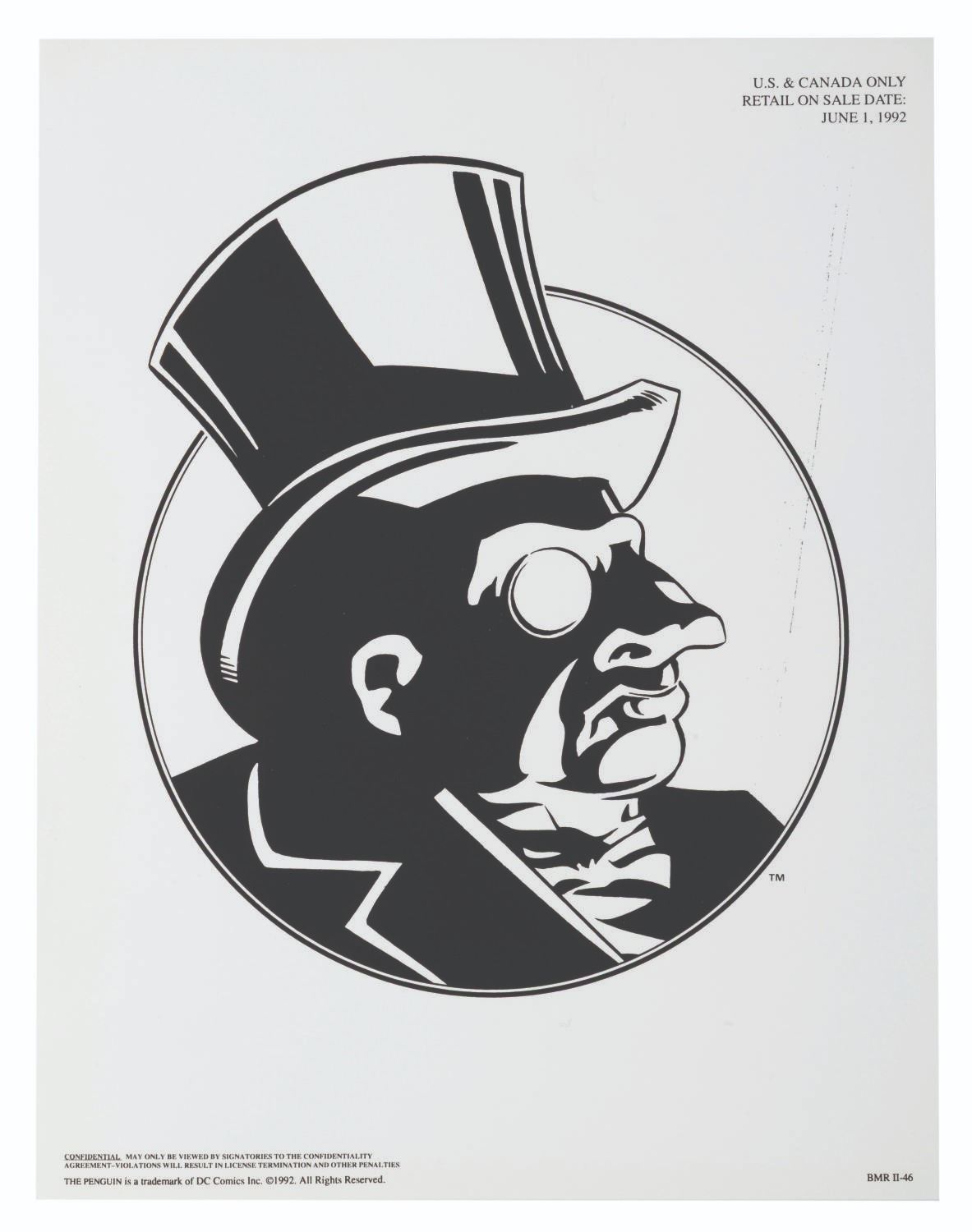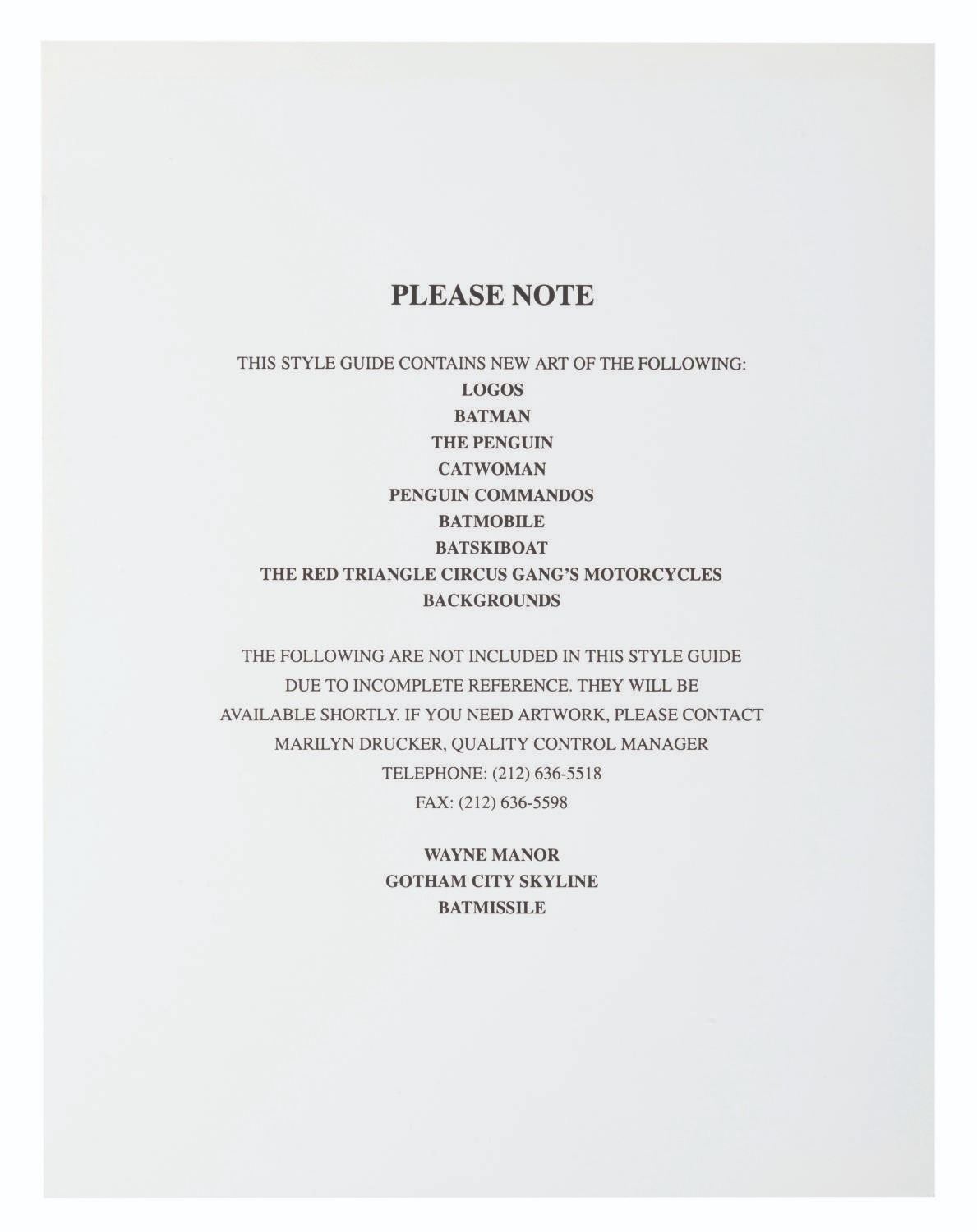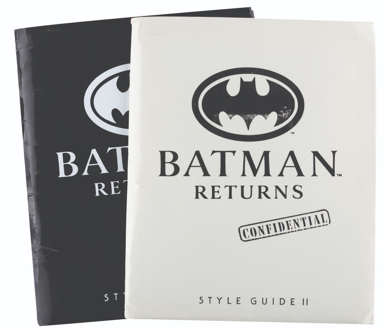 (Warner Bros.) A pair of style guides for the 1992 film"Batman Returns," sent to licensees and Warner product departments to develop merchandise and promotional materials for the film. Style Guide 1 includes a cover letter on DC letterhead, and 55 loose pages of character art, logos, props, and backgrounds for the film. Style Guide 2 with 105 loose pages provides more artwork including Penguin Commandos, Circus Gang Motorcycles, and Gotham City skylines and backgrounds. Together these provide fascinating insight into the marketing of the film. Each in a folder measuring 9.75" x 11.75", the style guides are in very good condition with typical wear from production use, mostly from creases and scuffs to the outer folders.