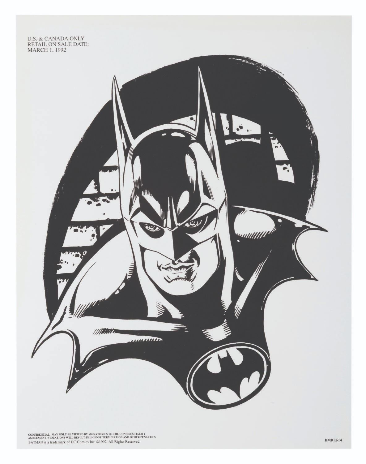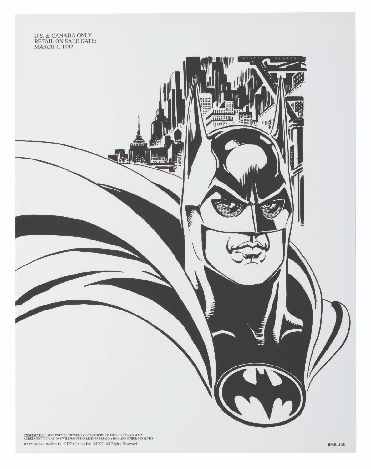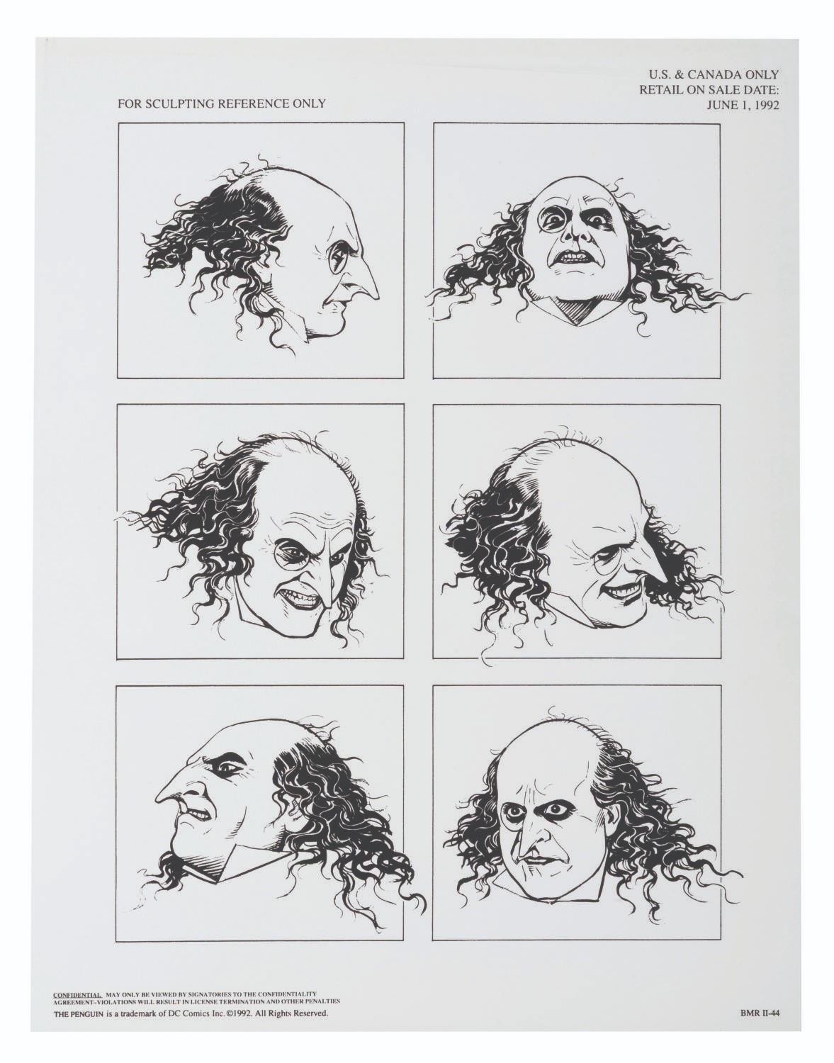 (Warner Bros.) A pair of style guides for the 1992 film"Batman Returns," sent to licensees and Warner product departments to develop merchandise and promotional materials for the film. Style Guide 1 includes a cover letter on DC letterhead, and 55 loose pages of character art, logos, props, and backgrounds for the film. Style Guide 2 with 105 loose pages provides more artwork including Penguin Commandos, Circus Gang Motorcycles, and Gotham City skylines and backgrounds. Together these provide fascinating insight into the marketing of the film. Each in a folder measuring 9.75" x 11.75", the style guides are in very good condition with typical wear from production use, mostly from creases and scuffs to the outer folders.