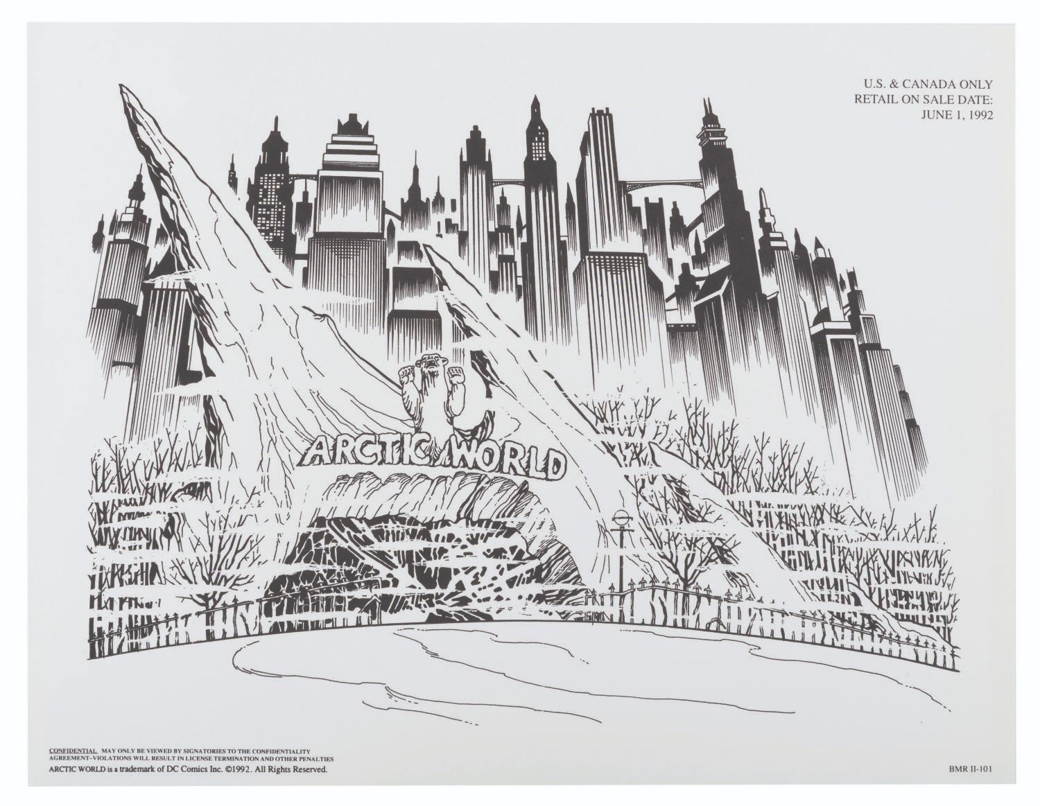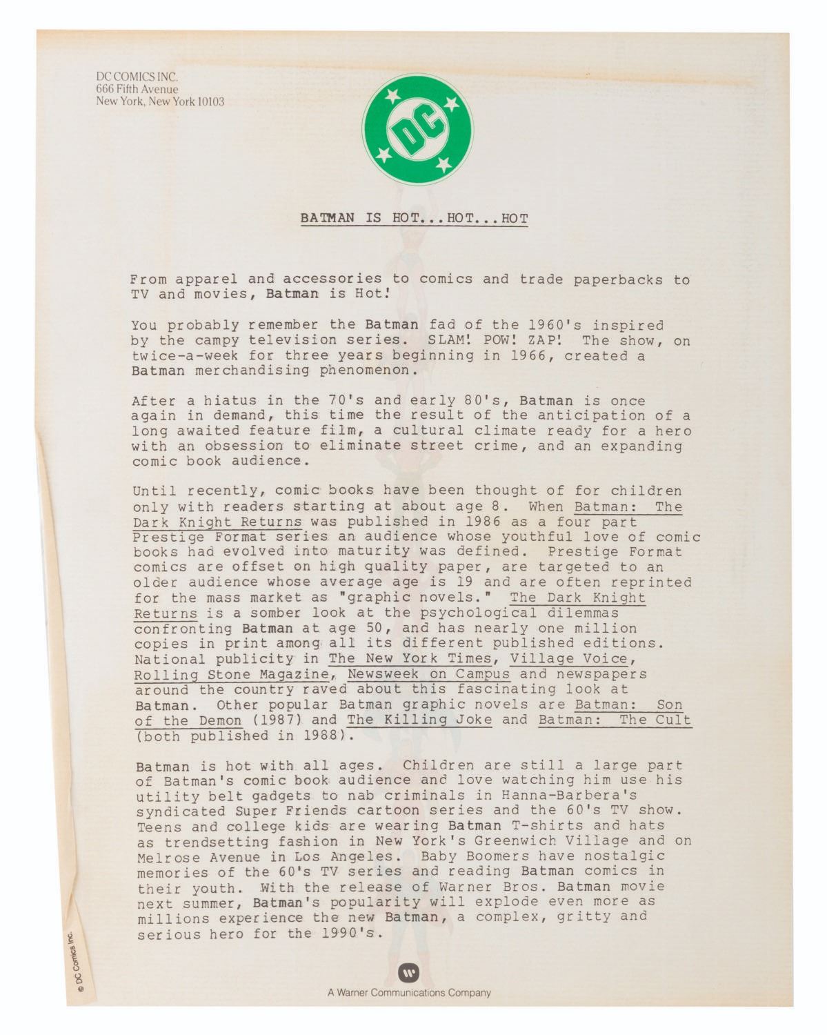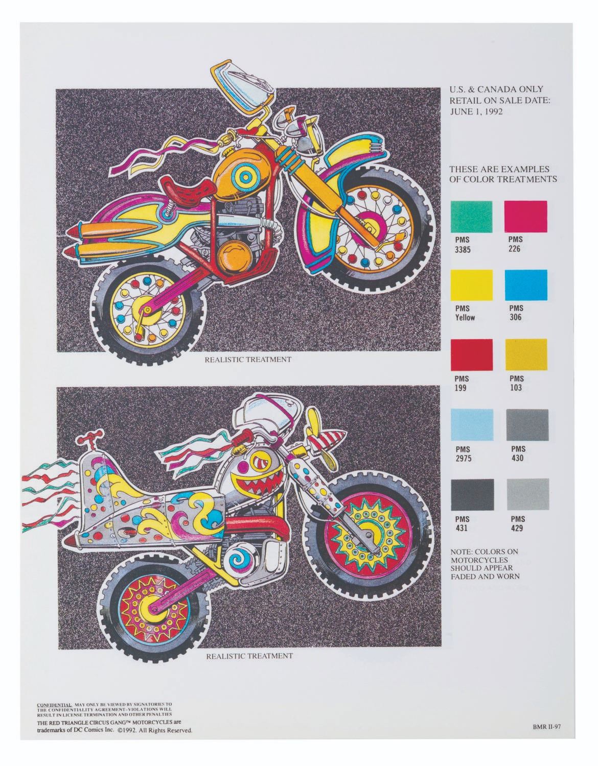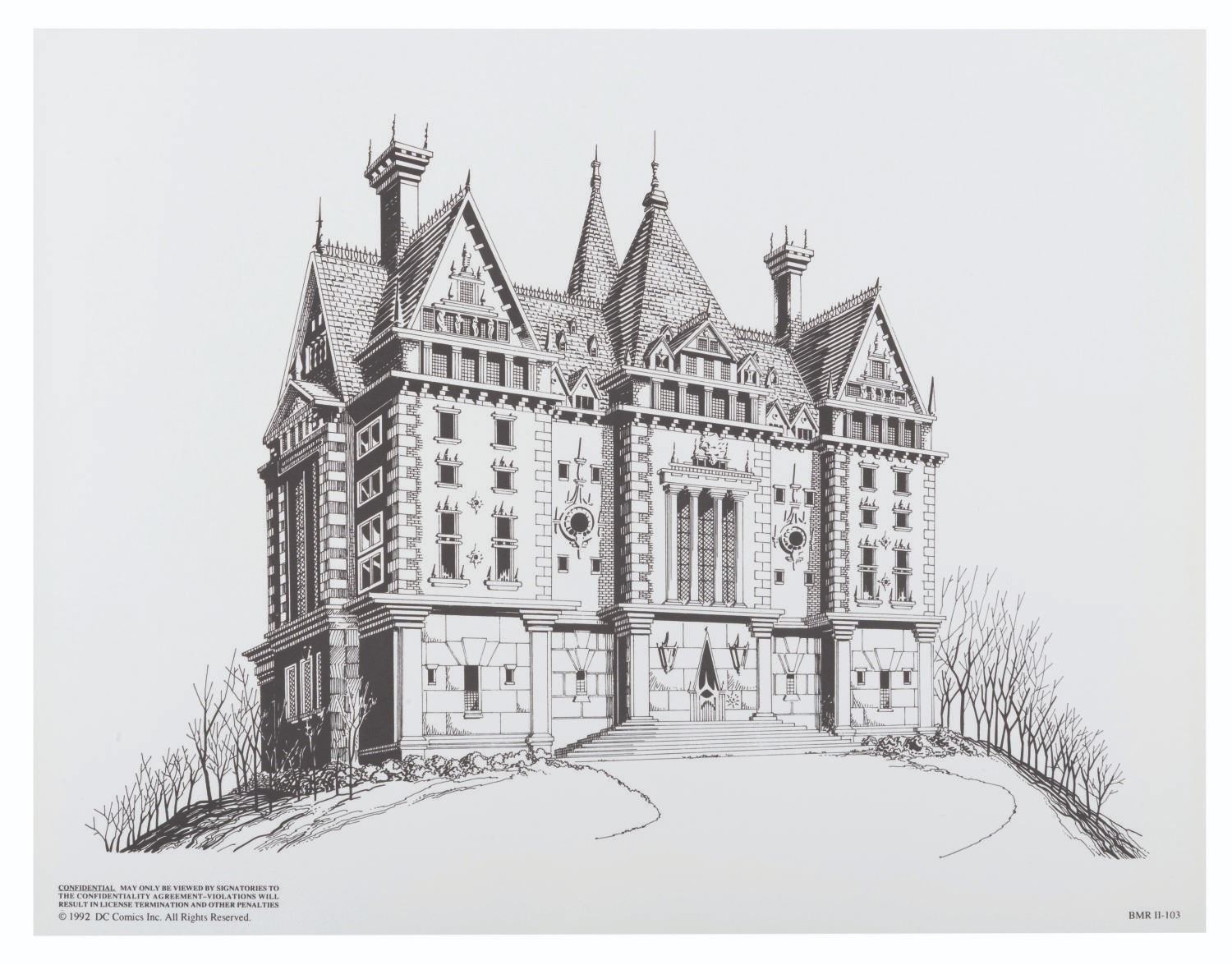 (Warner Bros.) A pair of style guides for the 1992 film"Batman Returns," sent to licensees and Warner product departments to develop merchandise and promotional materials for the film. Style Guide 1 includes a cover letter on DC letterhead, and 55 loose pages of character art, logos, props, and backgrounds for the film. Style Guide 2 with 105 loose pages provides more artwork including Penguin Commandos, Circus Gang Motorcycles, and Gotham City skylines and backgrounds. Together these provide fascinating insight into the marketing of the film. Each in a folder measuring 9.75" x 11.75", the style guides are in very good condition with typical wear from production use, mostly from creases and scuffs to the outer folders.