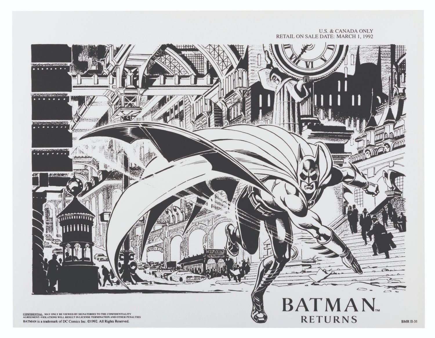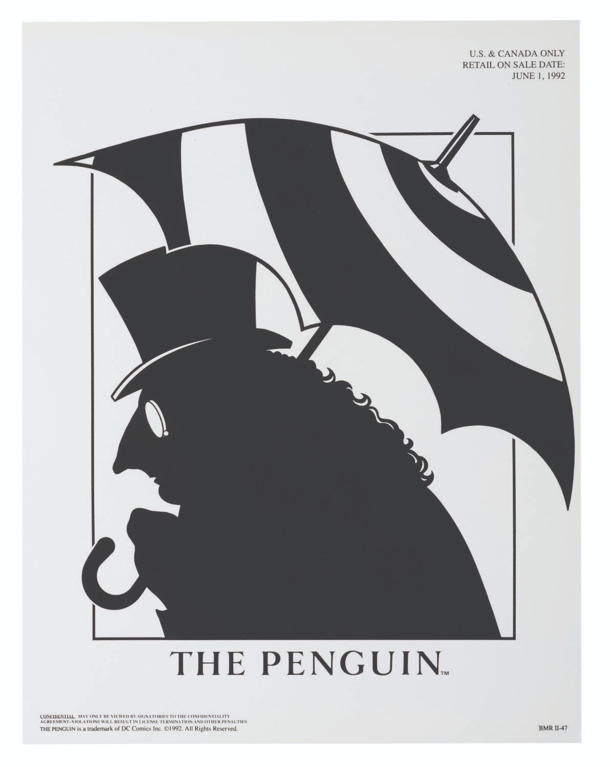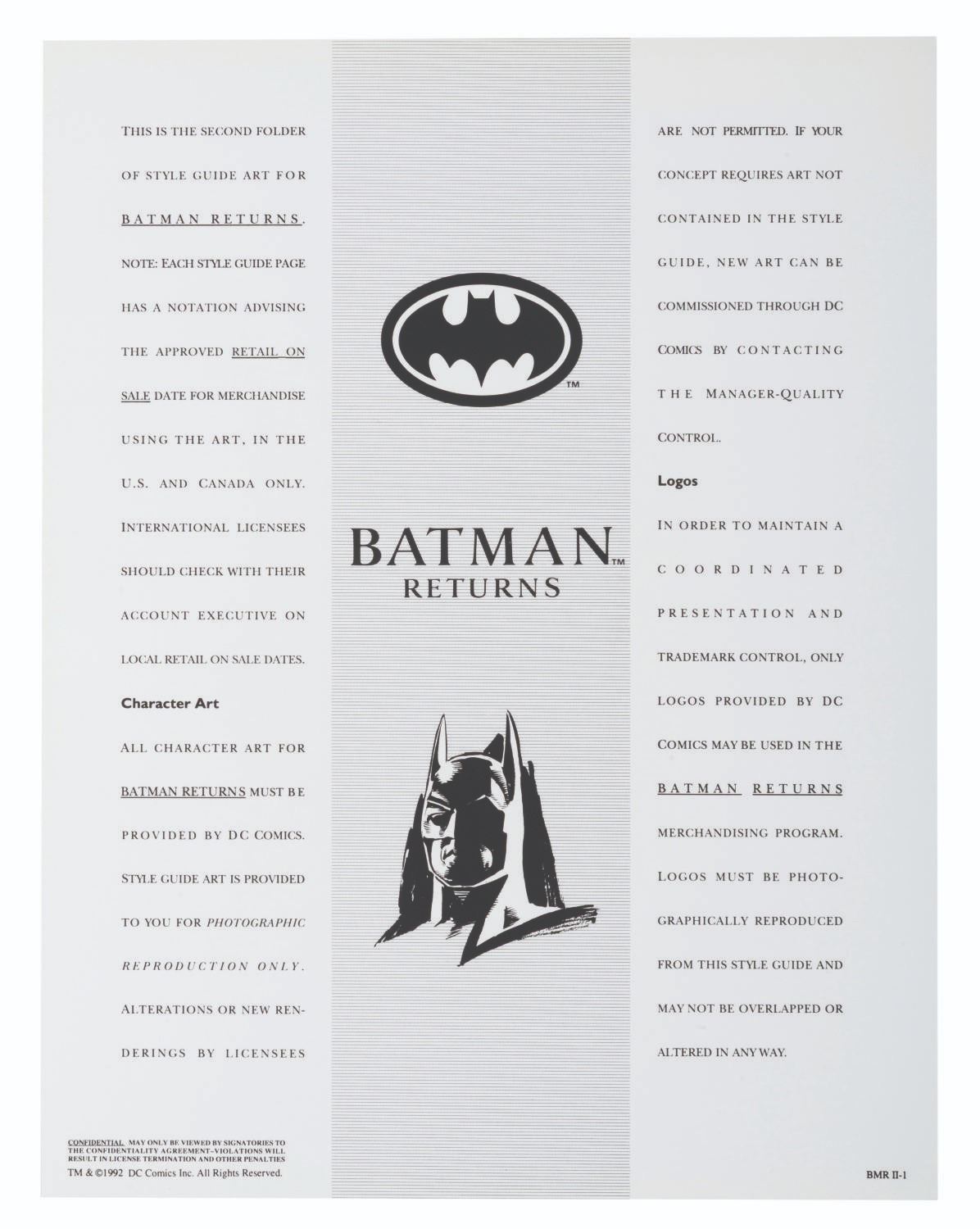 (Warner Bros., 1990s) A pair of style guides for the 1992 film "Batman Returns, " sent to licensees and Warner product departments to develop merchandise and promotional materials for the film. Style Guide 1 includes a cover letter on DC letterhead, and 55 loose pages of character art, logos, props, and backgrounds for the film. Style Guide 2 with 105 loose pages provides more artwork including Penguin Commandos, Circus Gang Motorcycles, and Gotham City skylines and backgrounds. Together these provide fascinating insight into the marketing of the film. Each in a folder measuring 9.75 " x 11.75 ", the style guides are in very good condition with typical wear from production use, mostly from creases and scuffs to the outer folders.