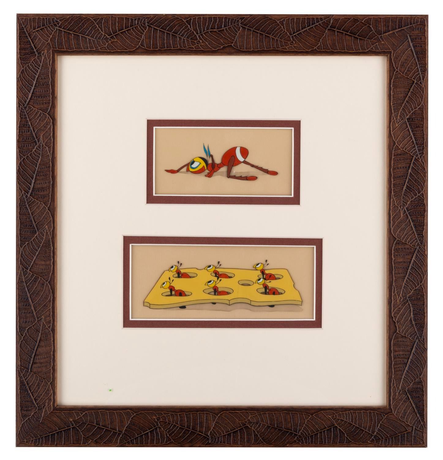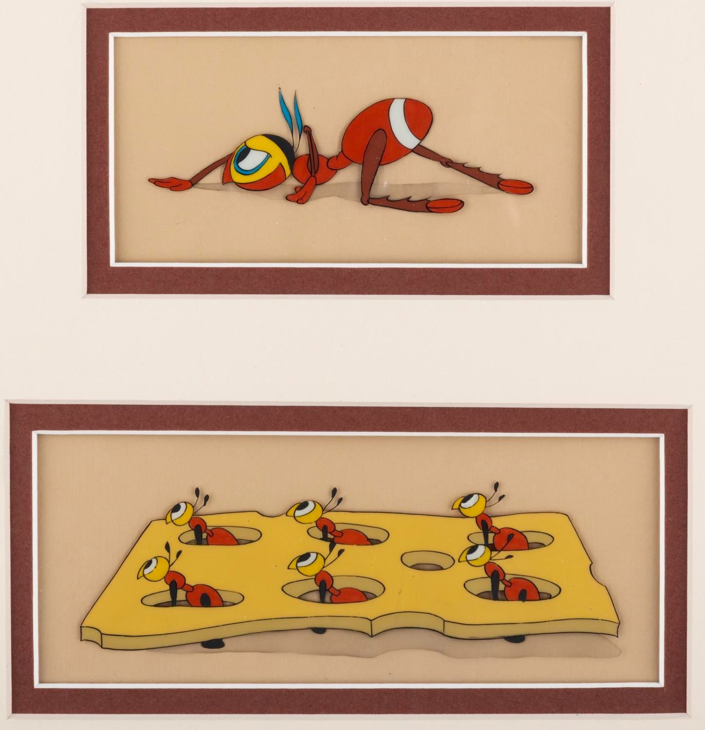 (Disney, 1939) A pair of cels of ants from the Donald Duck cartoon "Beach Picnic." The trimmed cels have a visible area of 2.25" x 4.5" and 2.5" x 6" with image sizes of 1.25" x 3.75" and 1.75" x 5.25" in a 13.5" x 14" frame. The cels and frame are in very good condition with light wear from age.