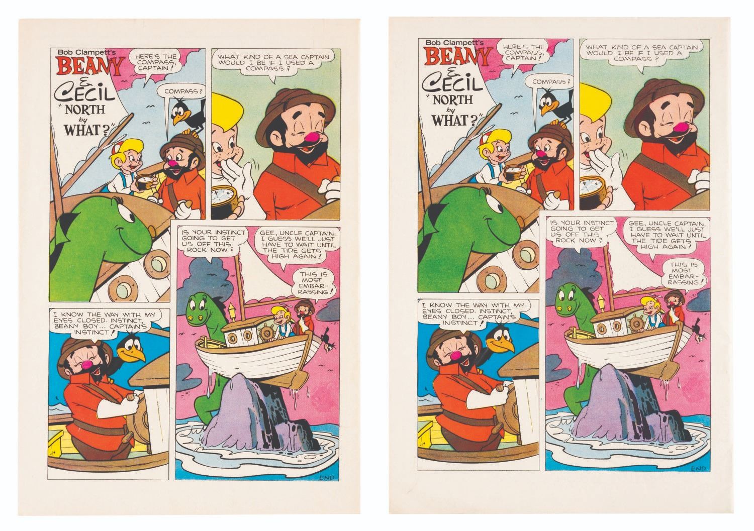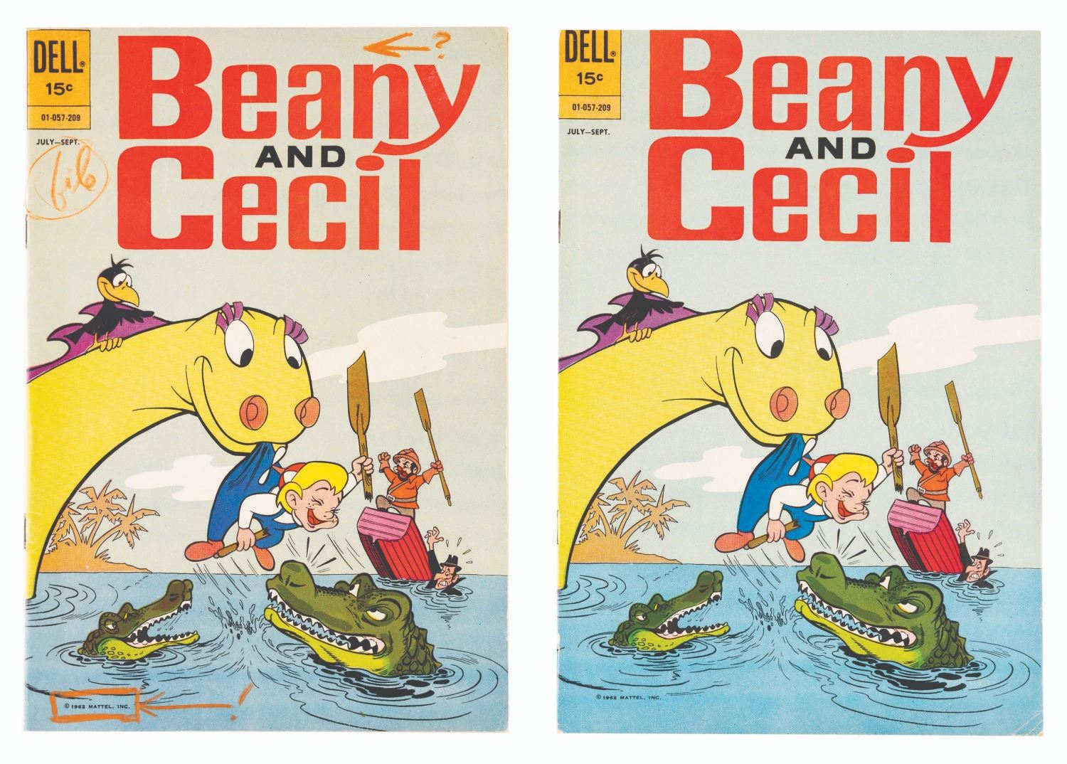 (Dell, 1962) Two copies of the first issue of the Beany and Cecil Comics 1962 run by Dell Comics. One is labeled “file copy” with orange grease pencil, and includes some editorial markups on the cover as well. Measuring 7” x 10.25” each, the comics are in good and very good condition, with typical light handling wear mainly to the edges.